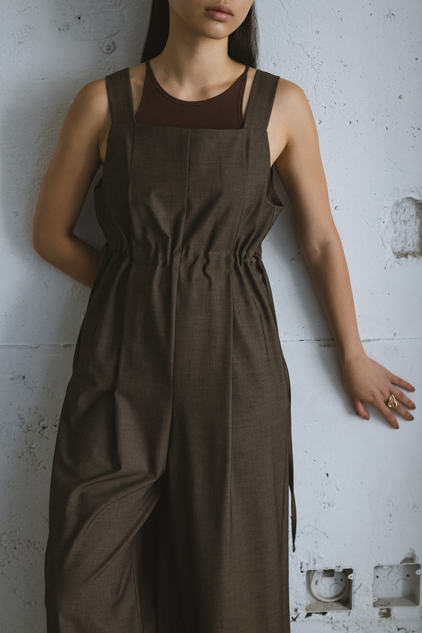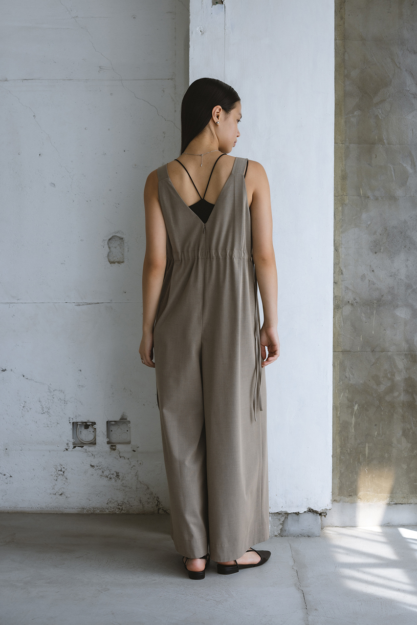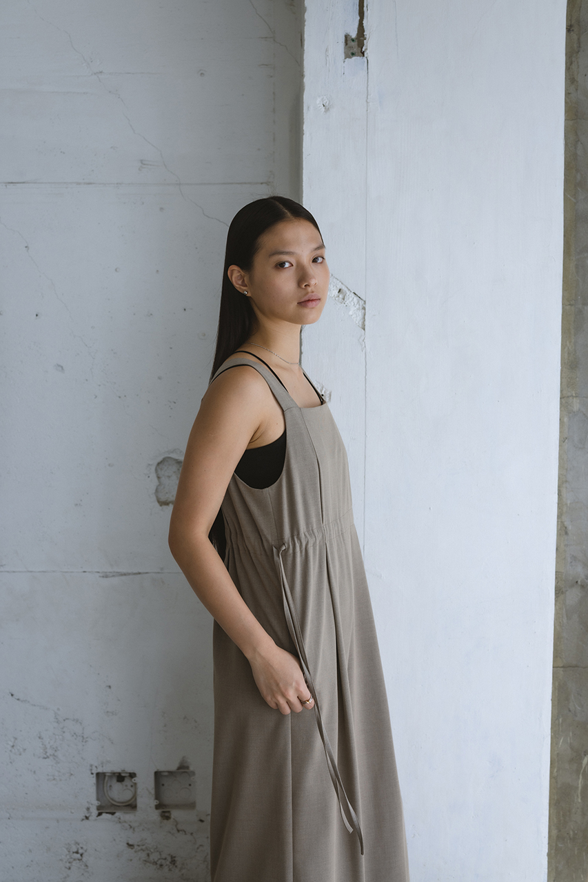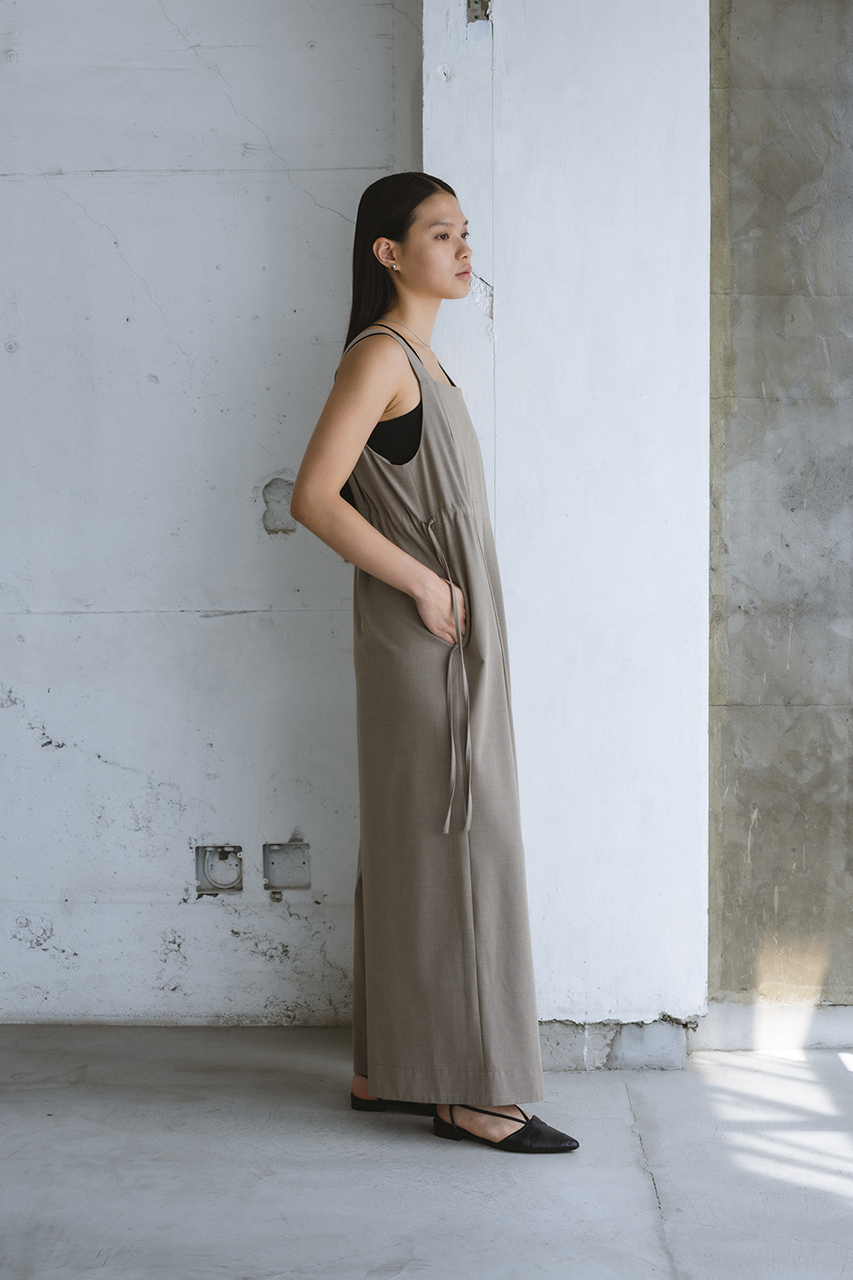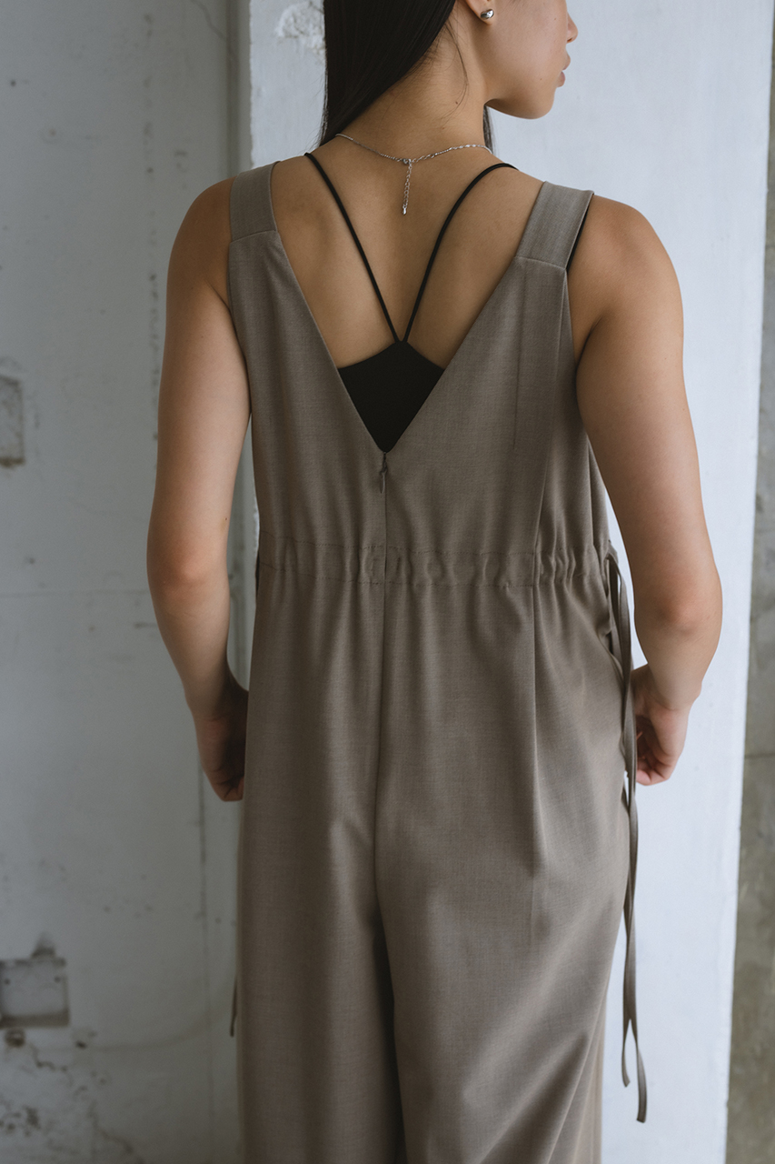 ゆったりルーズなサイジングのワイドロンパース。ウエストドロストを絞ったり、垂らしたりとシルエット変化を楽しめます。高見えするドライタッチな素材を使用。インナー次第でロングシーズン着用頂けます。透け感なし、ストレッチややあり。