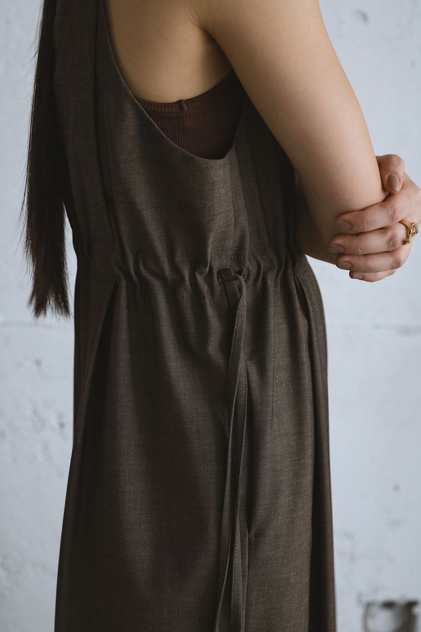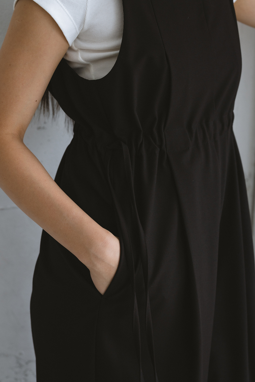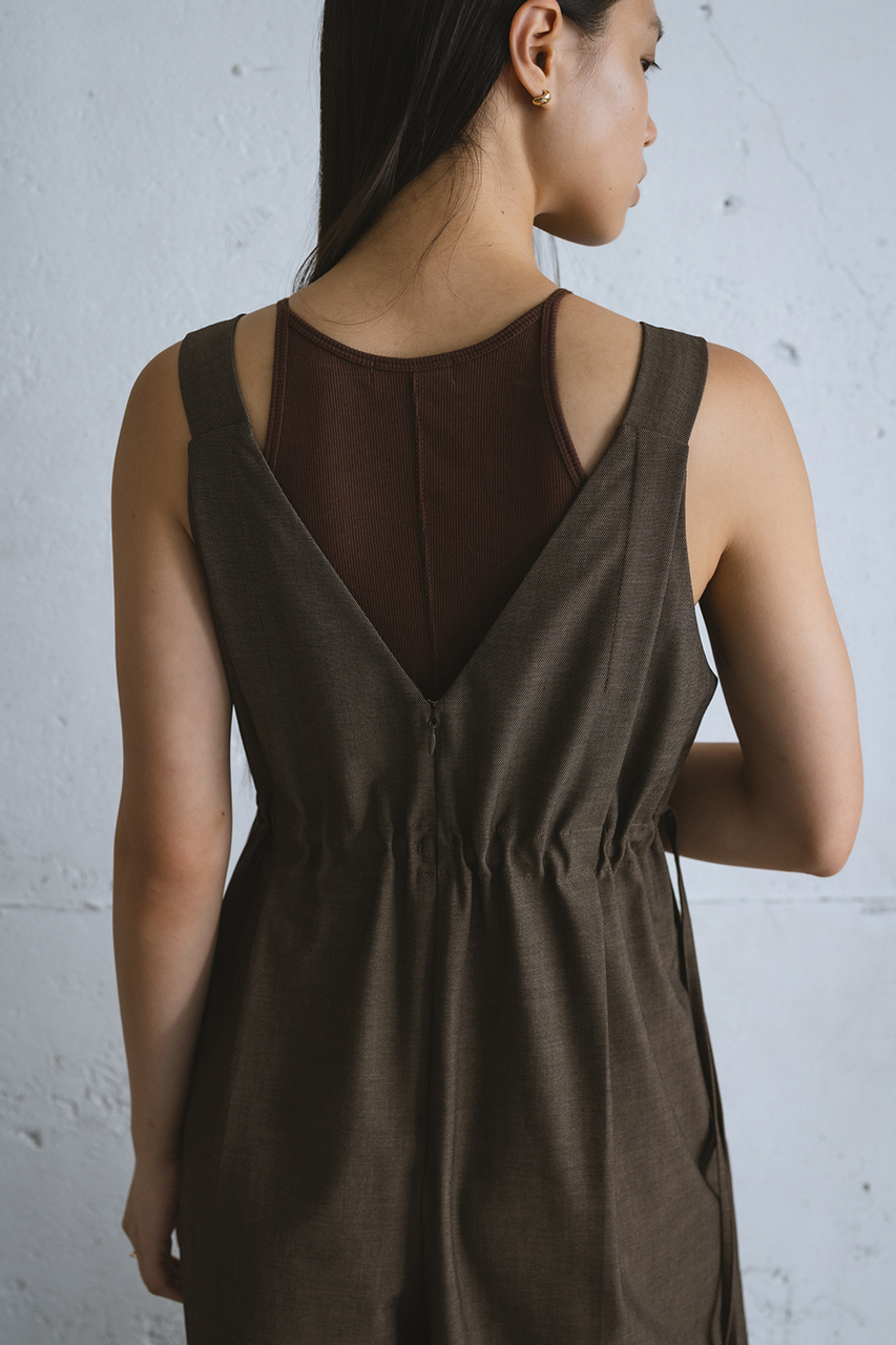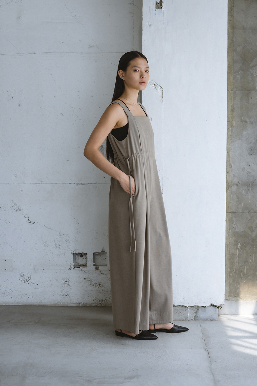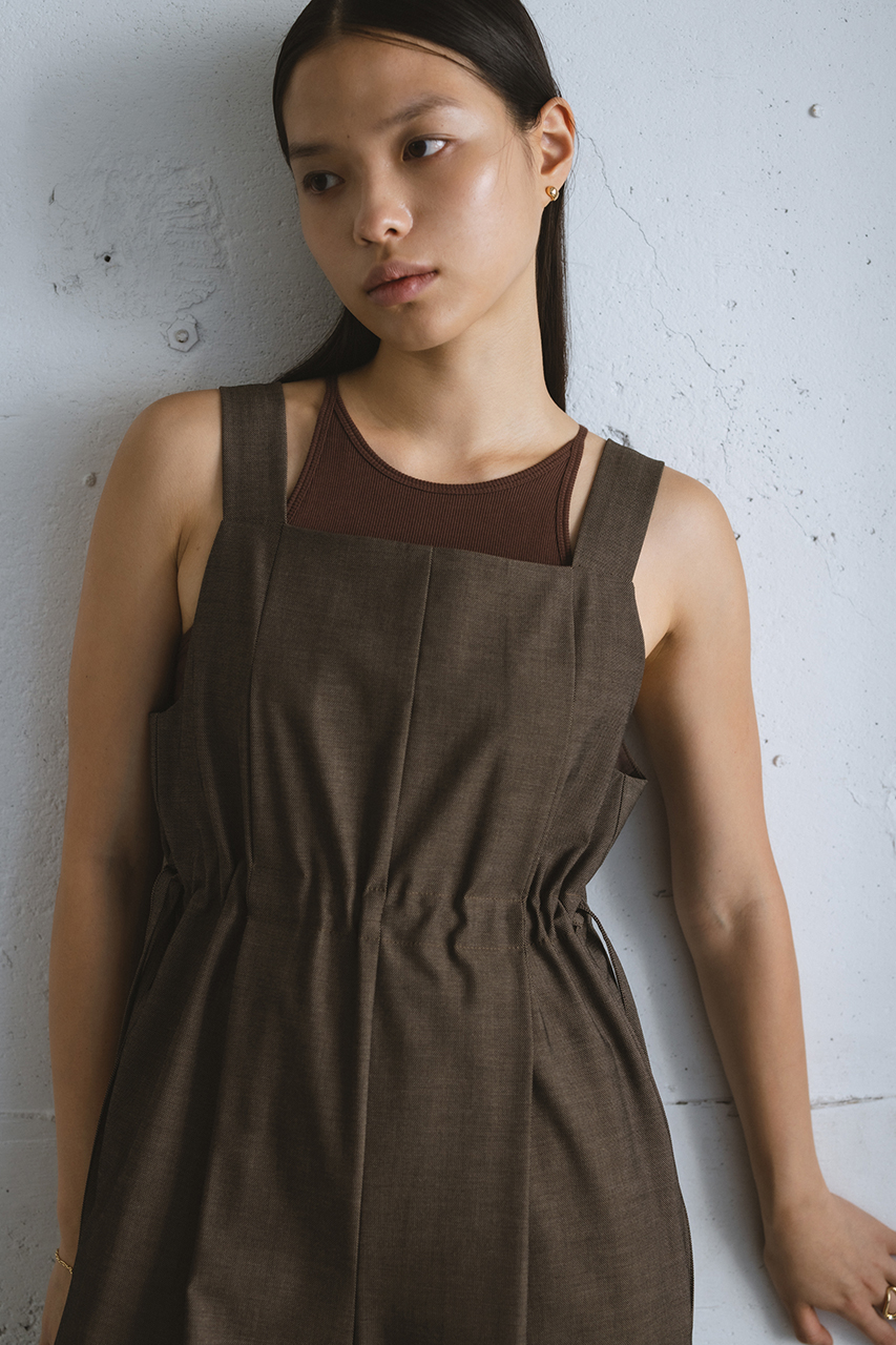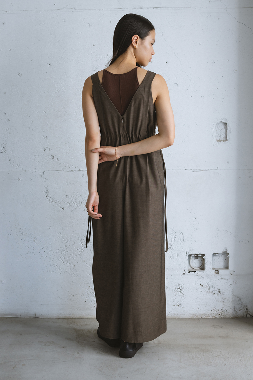ゆったりルーズなサイジングのワイドロンパース。ウエストドロストを絞ったり、垂らしたりとシルエット変化を楽しめます。高見えするドライタッチな素材を使用。インナー次第でロングシーズン着用頂けます。透け感なし、ストレッチややあり。
