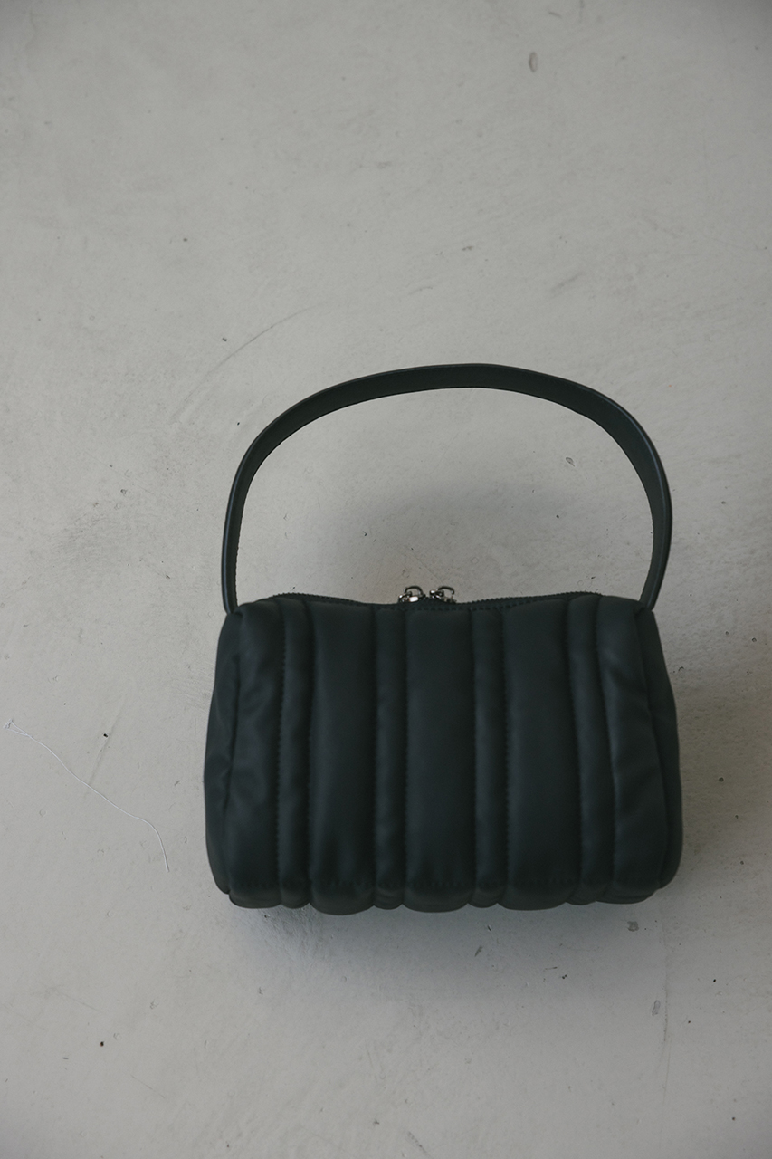 マットで薄いフェイクレザーに中綿キルトを入れたころんとしたフォルムが可愛いバニティバッグ。肩掛けにも出来る存在感のあるバッグです。
