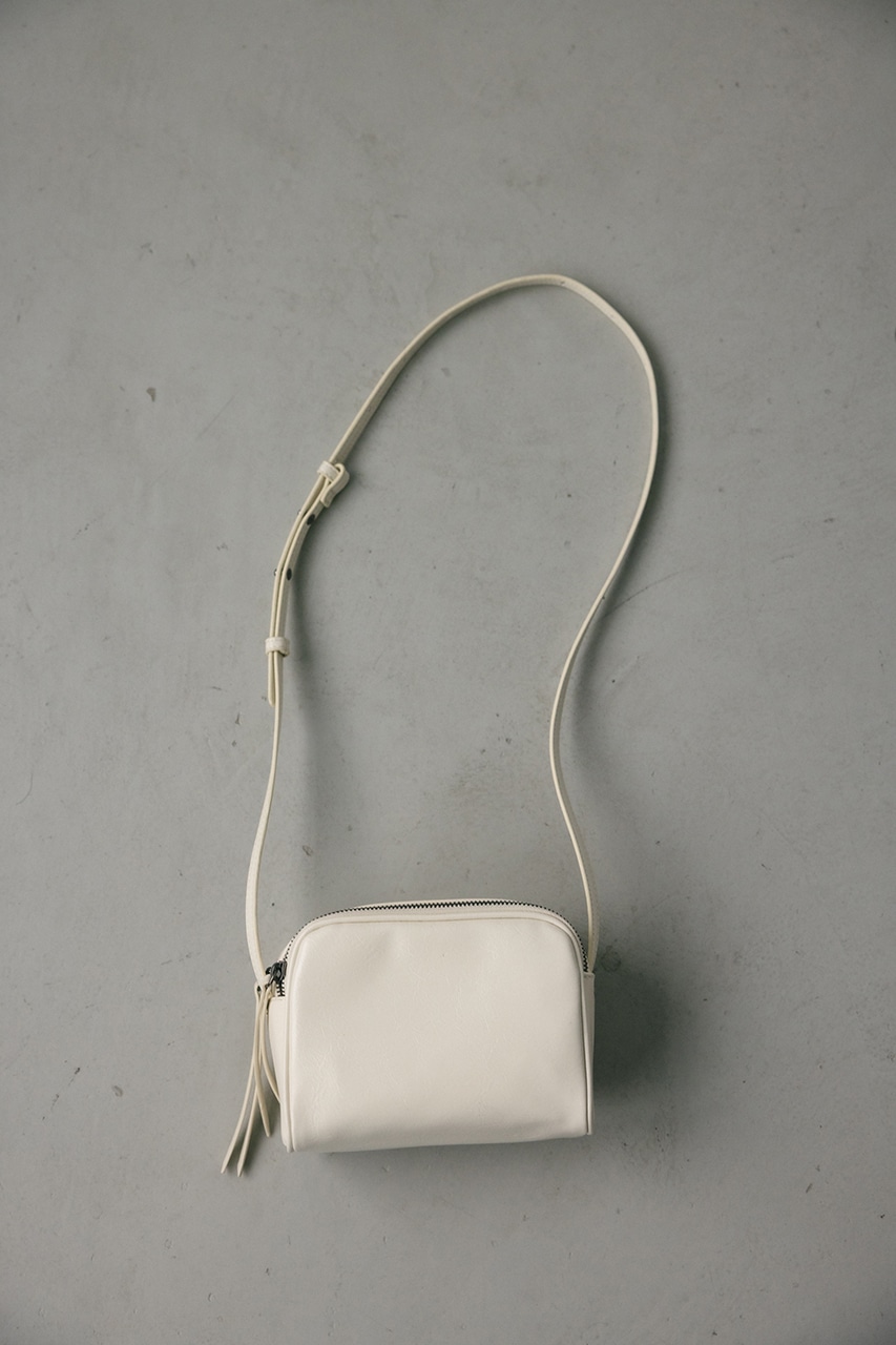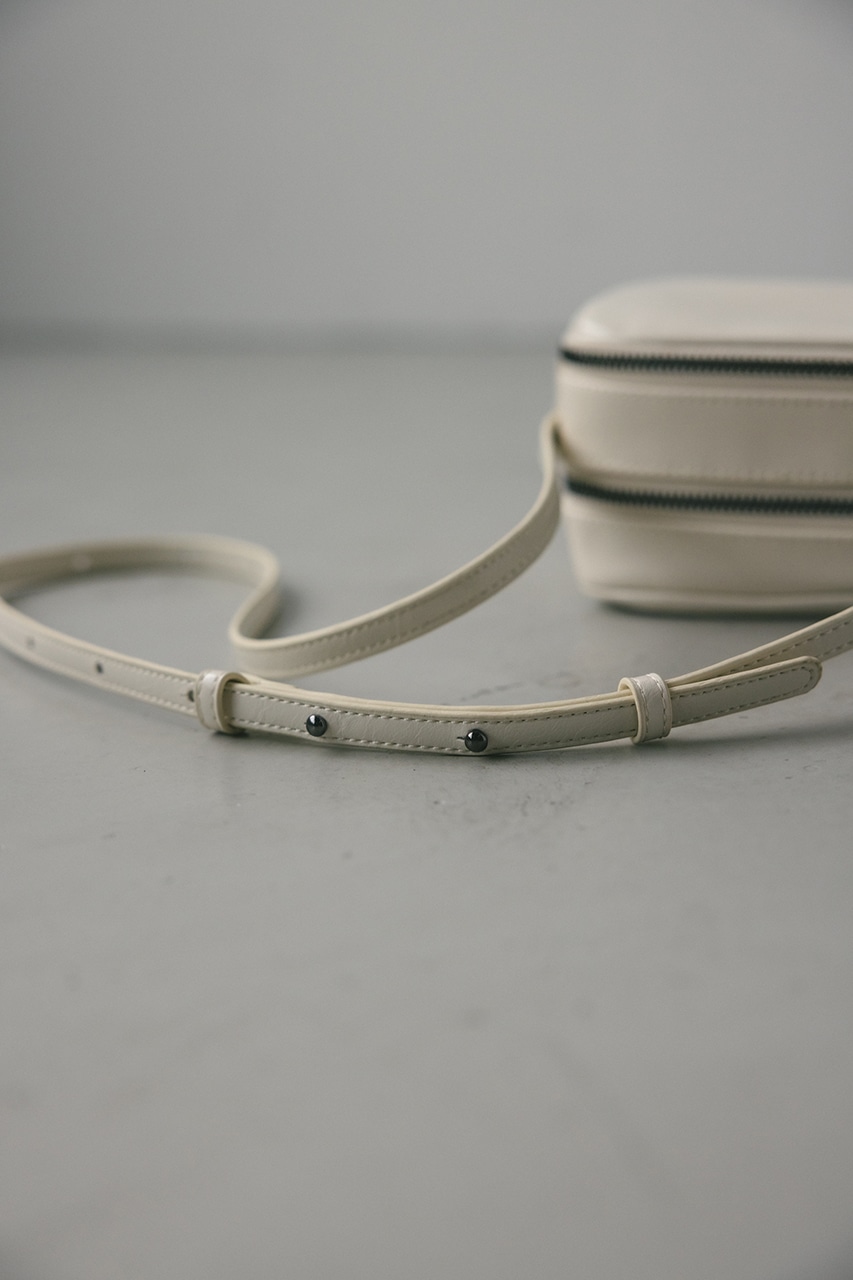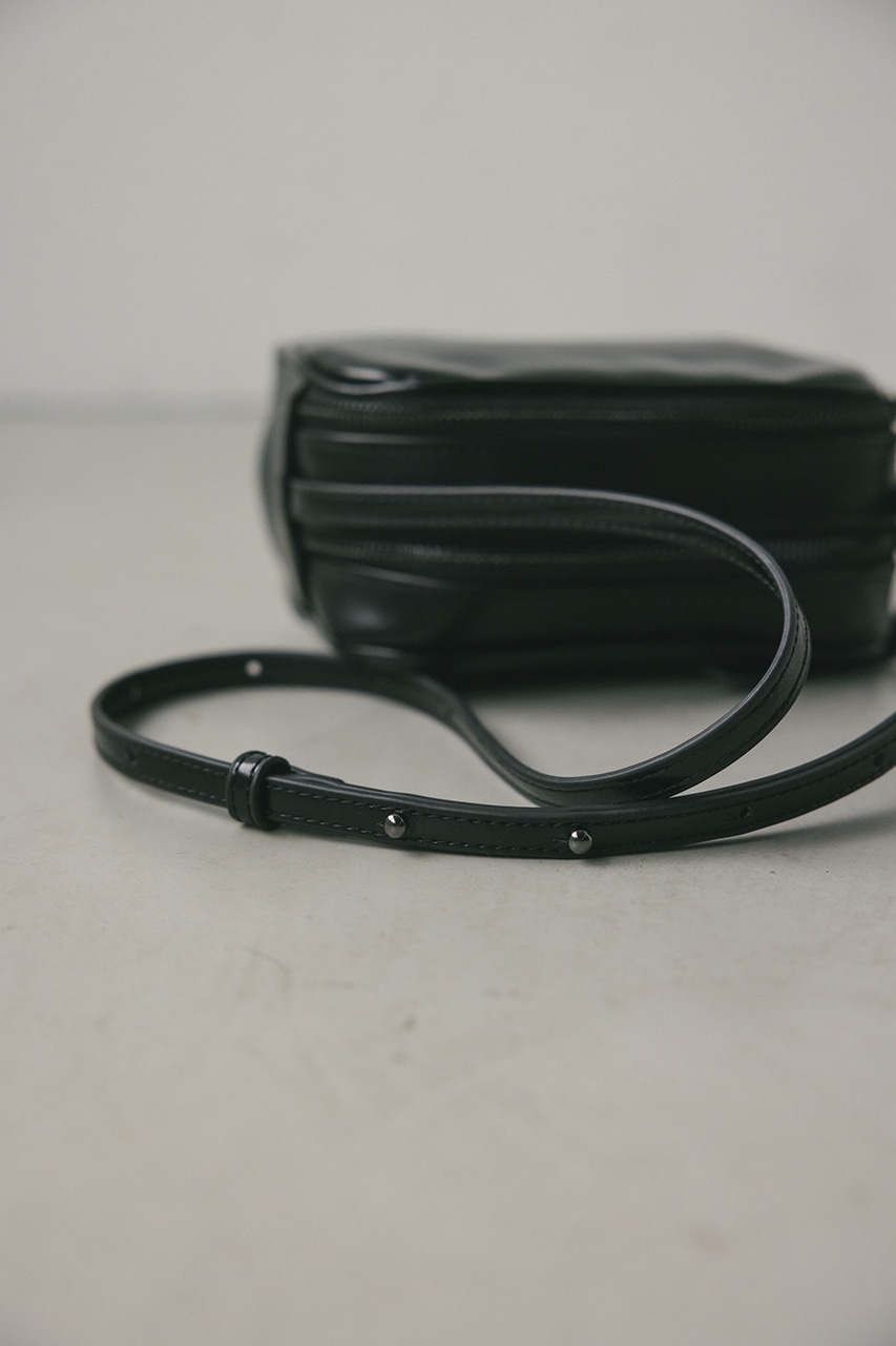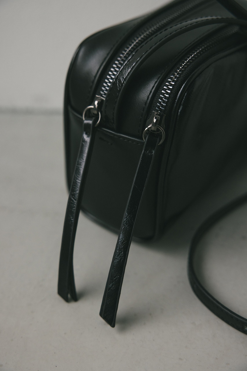 ダブルジップがポイントのコンパクトなスクエア型のショルダーバッグ。カジュアル、モード、綺麗めなどどんなスタイリングにもはまるサイズ感がポイント。トップジッパーで開閉可能。ショルダー長さは調整頂けます。