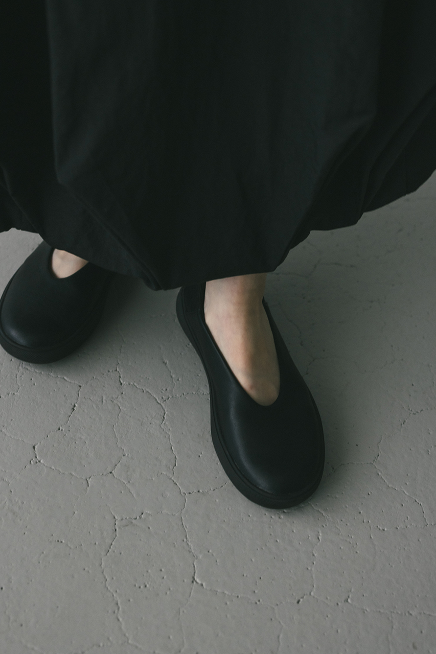 スニーカー仕立てのゴムソールとコロンとしたフォルムが可愛いフラットシューズ。カジュアルにもフェミニンにも馴染む一足。靴下合わせのスタイリングもおすすめです。