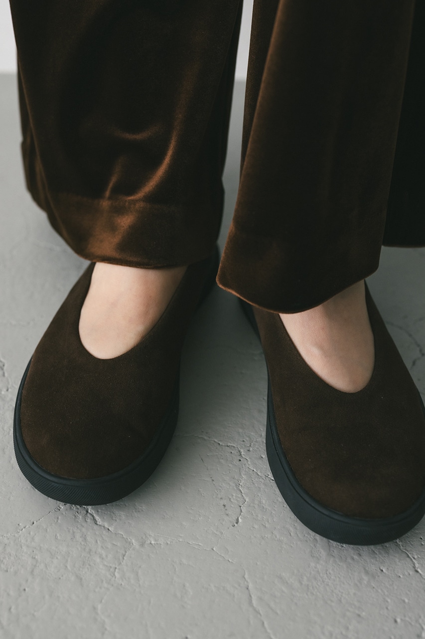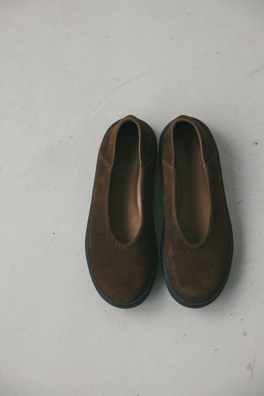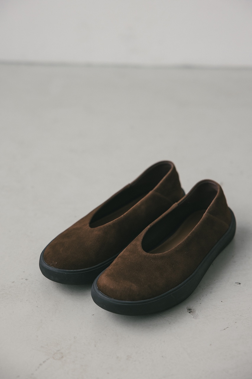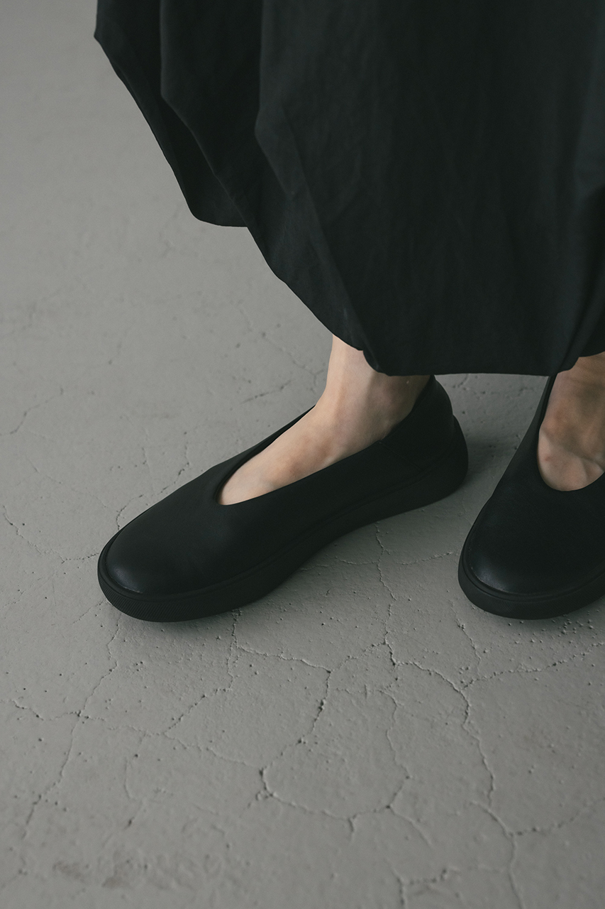 スニーカー仕立てのゴムソールとコロンとしたフォルムが可愛いフラットシューズ。カジュアルにもフェミニンにも馴染む一足。靴下合わせのスタイリングもおすすめです。
