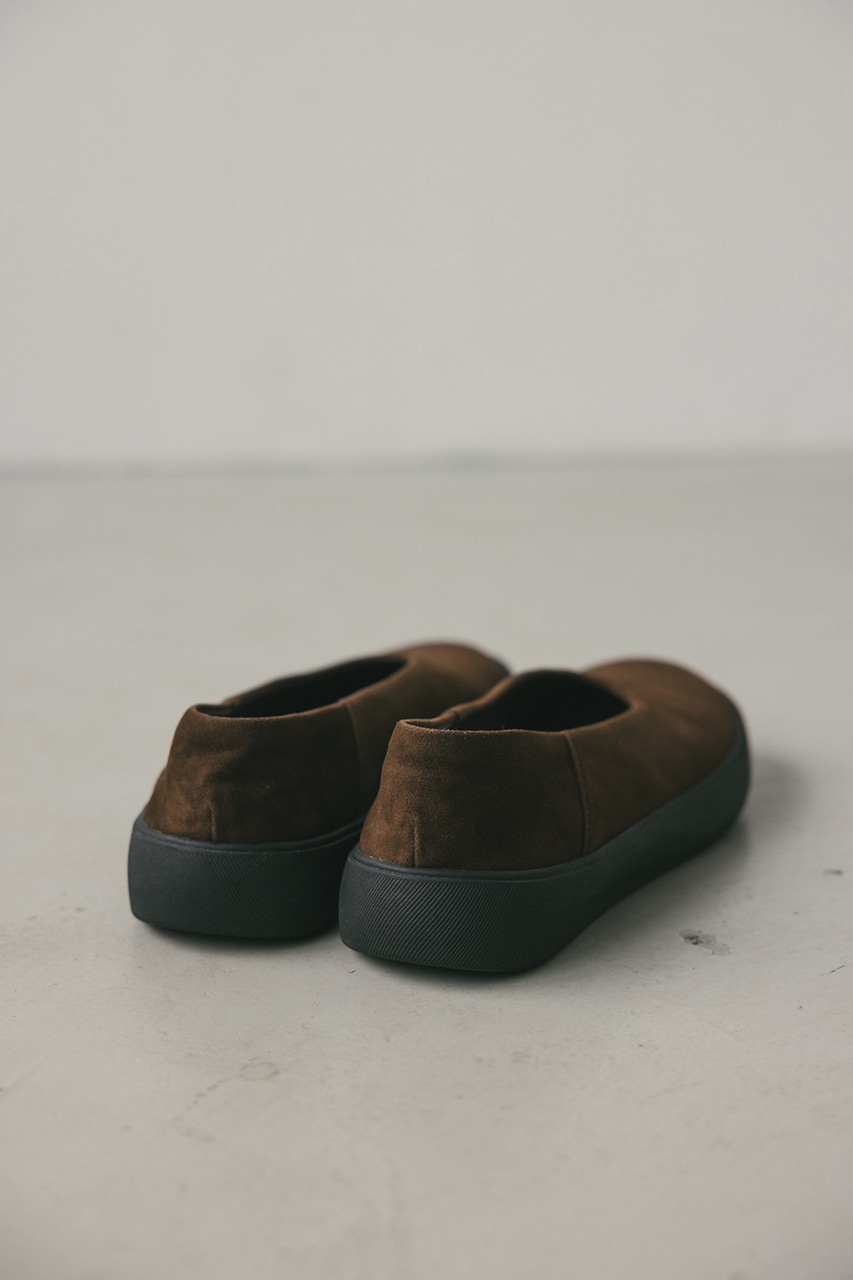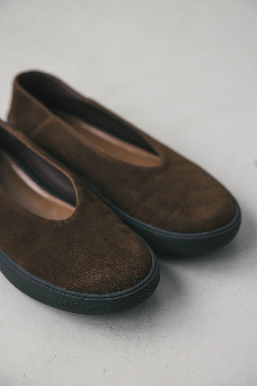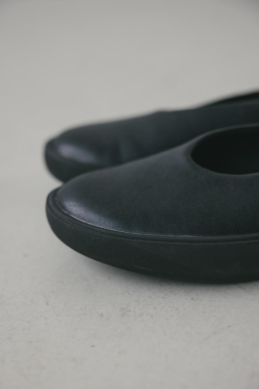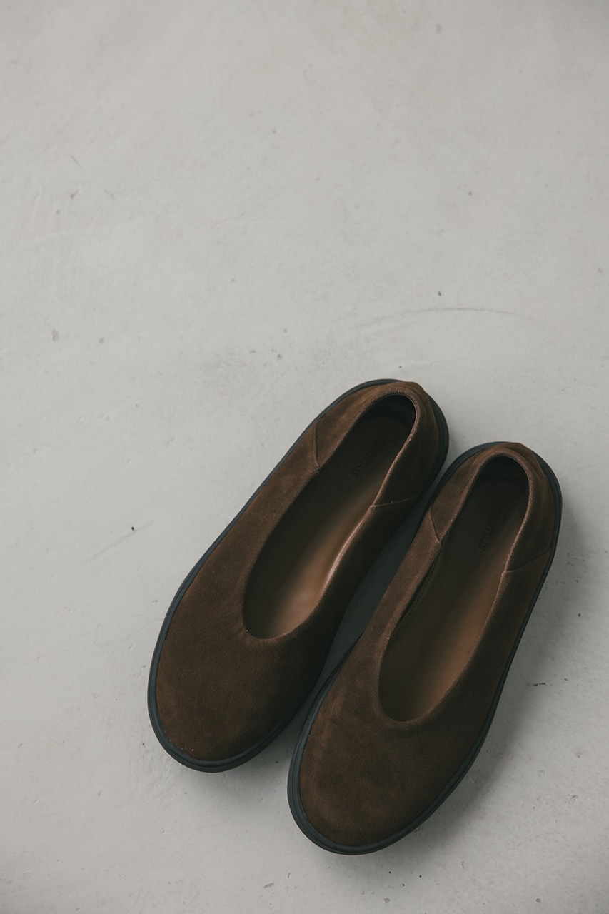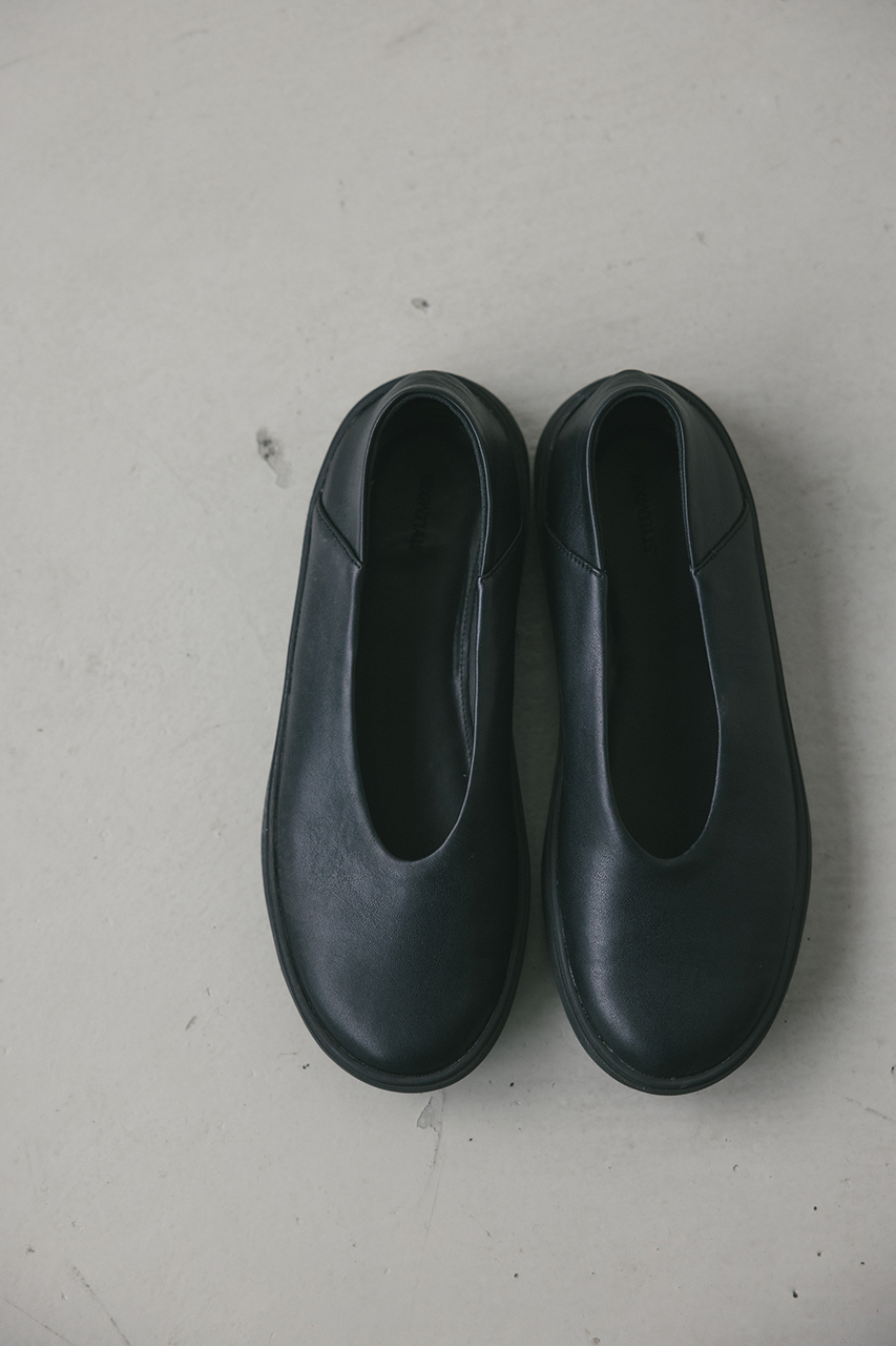スニーカー仕立てのゴムソールとコロンとしたフォルムが可愛いフラットシューズ。カジュアルにもフェミニンにも馴染む一足。靴下合わせのスタイリングもおすすめです。
