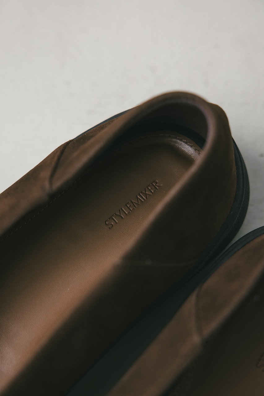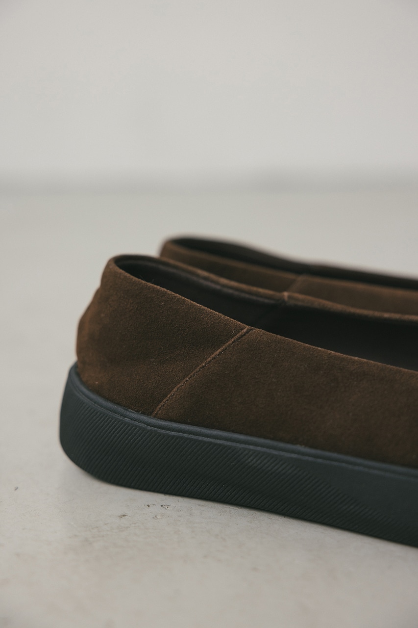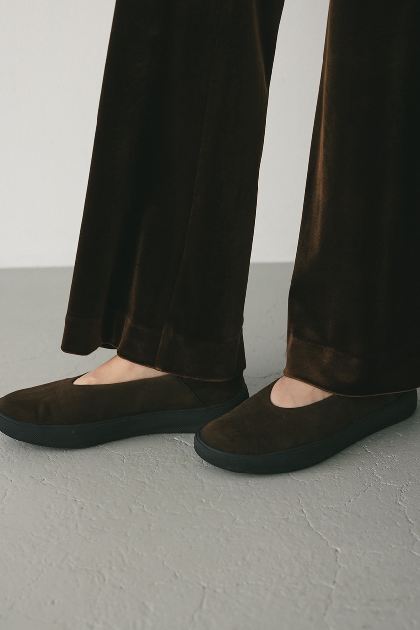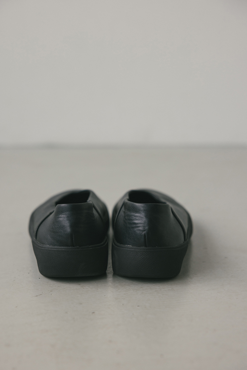 スニーカー仕立てのゴムソールとコロンとしたフォルムが可愛いフラットシューズ。カジュアルにもフェミニンにも馴染む一足。靴下合わせのスタイリングもおすすめです。