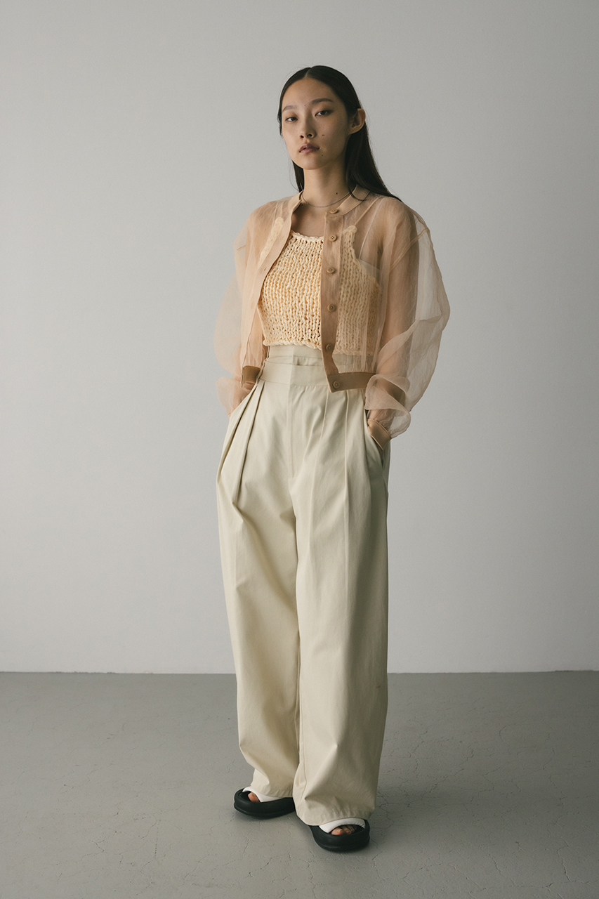 表情感のある上品なシアー素材と、ドライタッチな糸で編み立てたニットのコンビネーションがポイントのシアーカーディガン。立体感のある素材感で存在感のある一枚です。ストレッチあり(ニット部分)、透け感あり。