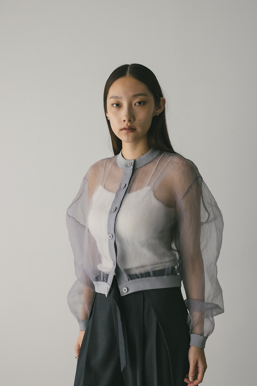 表情感のある上品なシアー素材と、ドライタッチな糸で編み立てたニットのコンビネーションがポイントのシアーカーディガン。立体感のある素材感で存在感のある一枚です。ストレッチあり(ニット部分)、透け感あり。
