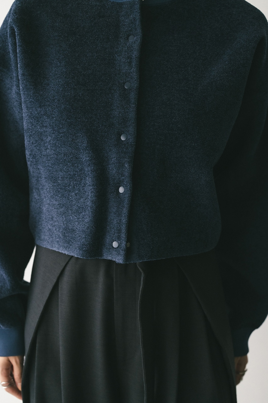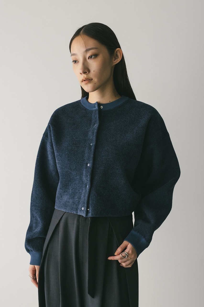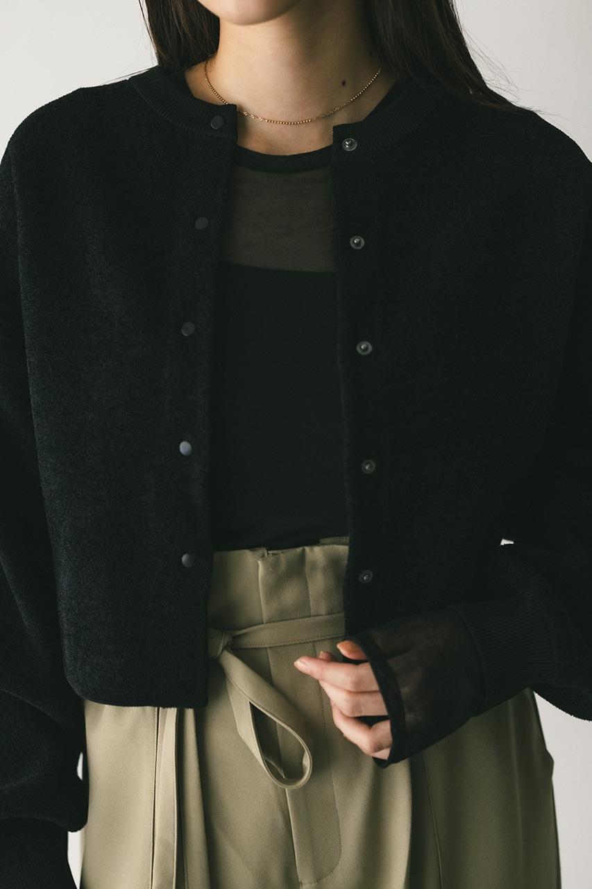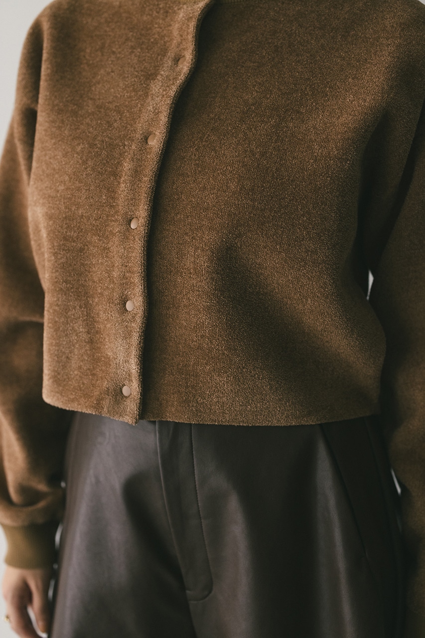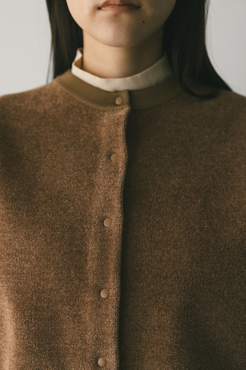 ベロアヤーンとなめらかで上品艶のポリエステル糸を編み立てたリバーシブルベロアニットカーデ。膨らみのある厚みでフォルムがしっかり立つ存在感のある一枚です。スナップドットが可愛いポイント。500IAS70-2261(バックオープンベロアショートニット)とアンサンブルでの着用もおすすめです。ストレッチあり、透け感なし。