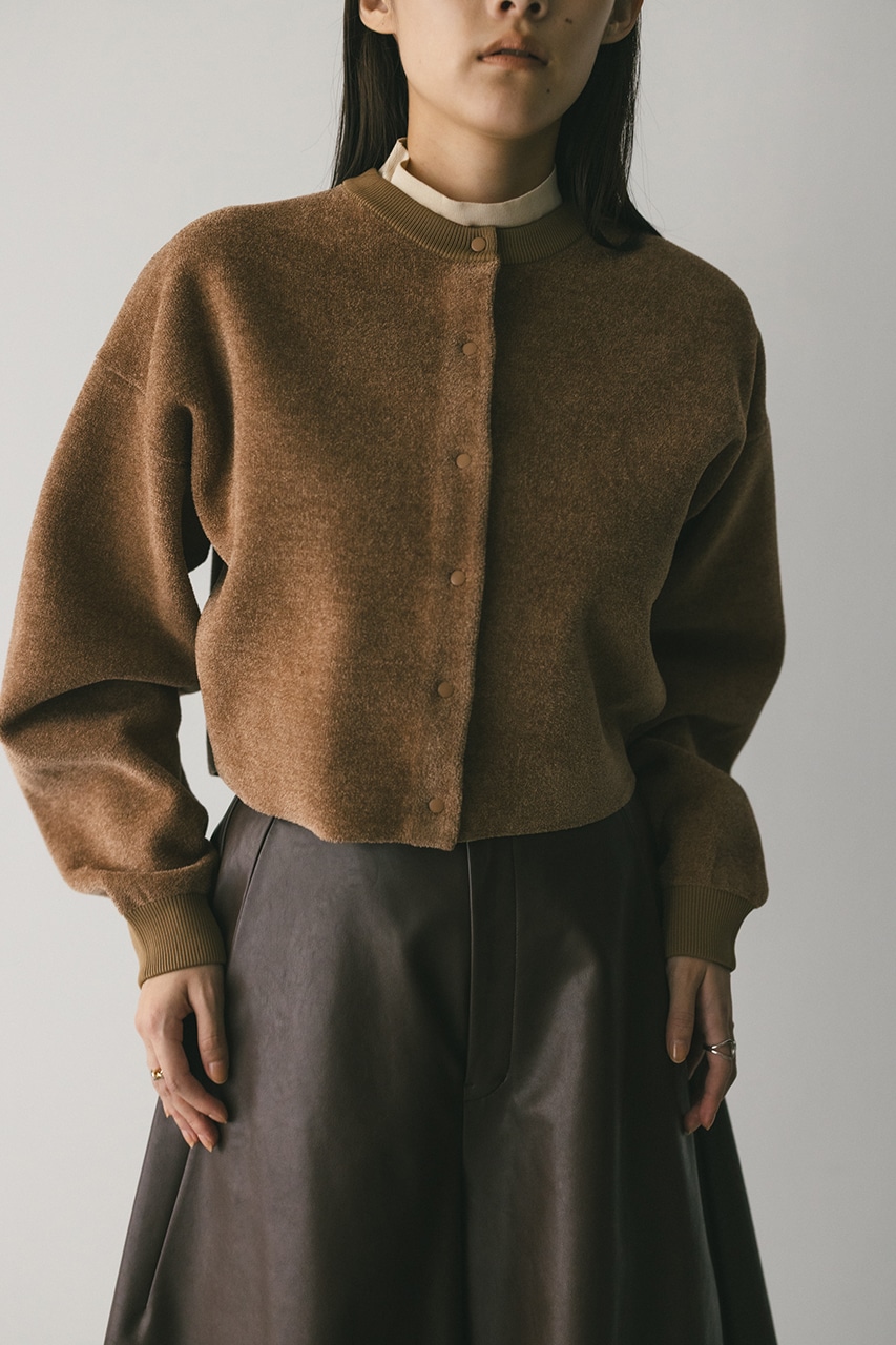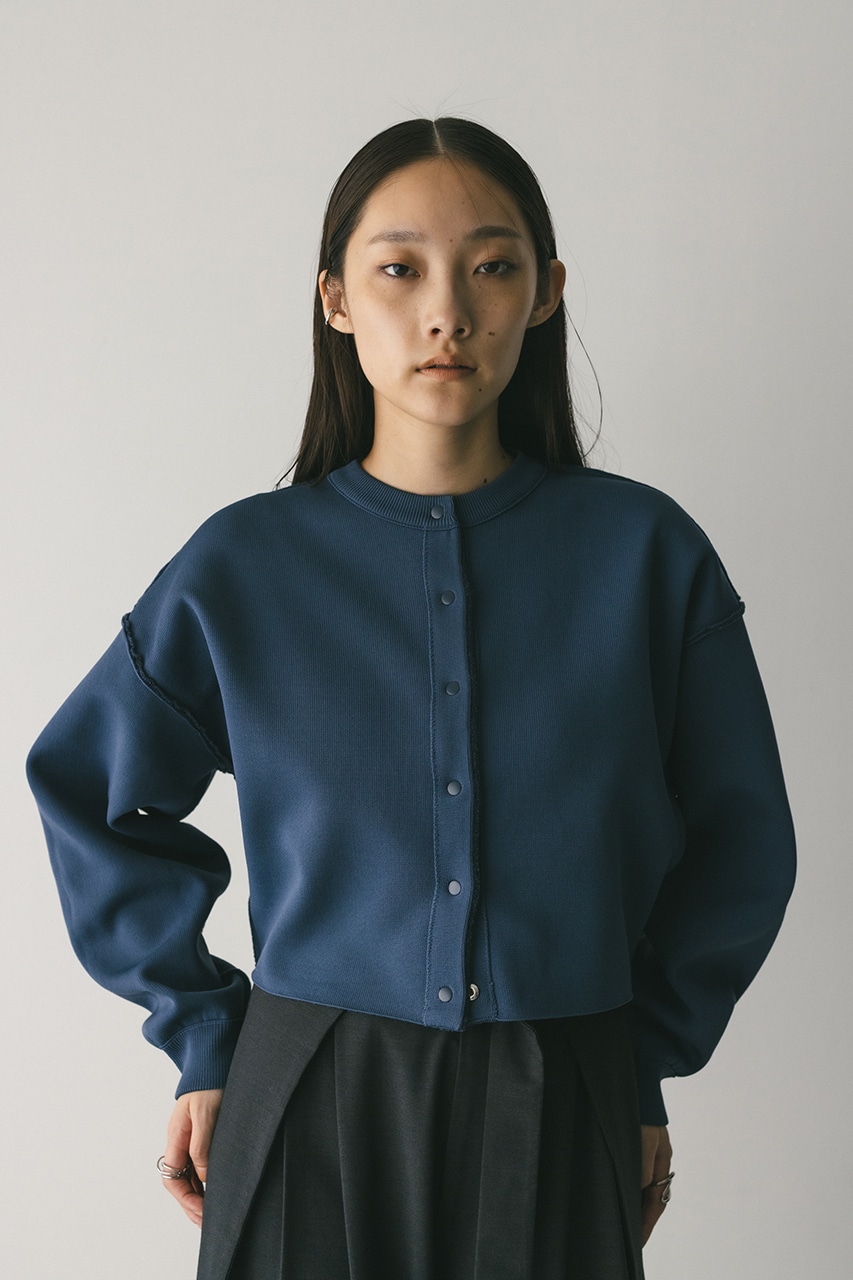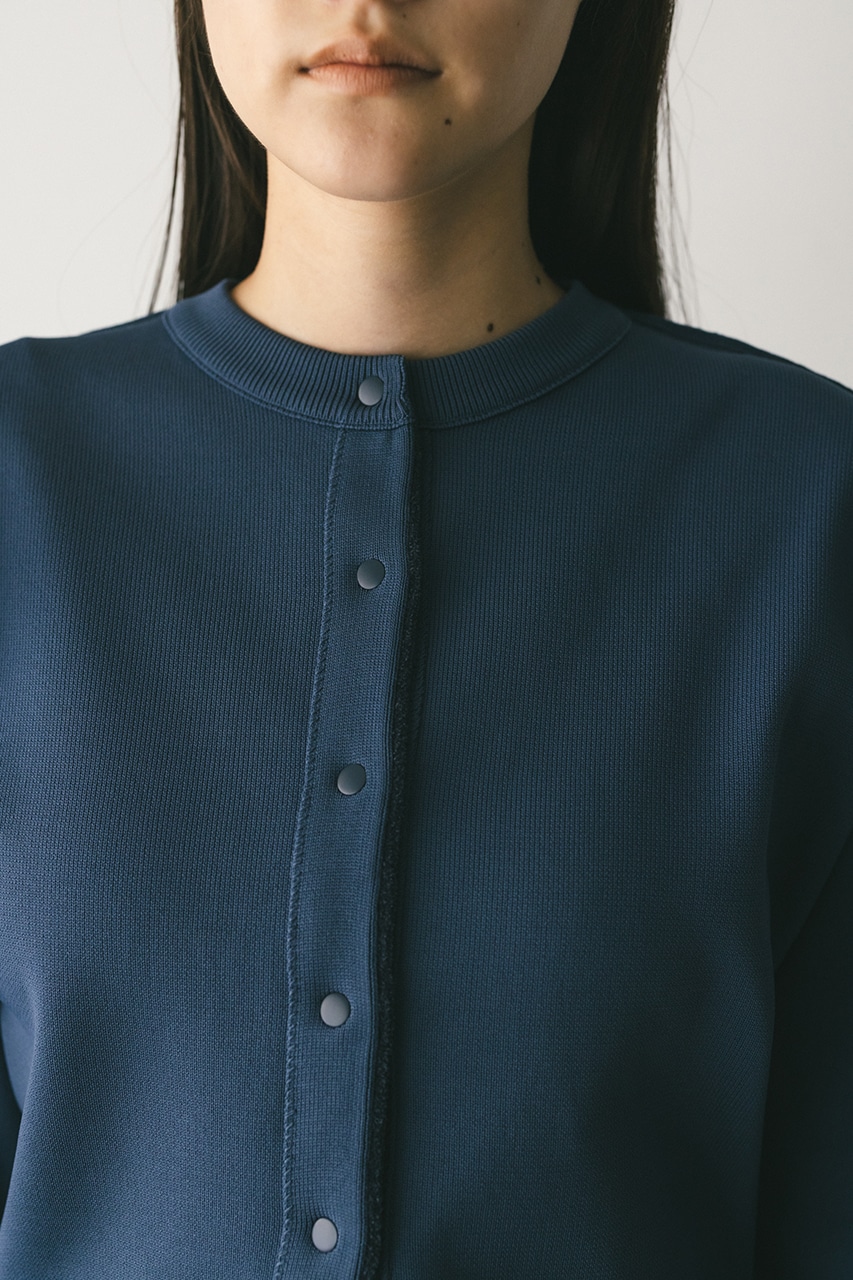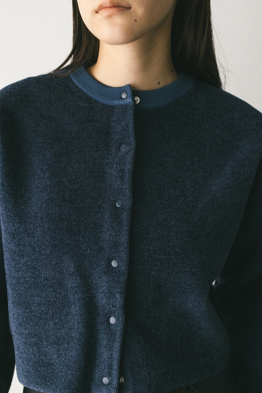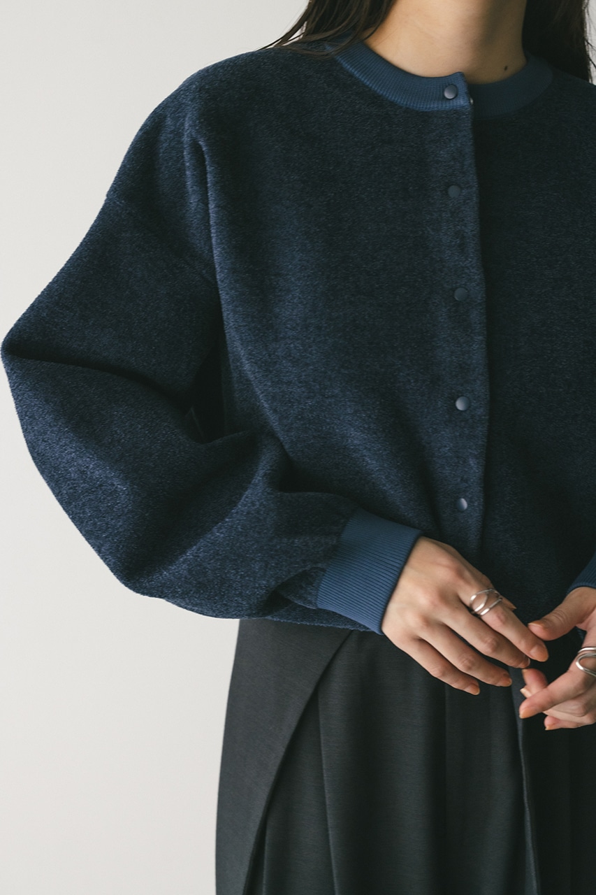 ベロアヤーンとなめらかで上品艶のポリエステル糸を編み立てたリバーシブルベロアニットカーデ。膨らみのある厚みでフォルムがしっかり立つ存在感のある一枚です。スナップドットが可愛いポイント。500IAS70-2261(バックオープンベロアショートニット)とアンサンブルでの着用もおすすめです。ストレッチあり、透け感なし。