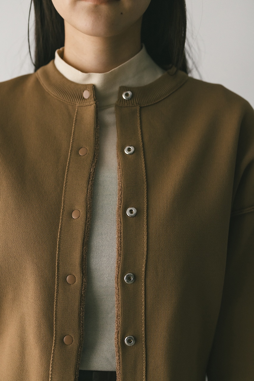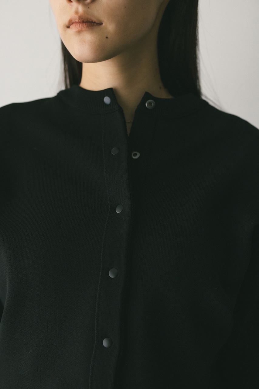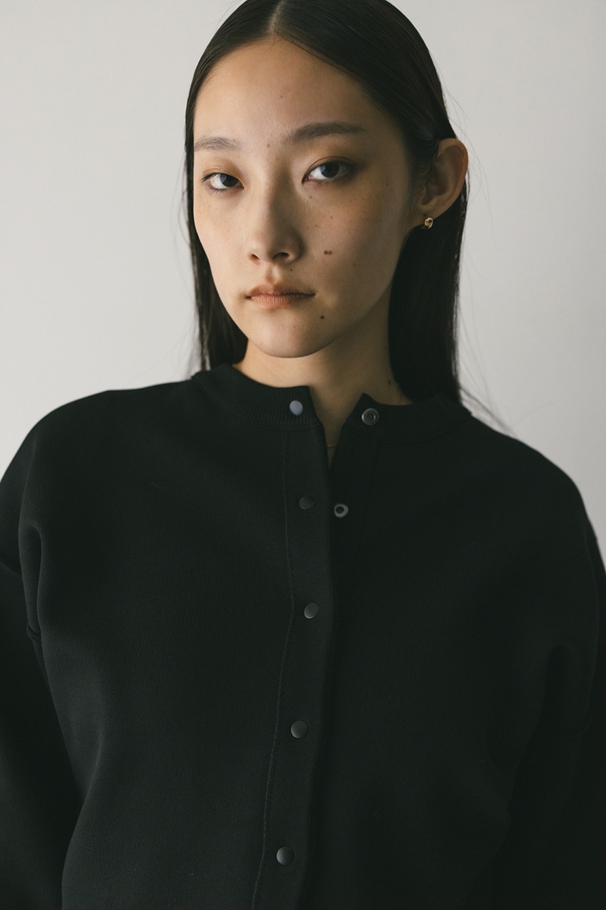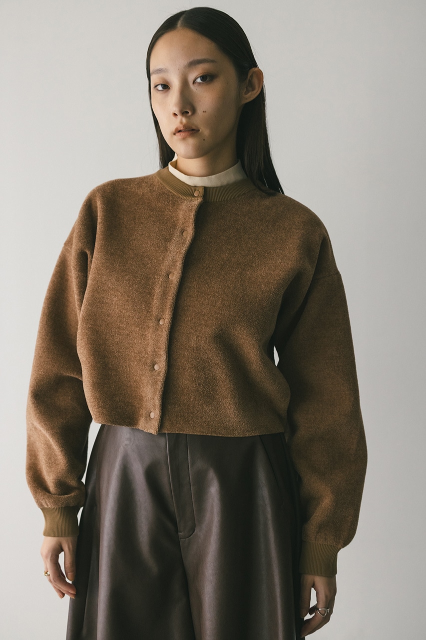 ベロアヤーンとなめらかで上品艶のポリエステル糸を編み立てたリバーシブルベロアニットカーデ。膨らみのある厚みでフォルムがしっかり立つ存在感のある一枚です。スナップドットが可愛いポイント。500IAS70-2261(バックオープンベロアショートニット)とアンサンブルでの着用もおすすめです。ストレッチあり、透け感なし。