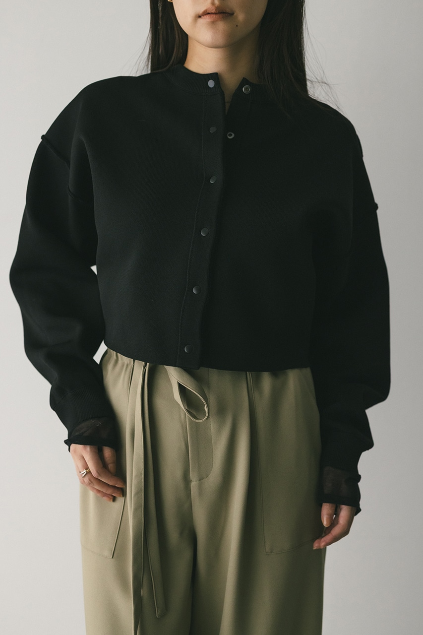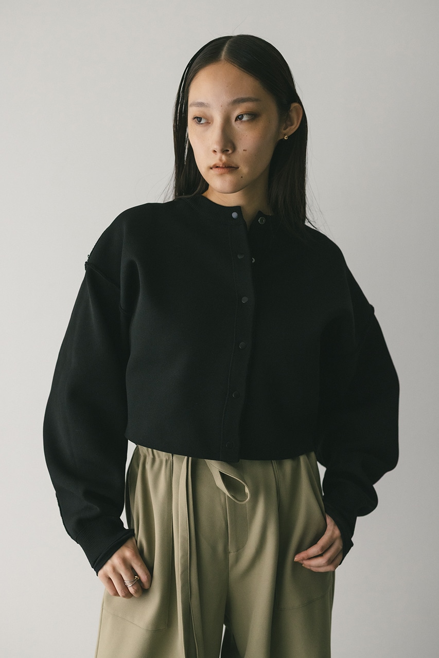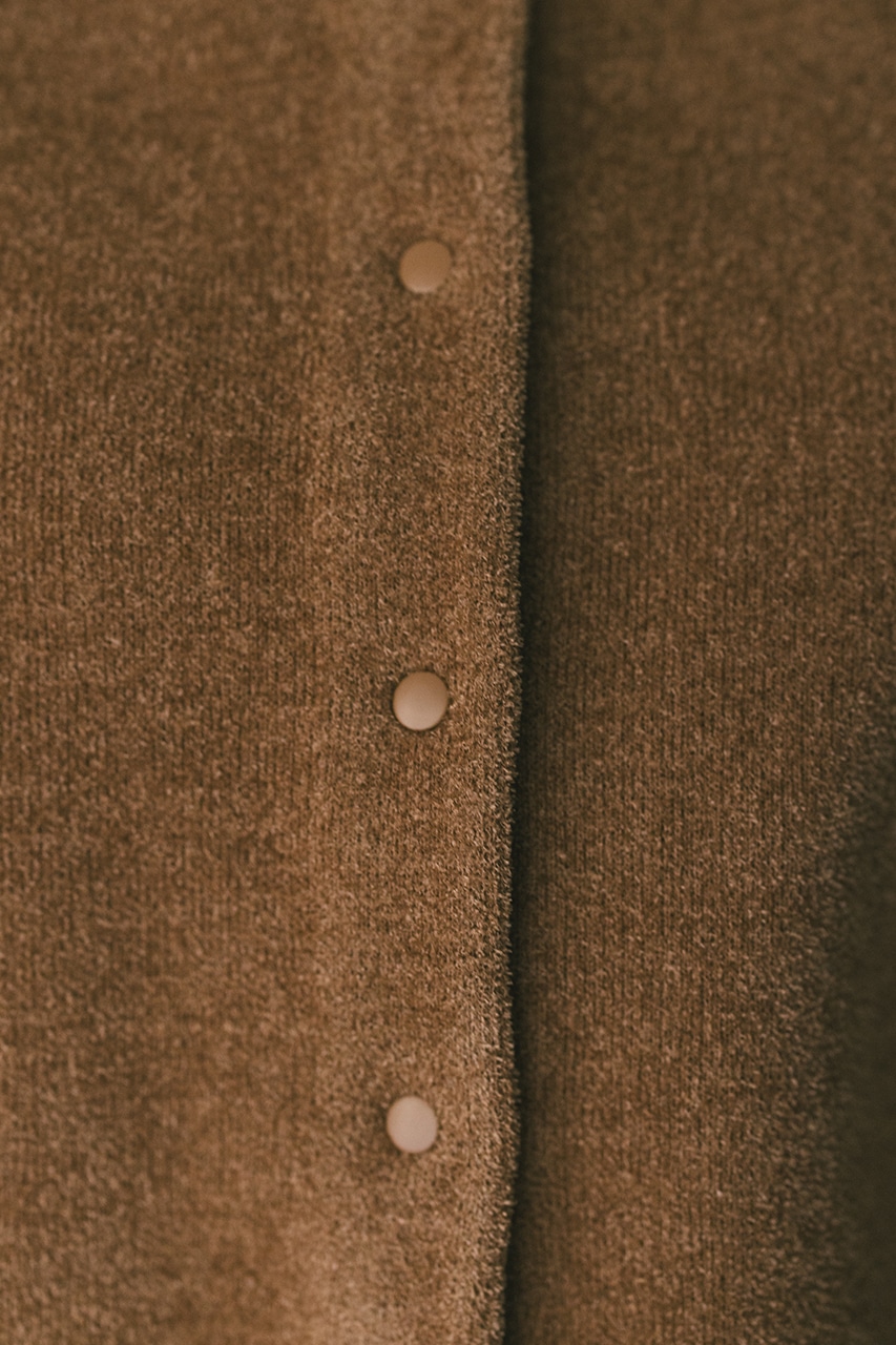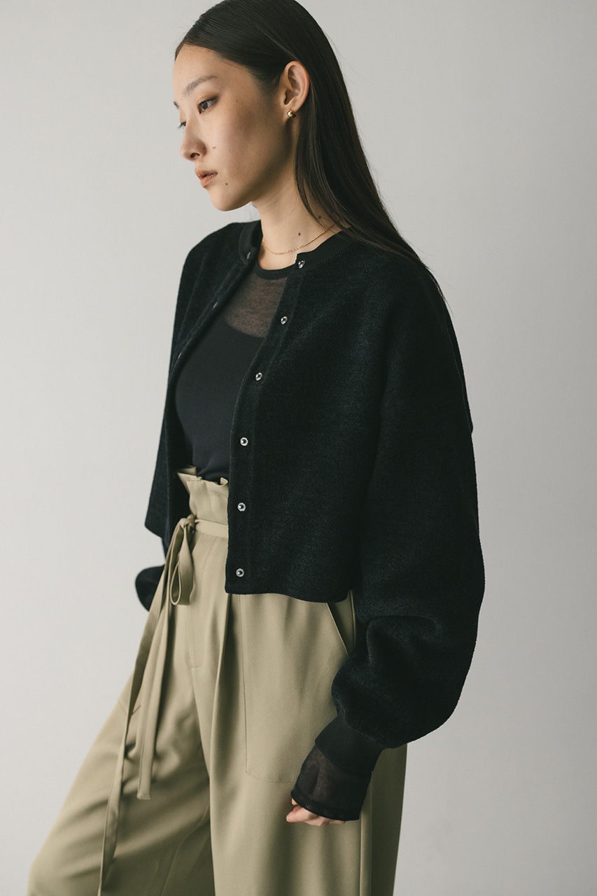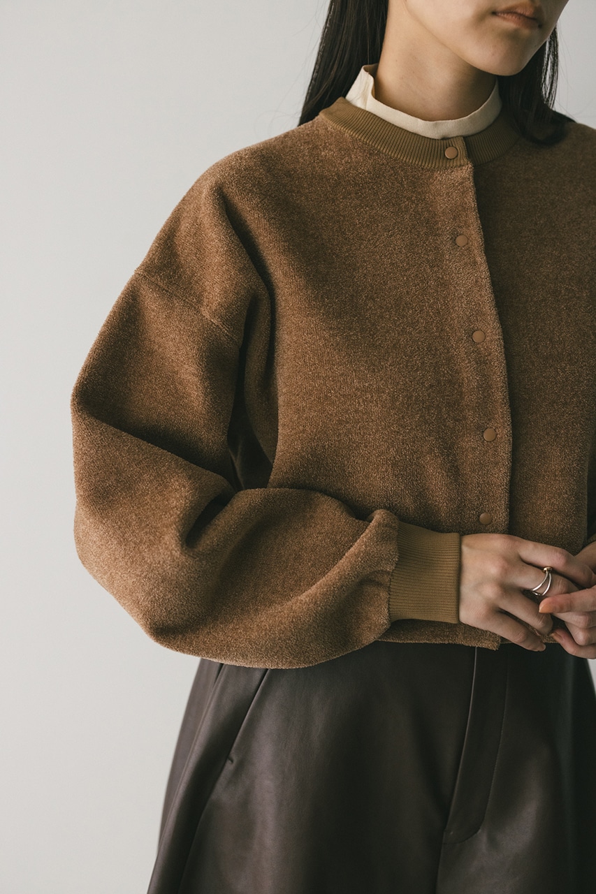 ベロアヤーンとなめらかで上品艶のポリエステル糸を編み立てたリバーシブルベロアニットカーデ。膨らみのある厚みでフォルムがしっかり立つ存在感のある一枚です。スナップドットが可愛いポイント。500IAS70-2261(バックオープンベロアショートニット)とアンサンブルでの着用もおすすめです。ストレッチあり、透け感なし。