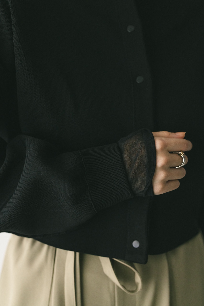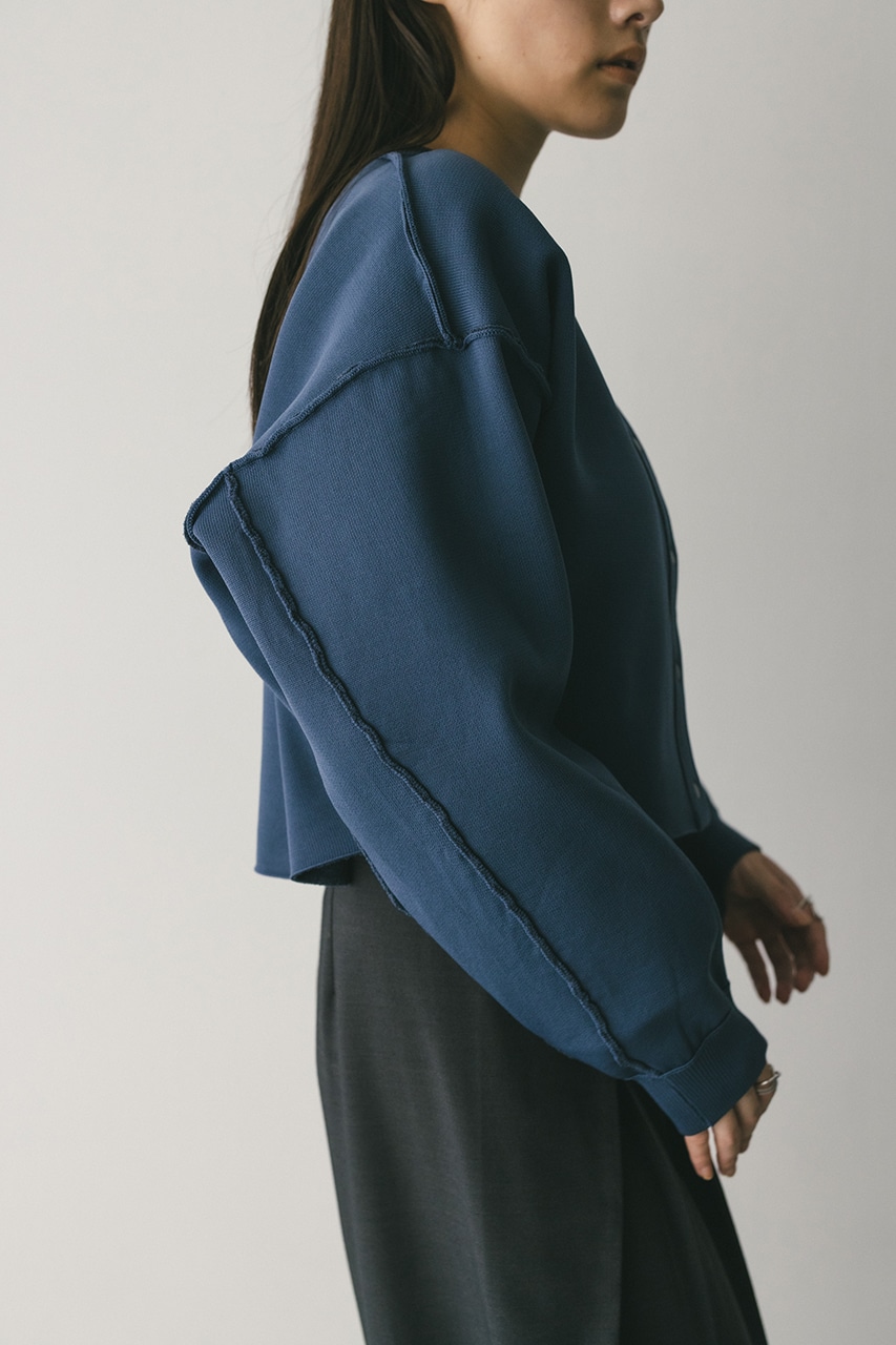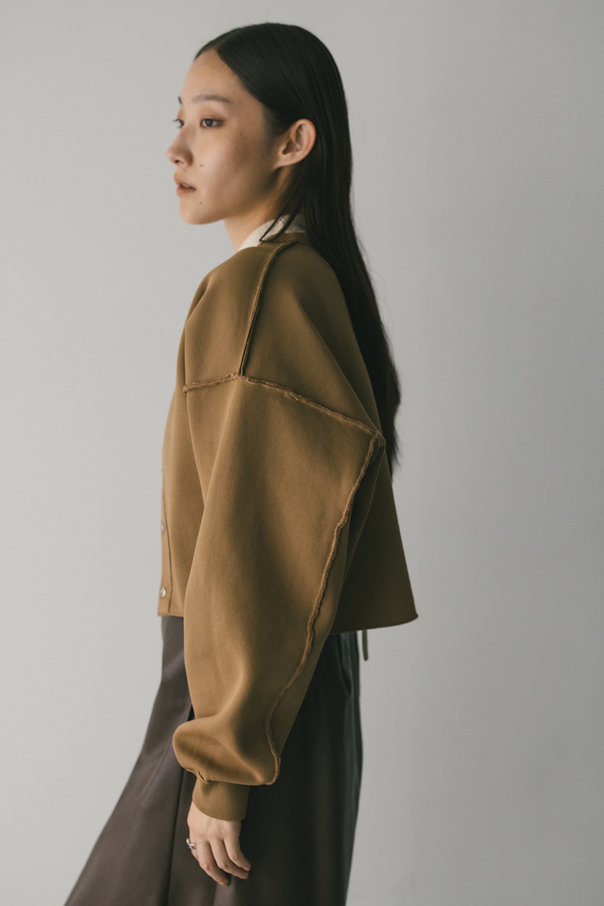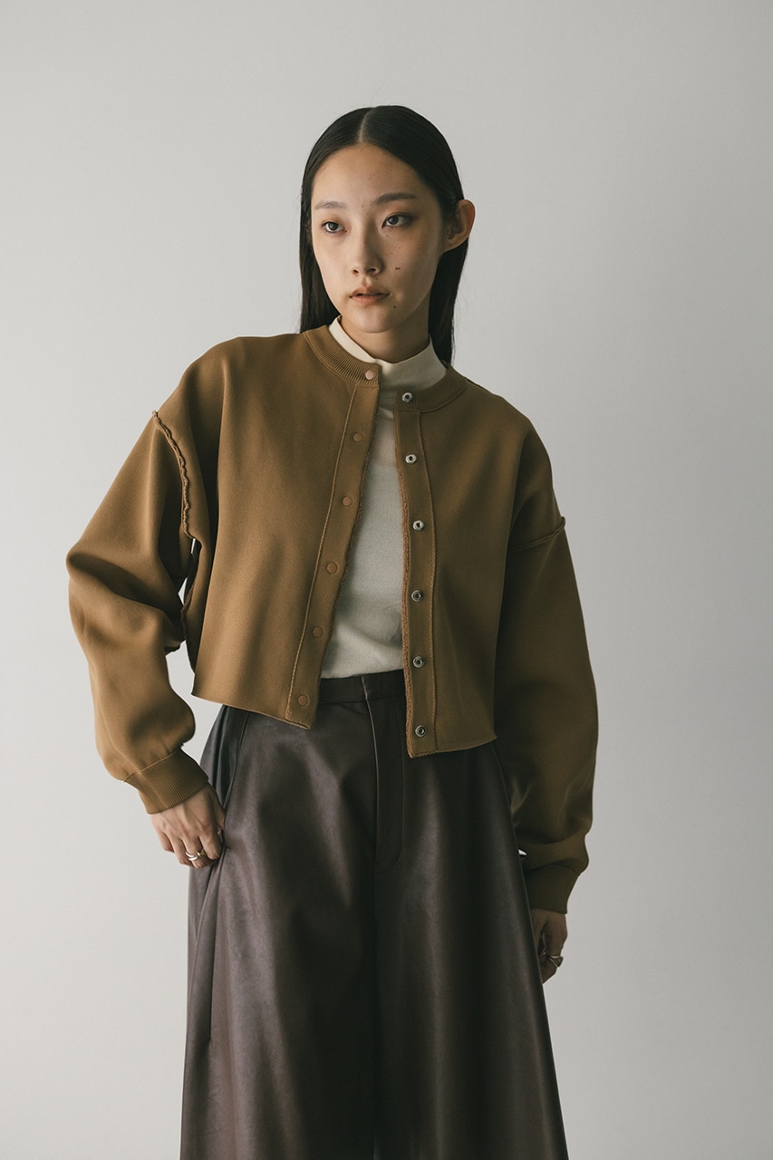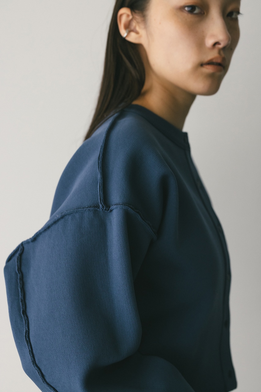 ベロアヤーンとなめらかで上品艶のポリエステル糸を編み立てたリバーシブルベロアニットカーデ。膨らみのある厚みでフォルムがしっかり立つ存在感のある一枚です。スナップドットが可愛いポイント。500IAS70-2261(バックオープンベロアショートニット)とアンサンブルでの着用もおすすめです。ストレッチあり、透け感なし。