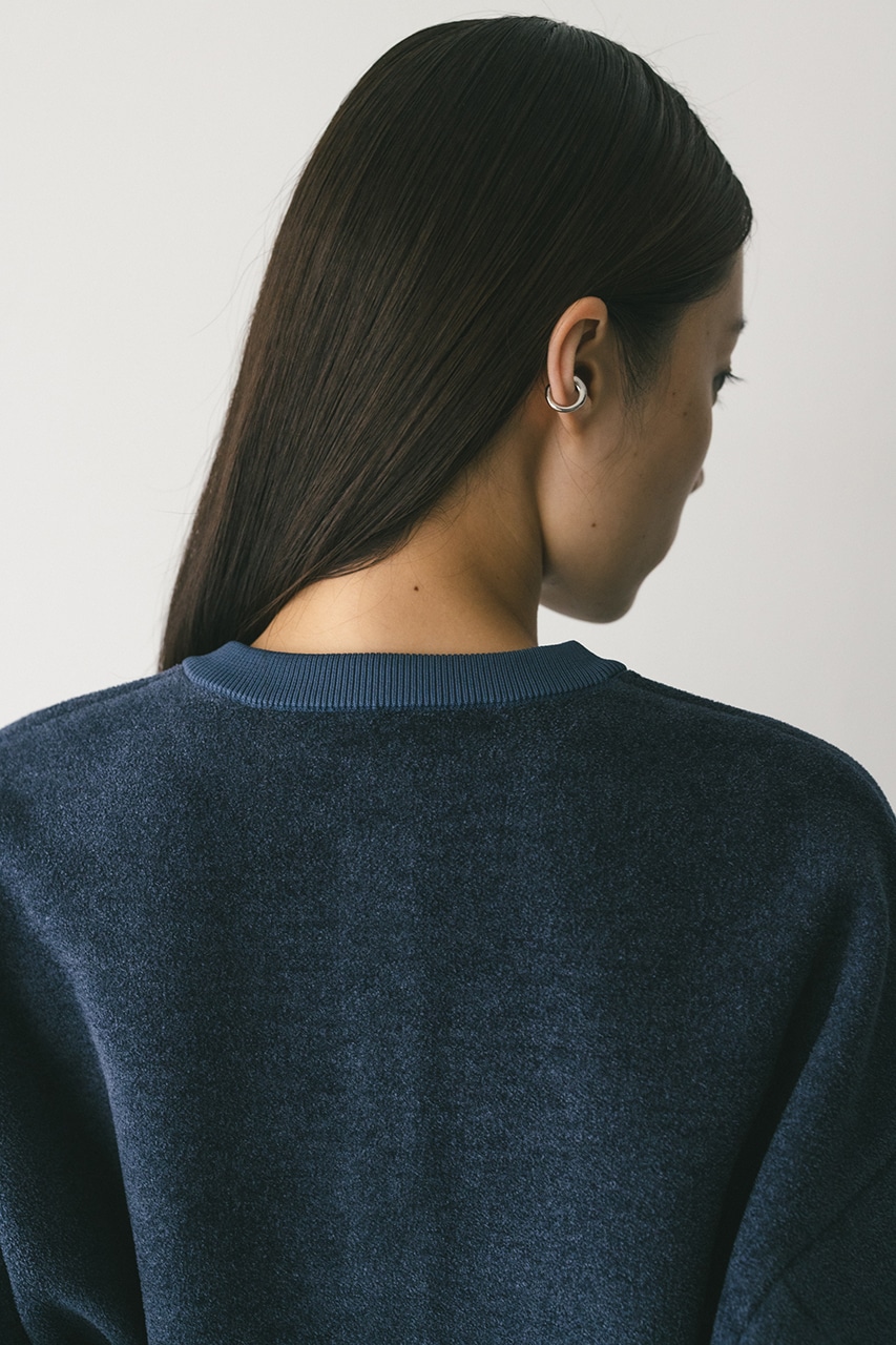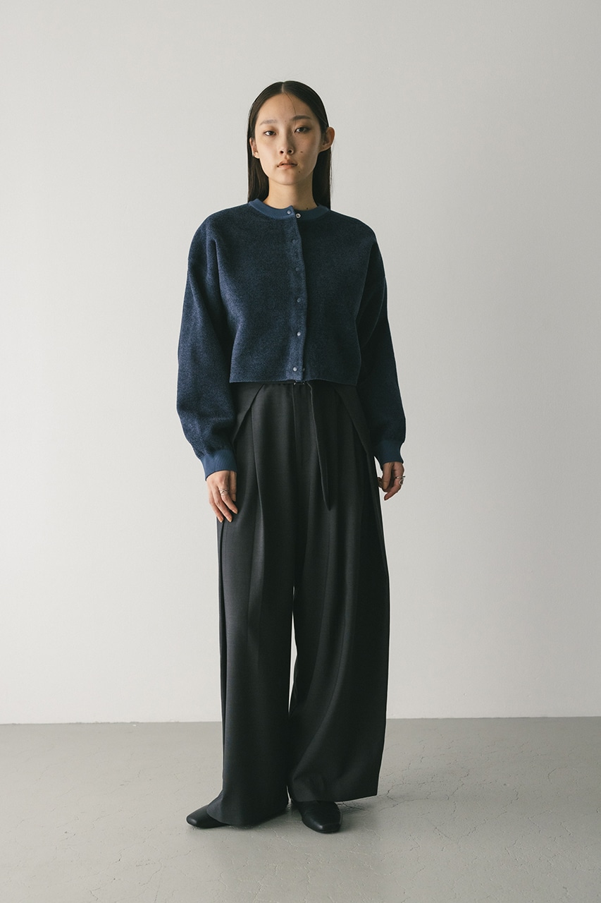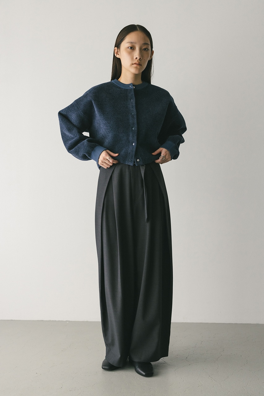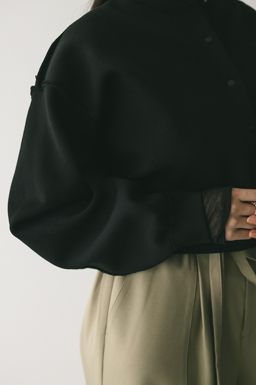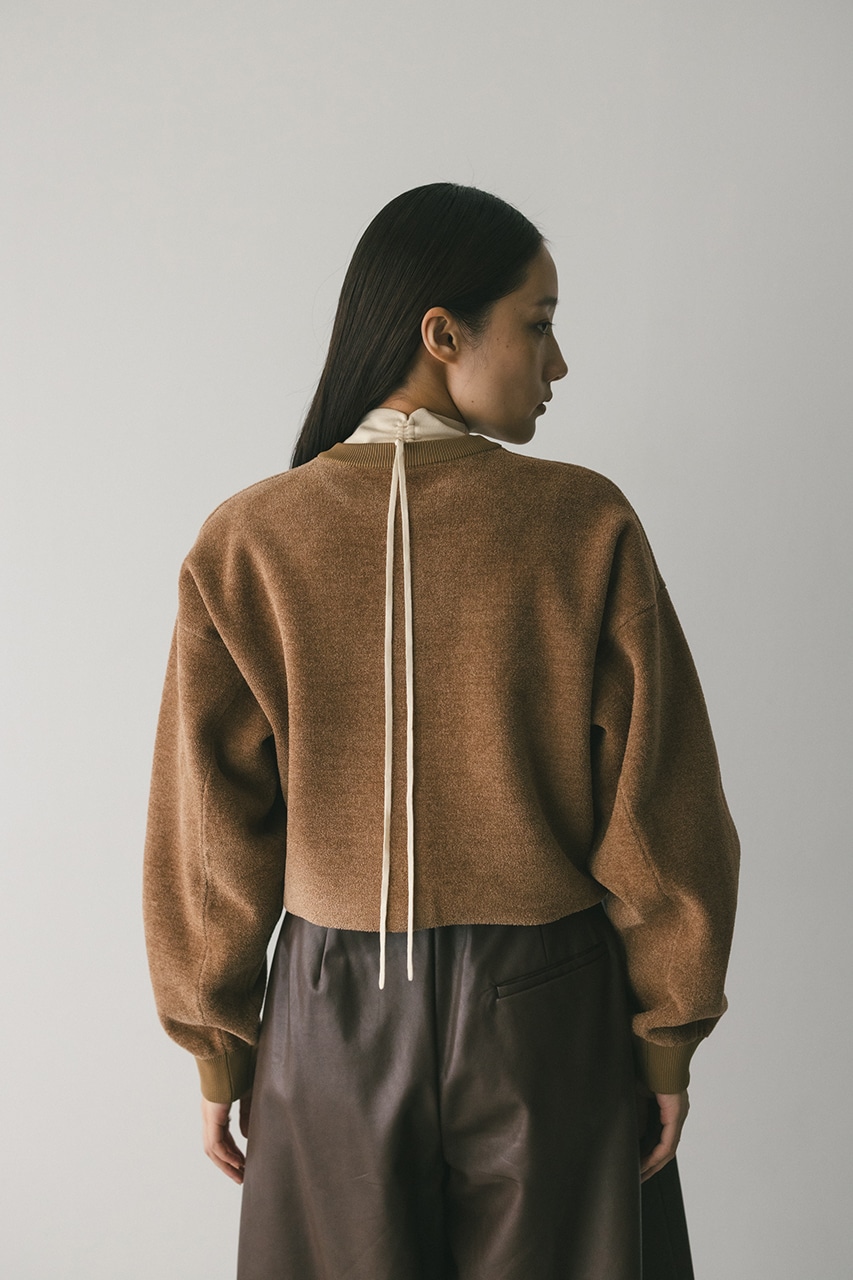 ベロアヤーンとなめらかで上品艶のポリエステル糸を編み立てたリバーシブルベロアニットカーデ。膨らみのある厚みでフォルムがしっかり立つ存在感のある一枚です。スナップドットが可愛いポイント。500IAS70-2261(バックオープンベロアショートニット)とアンサンブルでの着用もおすすめです。ストレッチあり、透け感なし。