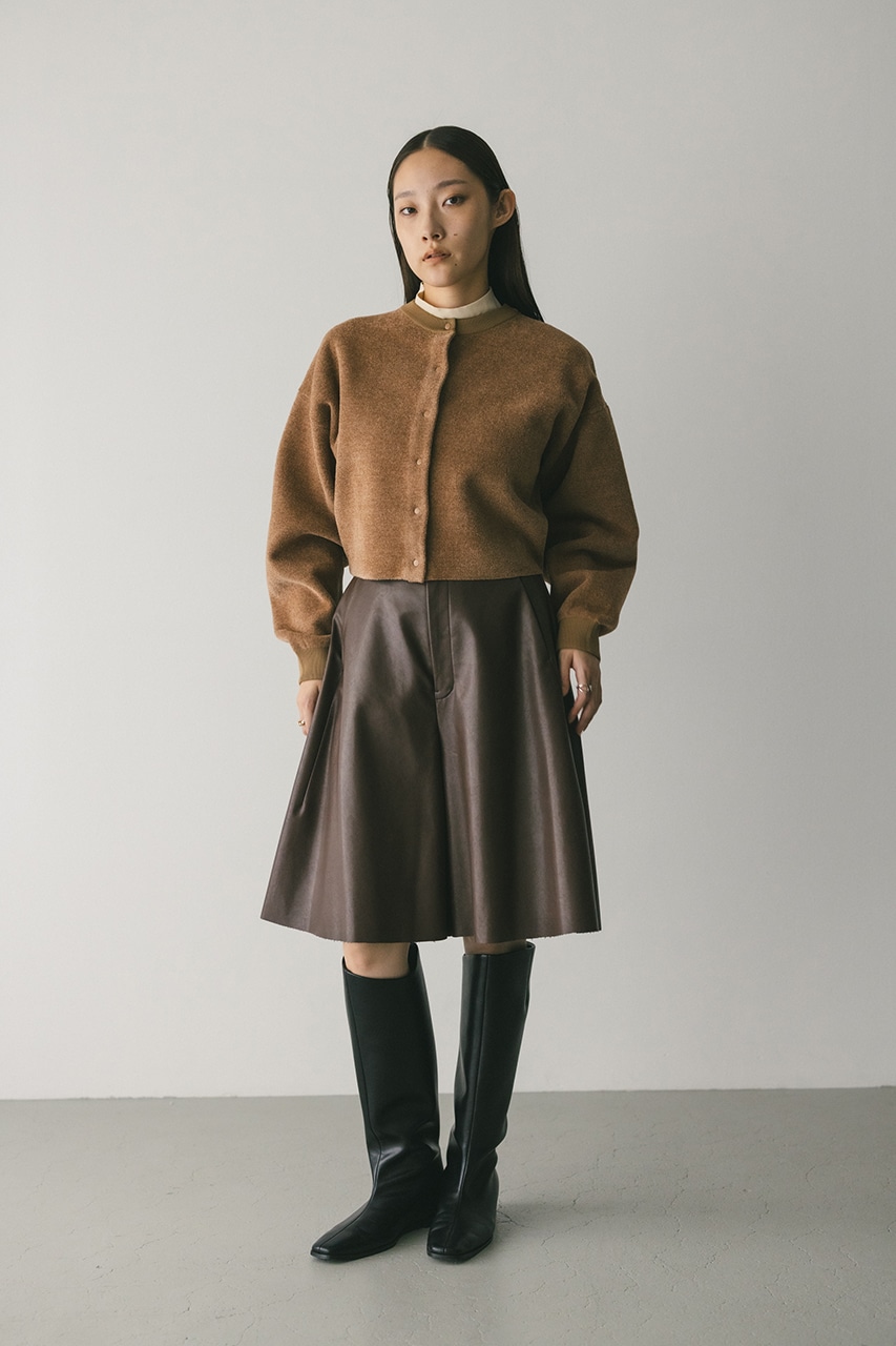 ベロアヤーンとなめらかで上品艶のポリエステル糸を編み立てたリバーシブルベロアニットカーデ。膨らみのある厚みでフォルムがしっかり立つ存在感のある一枚です。スナップドットが可愛いポイント。500IAS70-2261(バックオープンベロアショートニット)とアンサンブルでの着用もおすすめです。ストレッチあり、透け感なし。