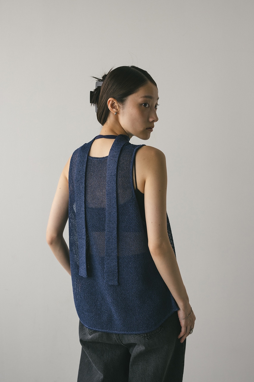 ドライタッチのテープヤーンで編み立てたチョーカー付きニットベスト。涼し気ながら秋らしさも感じさせる一枚。シャツやキャミソール、Tシャツなどレイヤードによって様々なスタイリングを楽しめます。透け感あり、ストレッチあり。
