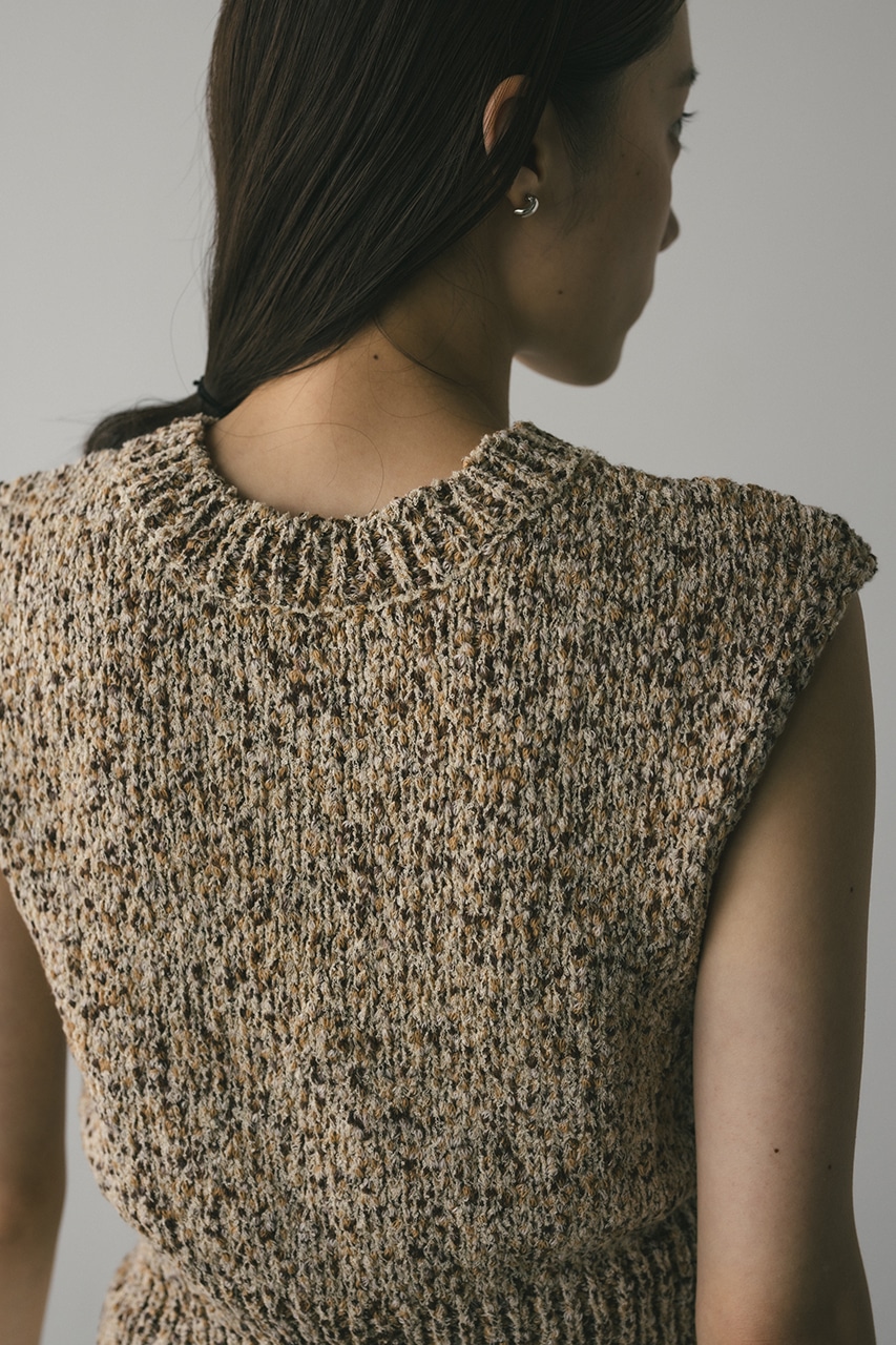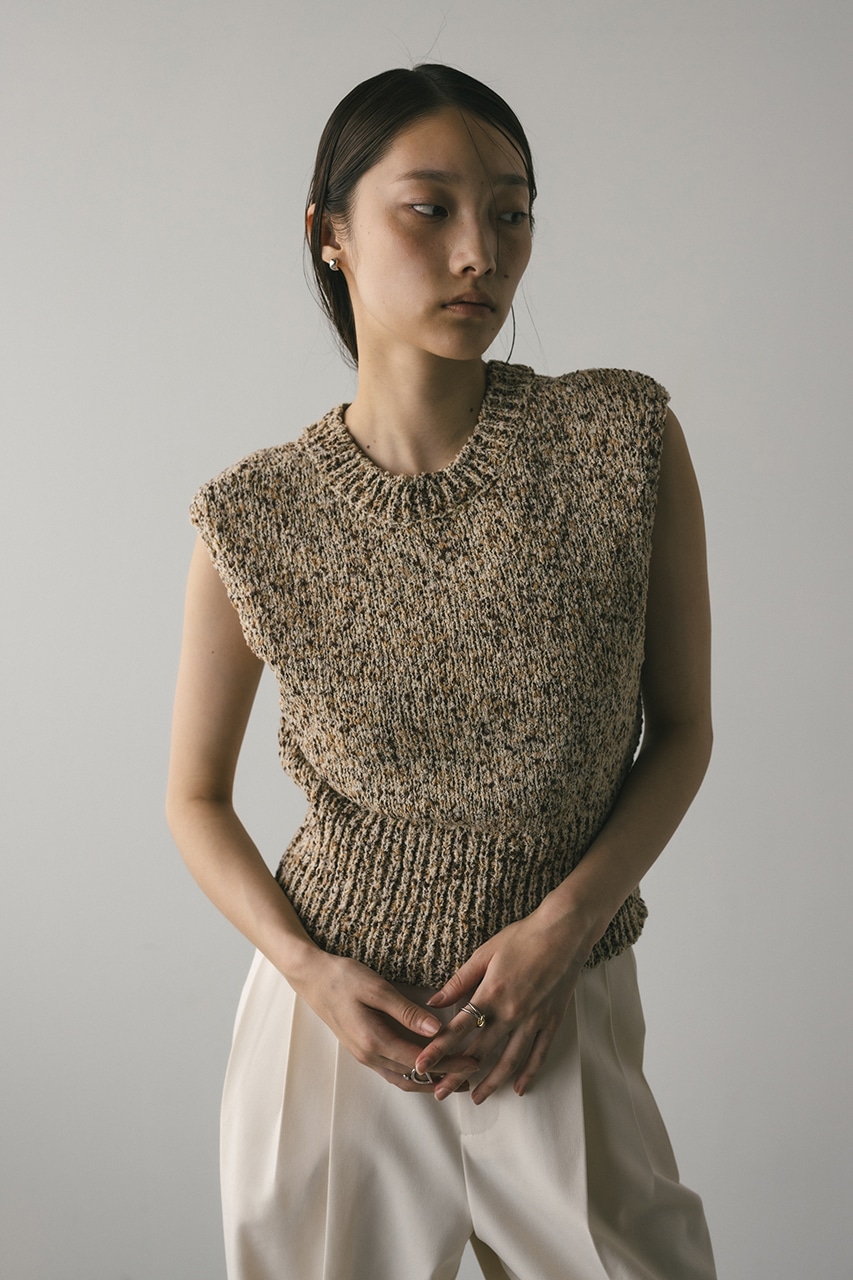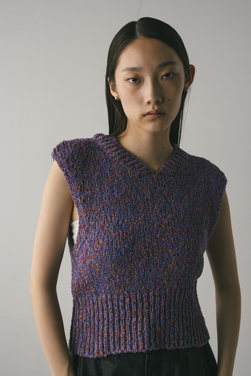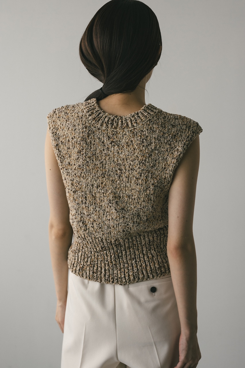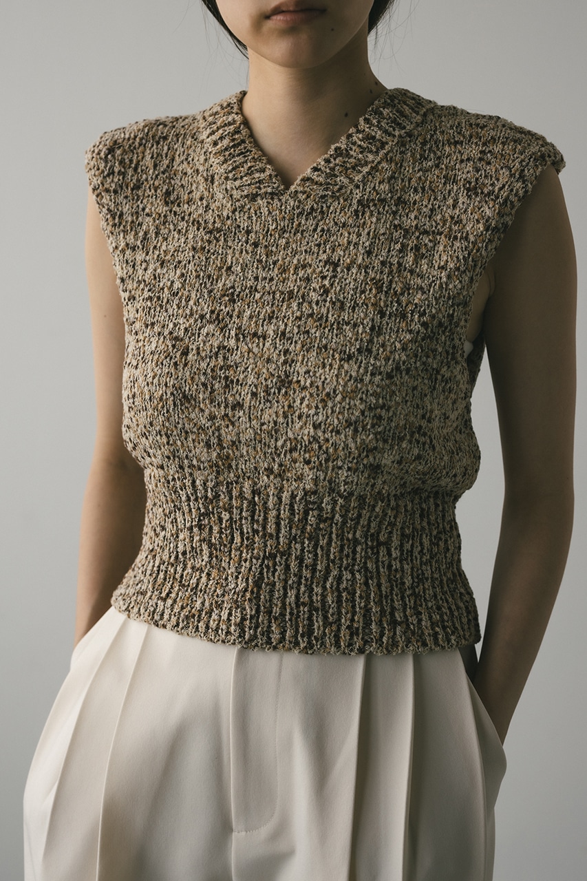 大きなネップが可愛いコンパクトニットベスト。前下がりを高めに設定し、モードな印象に仕立てた一枚。一枚ではもちろんインナーレイヤードでの着用もおすすめです。ストレッチあり、透け感なし。