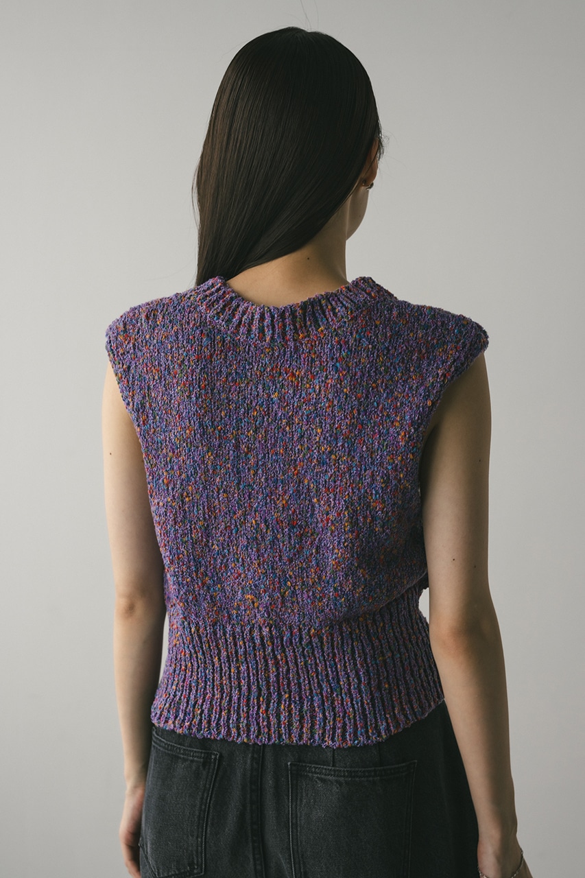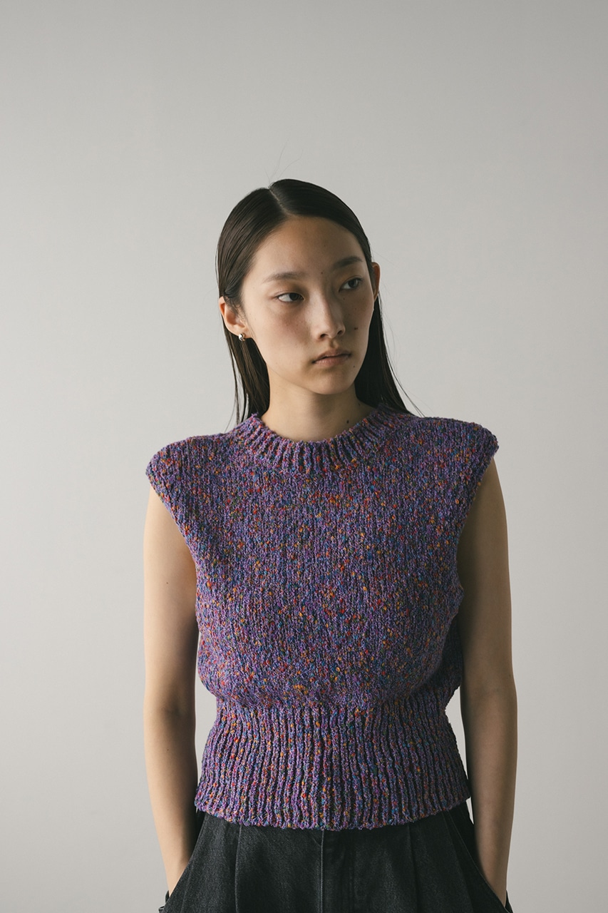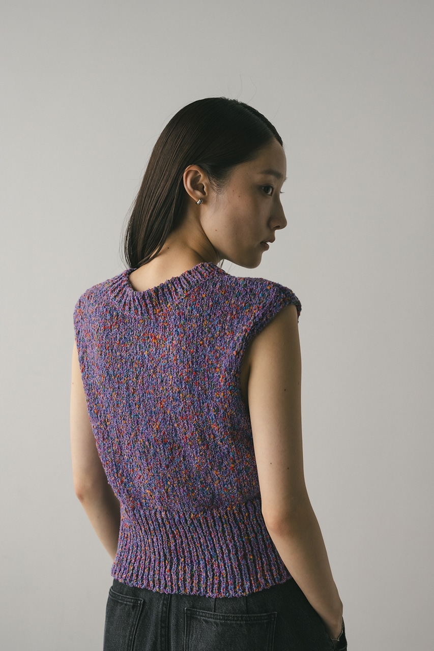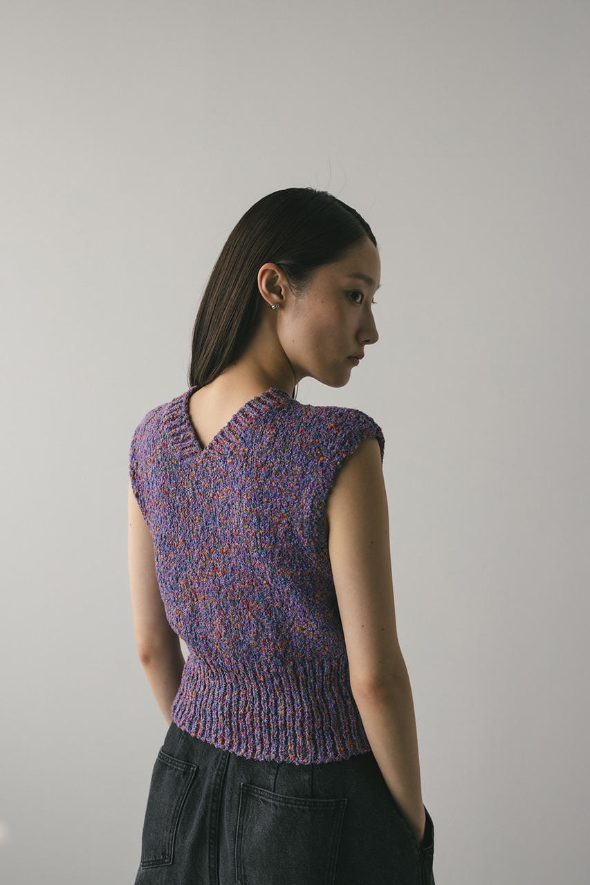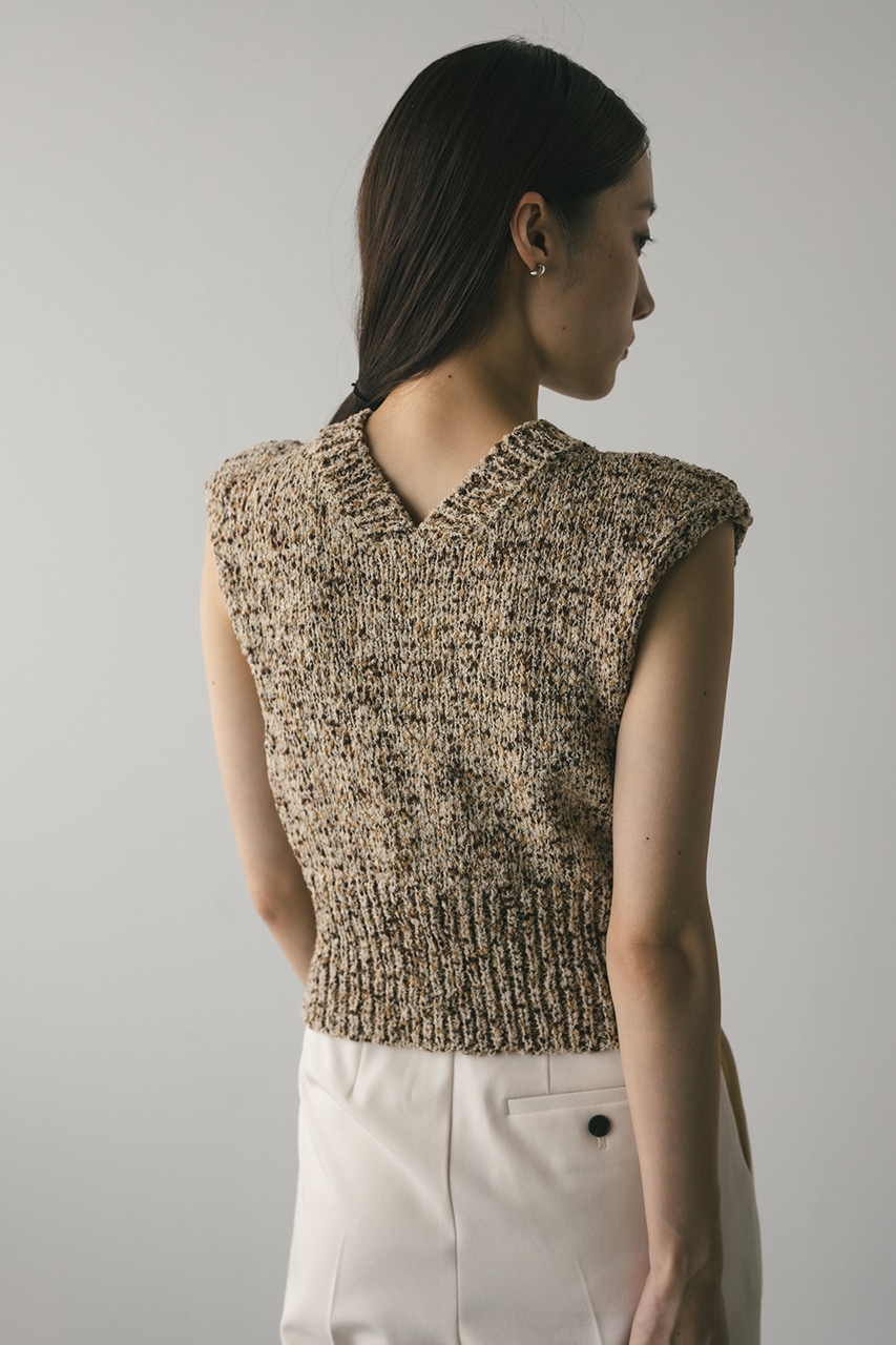 大きなネップが可愛いコンパクトニットベスト。前下がりを高めに設定し、モードな印象に仕立てた一枚。一枚ではもちろんインナーレイヤードでの着用もおすすめです。ストレッチあり、透け感なし。