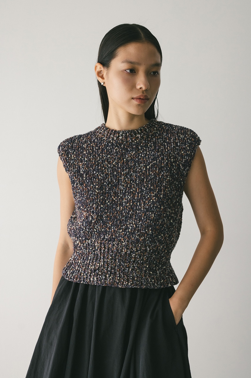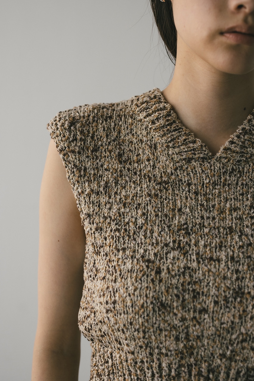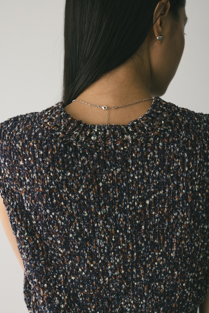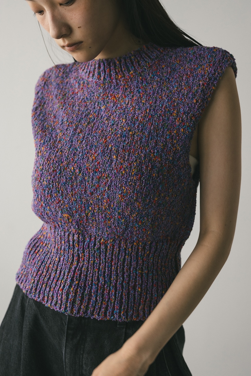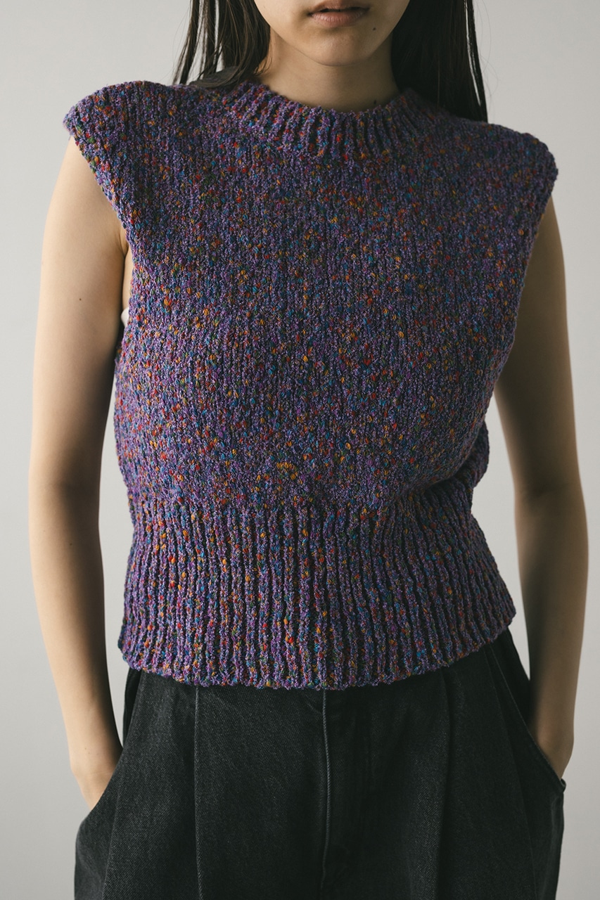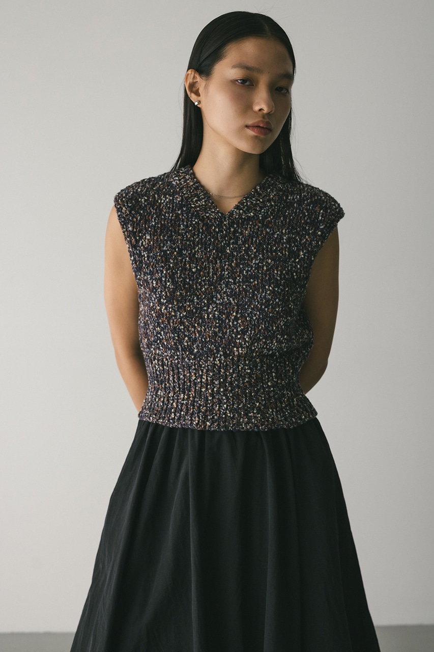大きなネップが可愛いコンパクトニットベスト。前下がりを高めに設定し、モードな印象に仕立てた一枚。一枚ではもちろんインナーレイヤードでの着用もおすすめです。ストレッチあり、透け感なし。