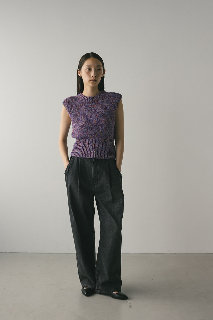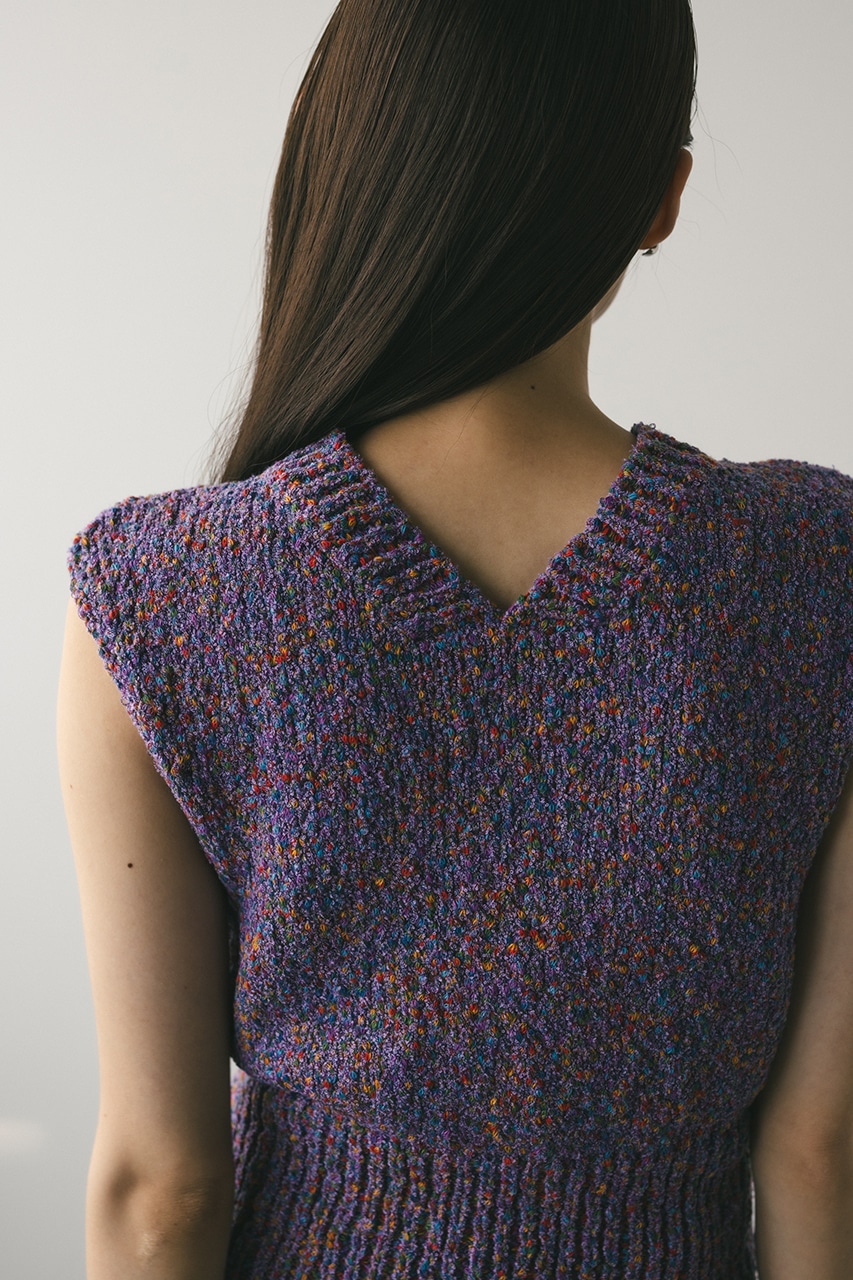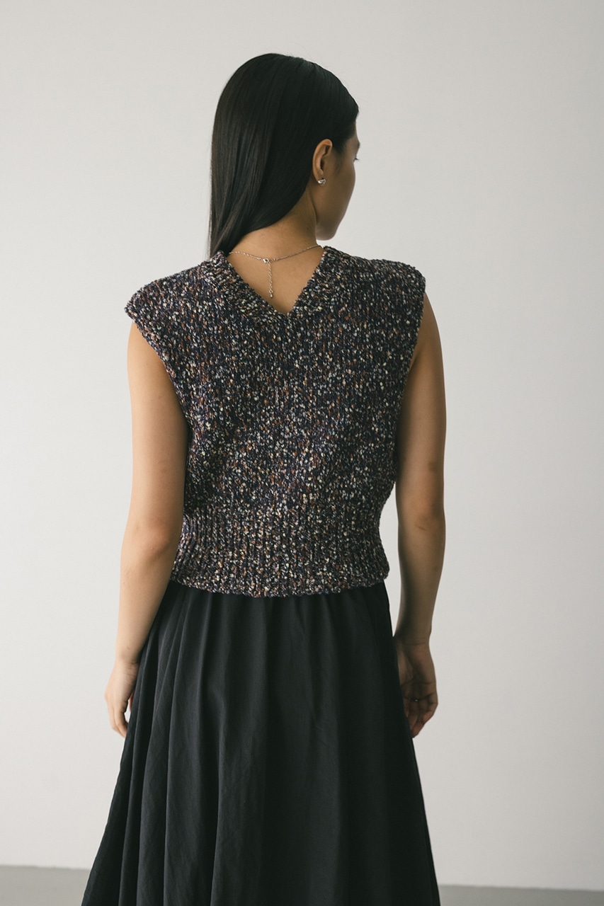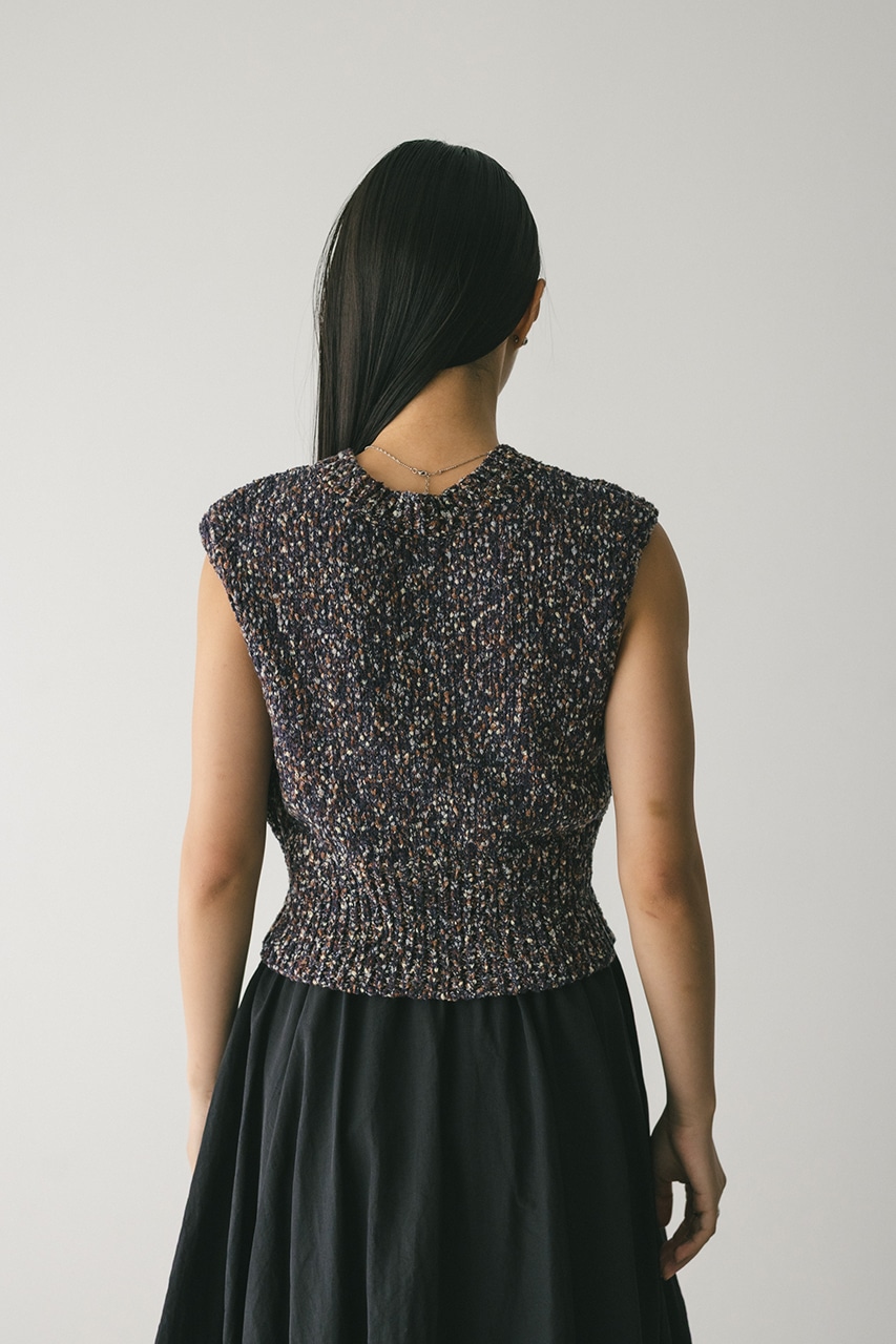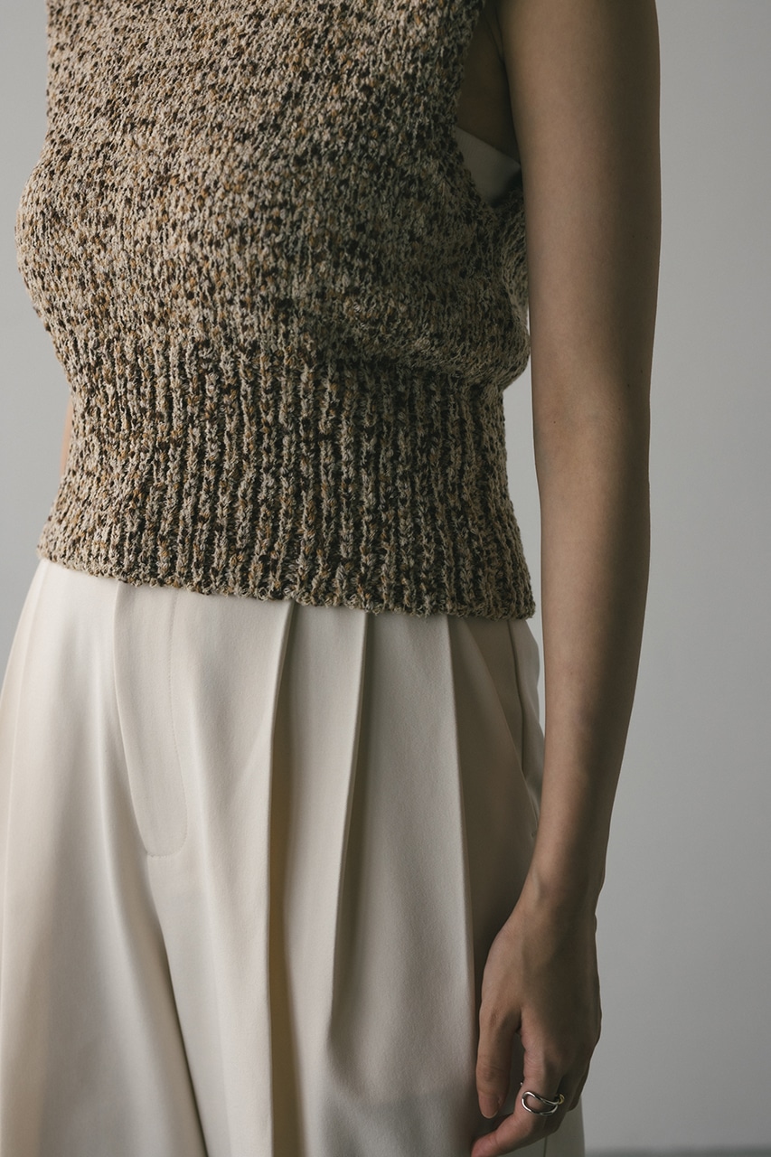 大きなネップが可愛いコンパクトニットベスト。前下がりを高めに設定し、モードな印象に仕立てた一枚。一枚ではもちろんインナーレイヤードでの着用もおすすめです。ストレッチあり、透け感なし。