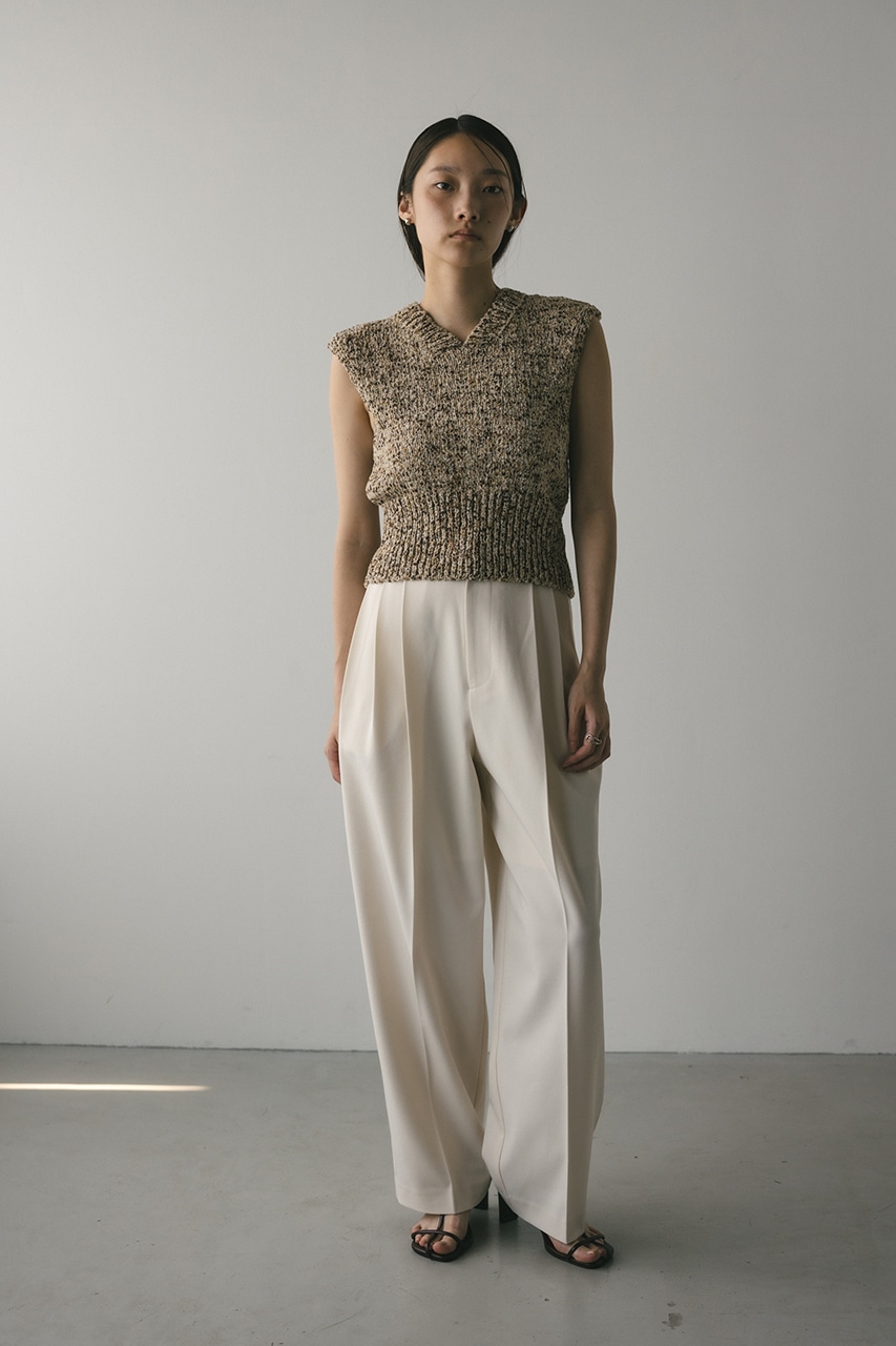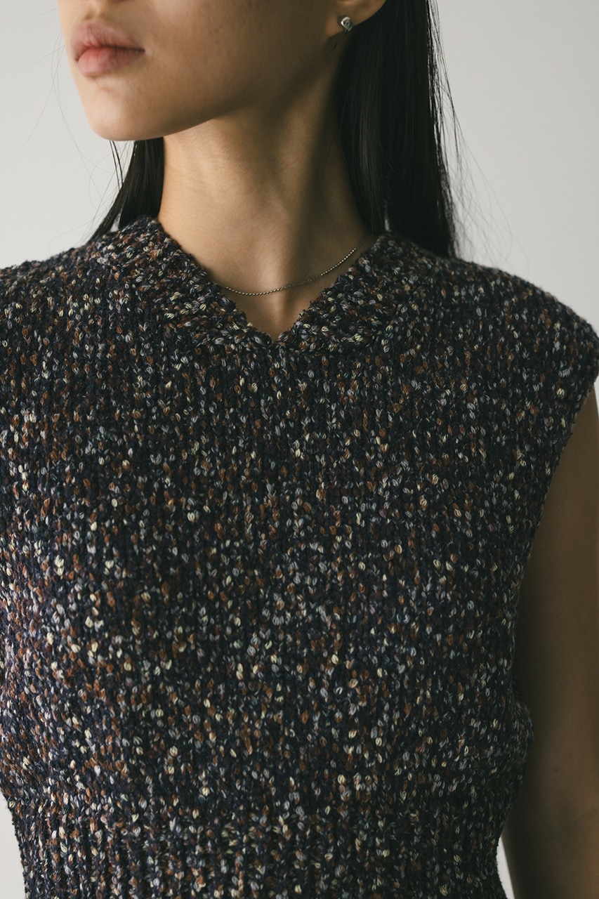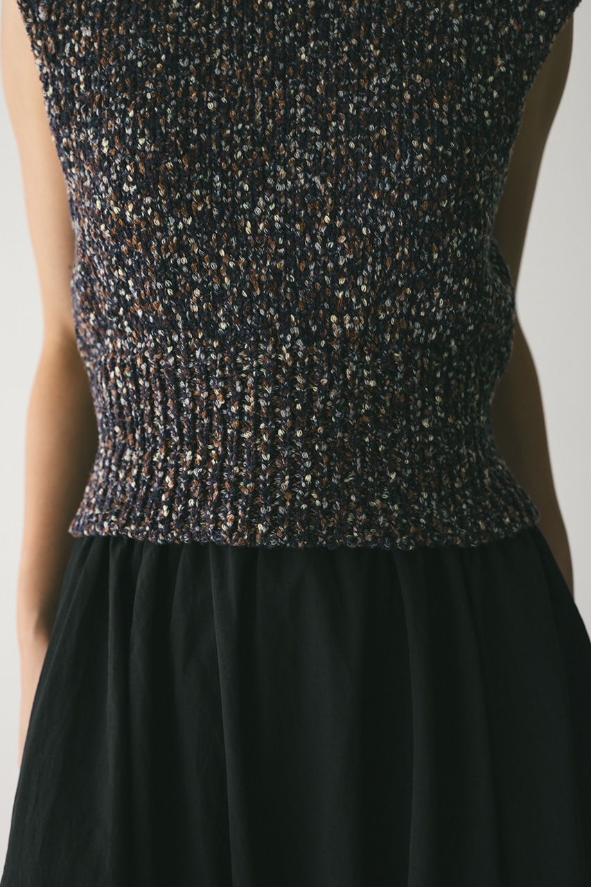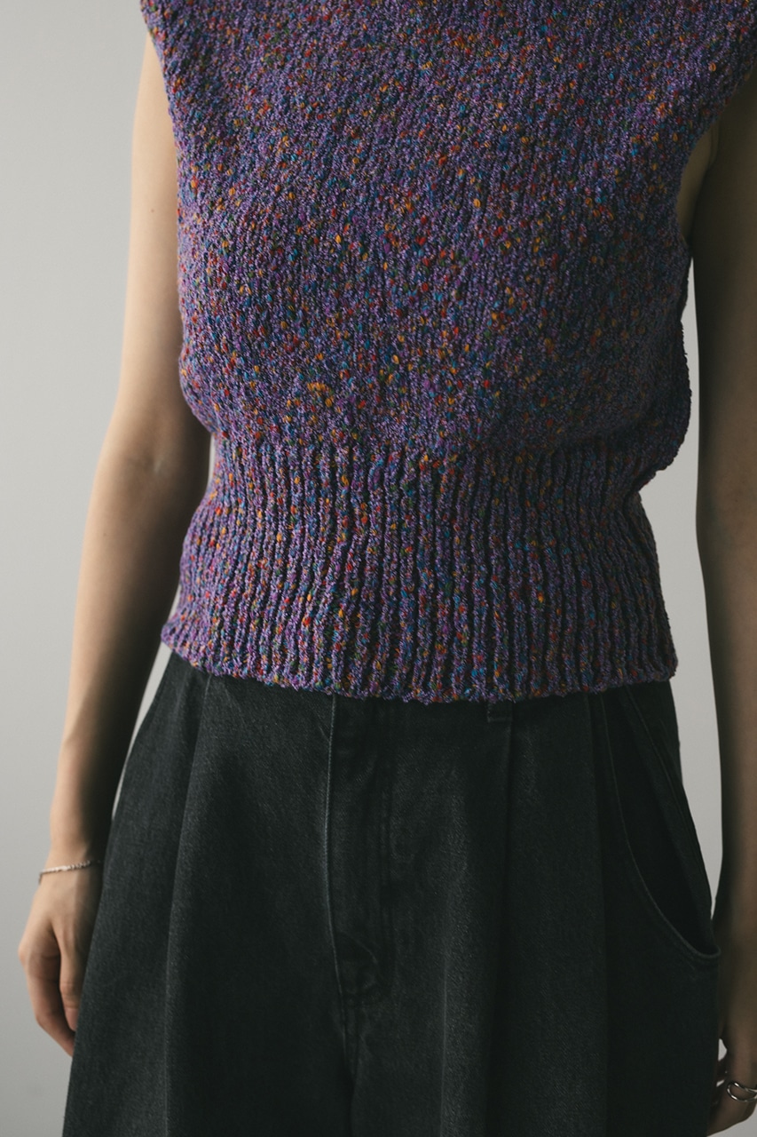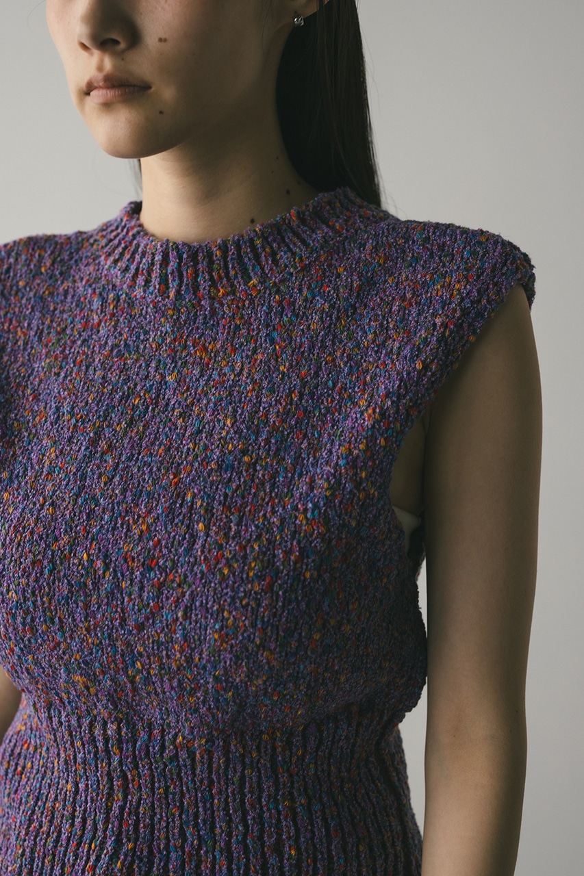 大きなネップが可愛いコンパクトニットベスト。前下がりを高めに設定し、モードな印象に仕立てた一枚。一枚ではもちろんインナーレイヤードでの着用もおすすめです。ストレッチあり、透け感なし。
