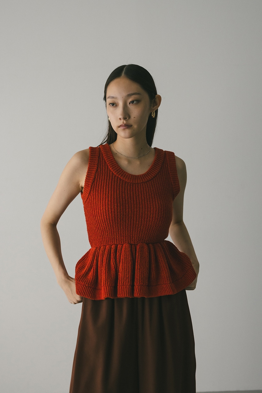ドライなコットンリネンのミドルゲージで編み立てたペプラムシルエットが映えるニットタンク。すっきりとしたラウンドネックとミドルゲージの編地がスタイリングにこなれ感をプラス。カジュアルにもフェミニンにも着用いただけます。ストレッチあり、透け感なし。