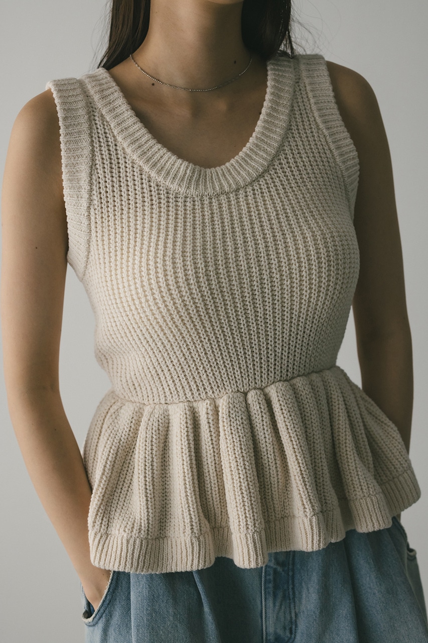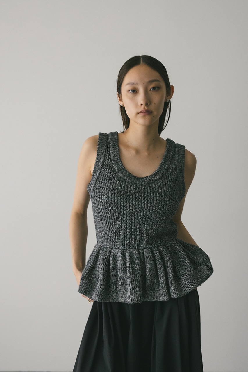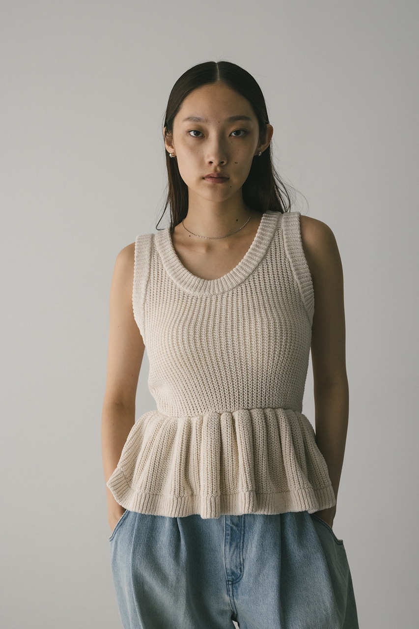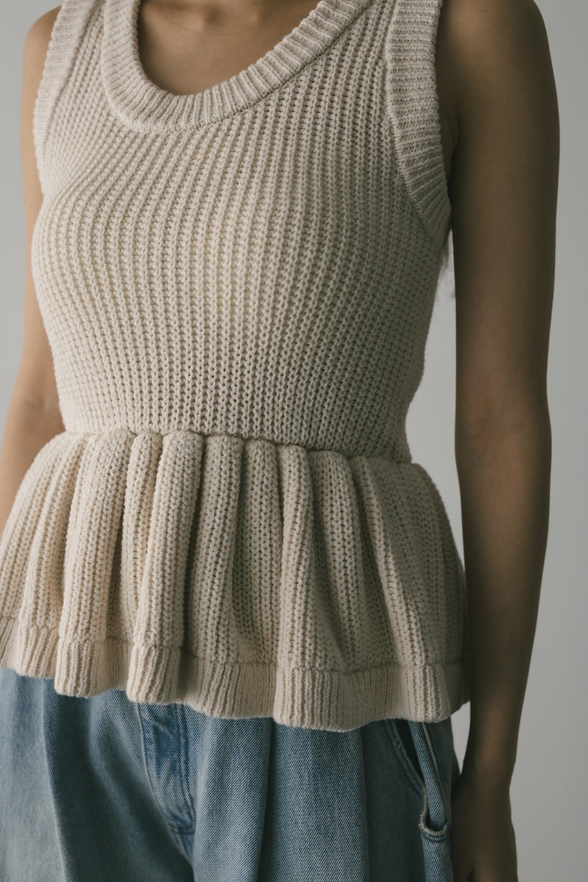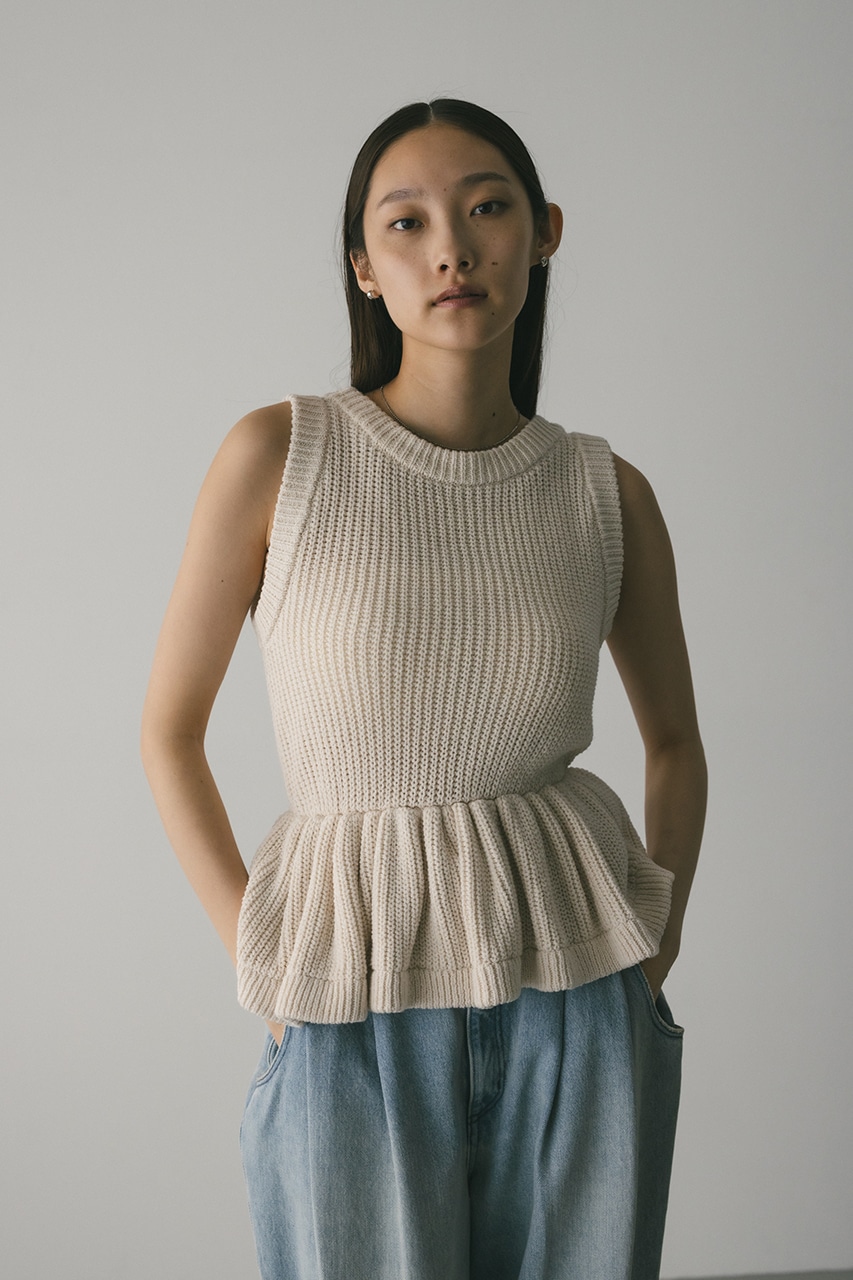 ドライなコットンリネンのミドルゲージで編み立てたペプラムシルエットが映えるニットタンク。すっきりとしたラウンドネックとミドルゲージの編地がスタイリングにこなれ感をプラス。カジュアルにもフェミニンにも着用いただけます。ストレッチあり、透け感なし。