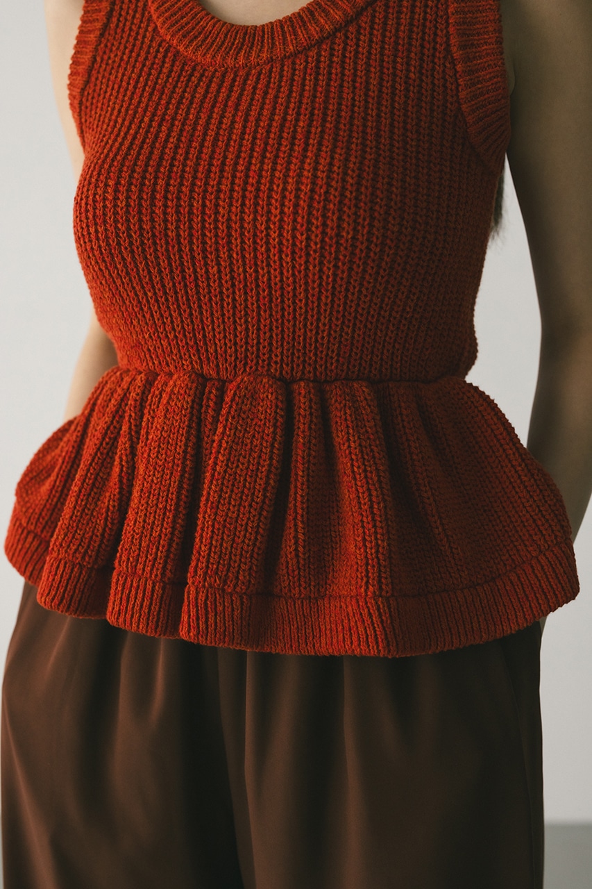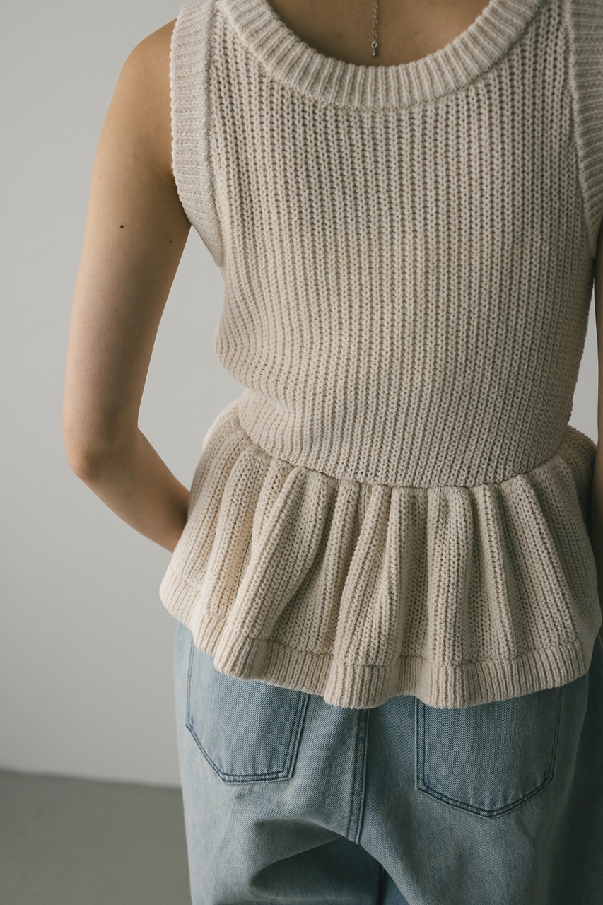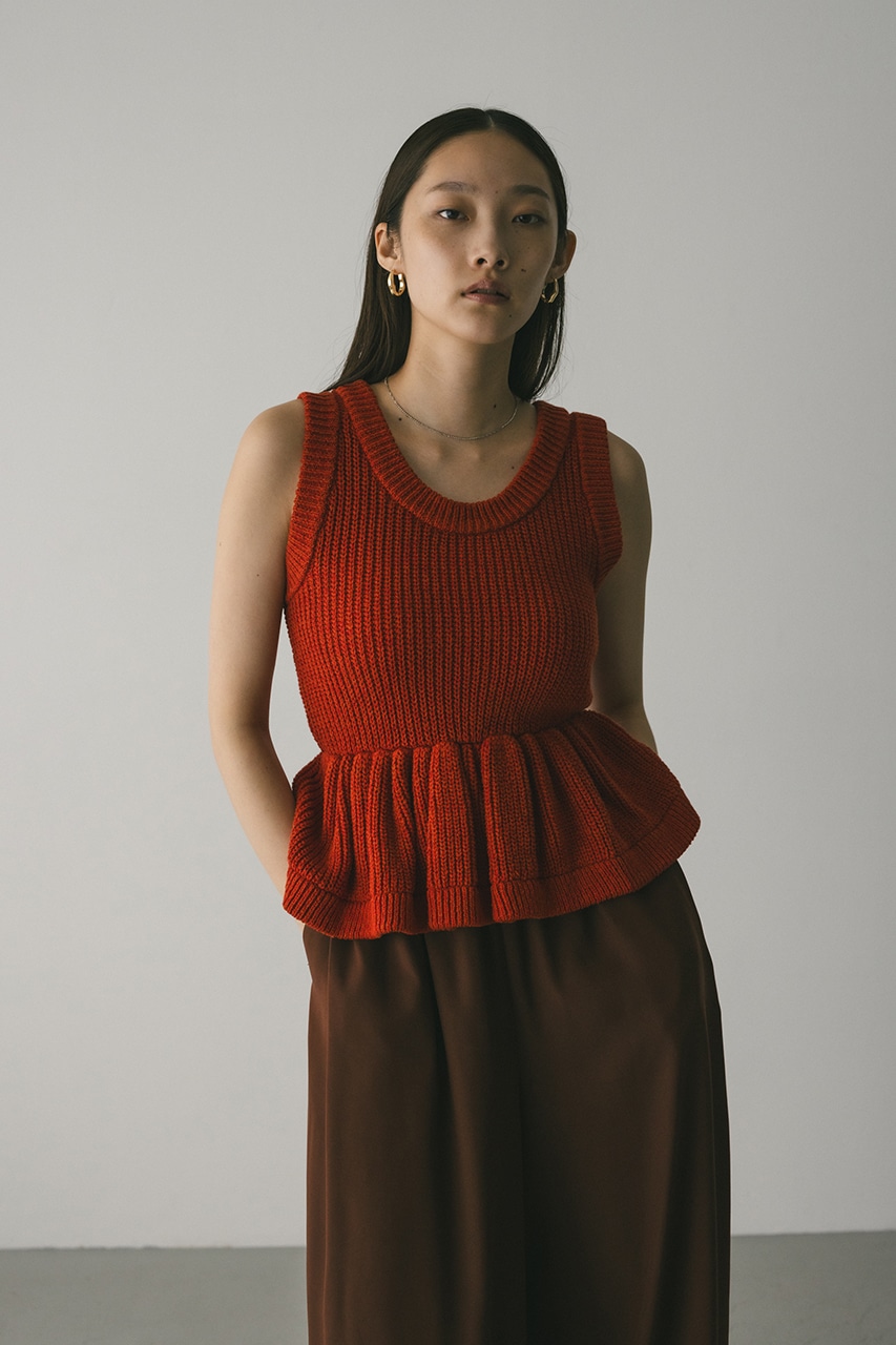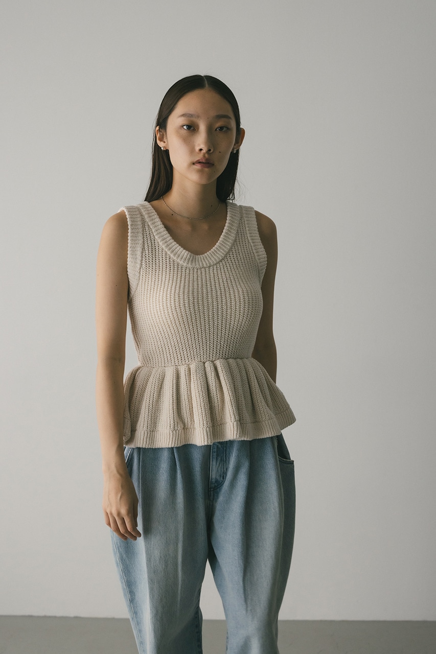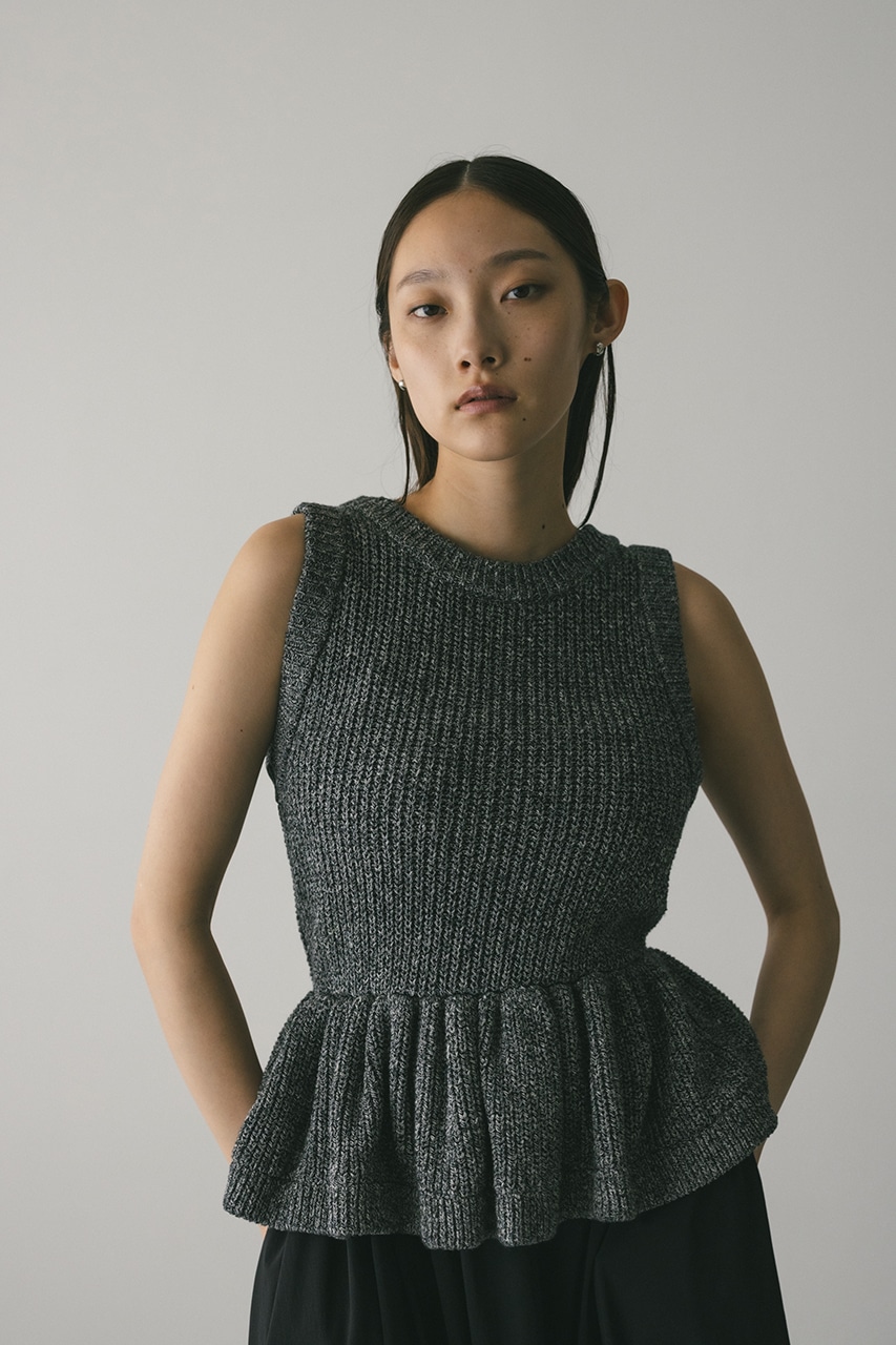 ドライなコットンリネンのミドルゲージで編み立てたペプラムシルエットが映えるニットタンク。すっきりとしたラウンドネックとミドルゲージの編地がスタイリングにこなれ感をプラス。カジュアルにもフェミニンにも着用いただけます。ストレッチあり、透け感なし。