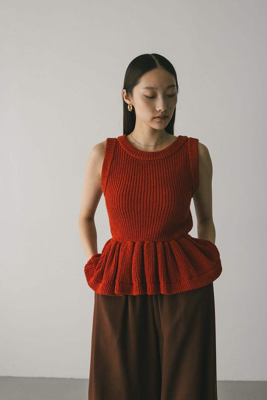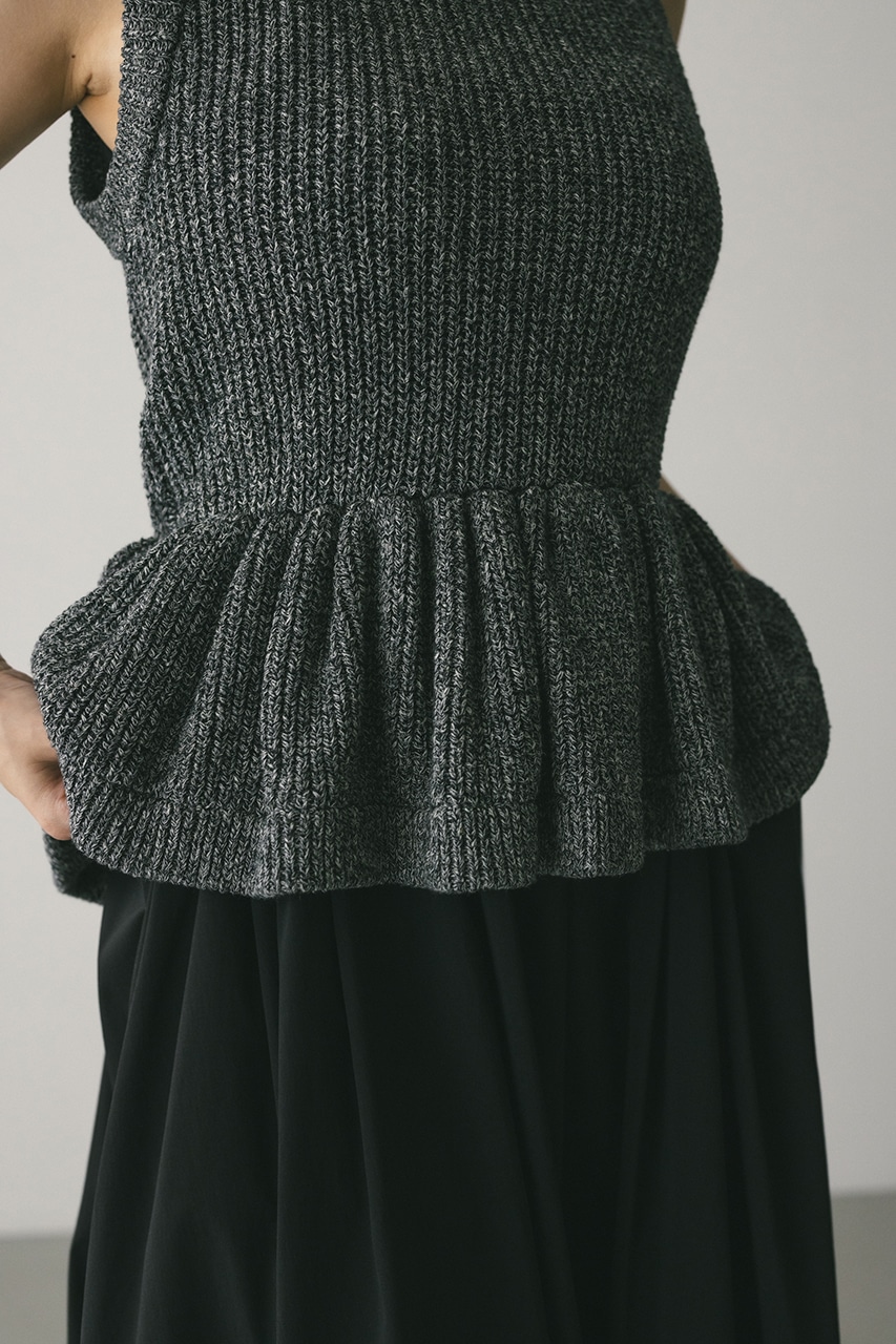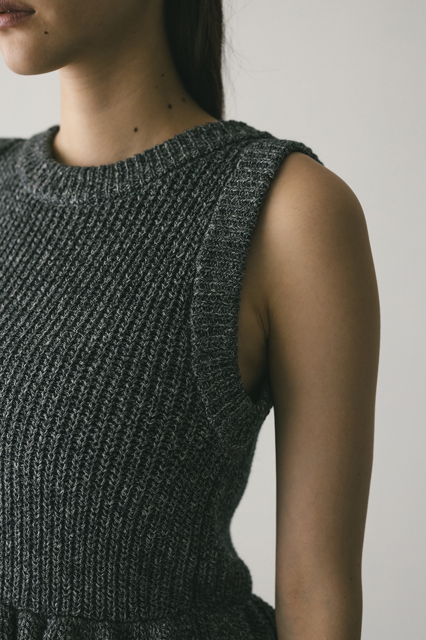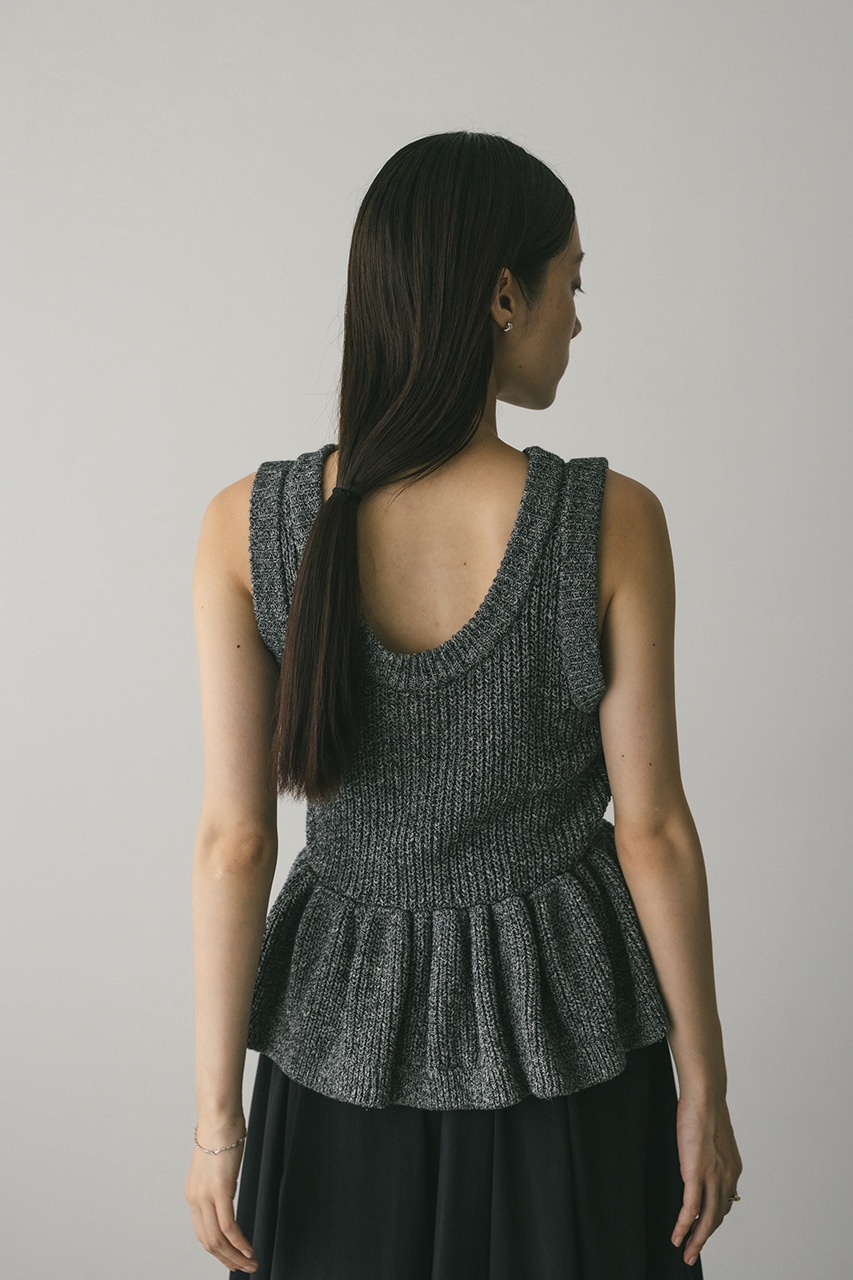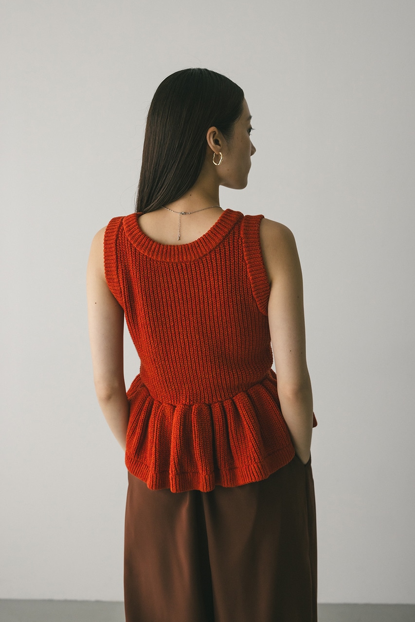 ドライなコットンリネンのミドルゲージで編み立てたペプラムシルエットが映えるニットタンク。すっきりとしたラウンドネックとミドルゲージの編地がスタイリングにこなれ感をプラス。カジュアルにもフェミニンにも着用いただけます。ストレッチあり、透け感なし。
