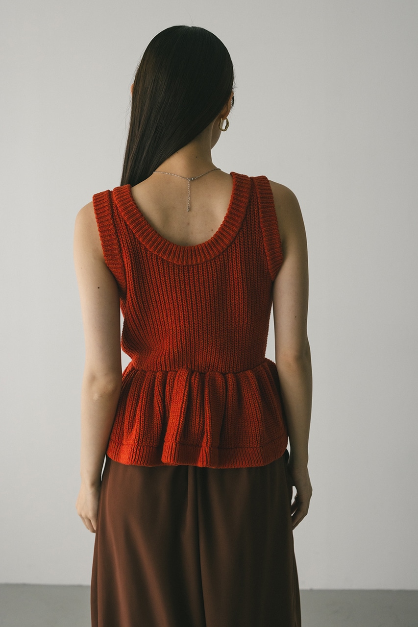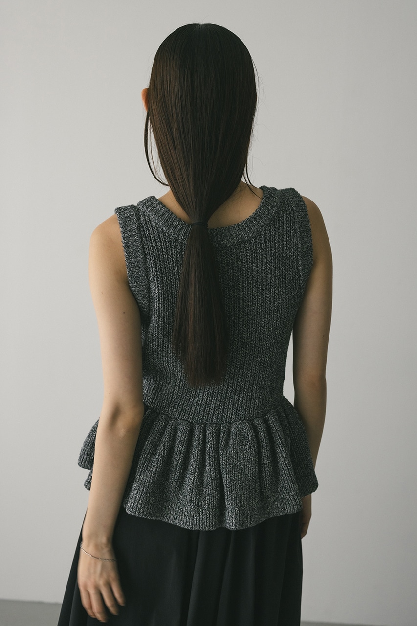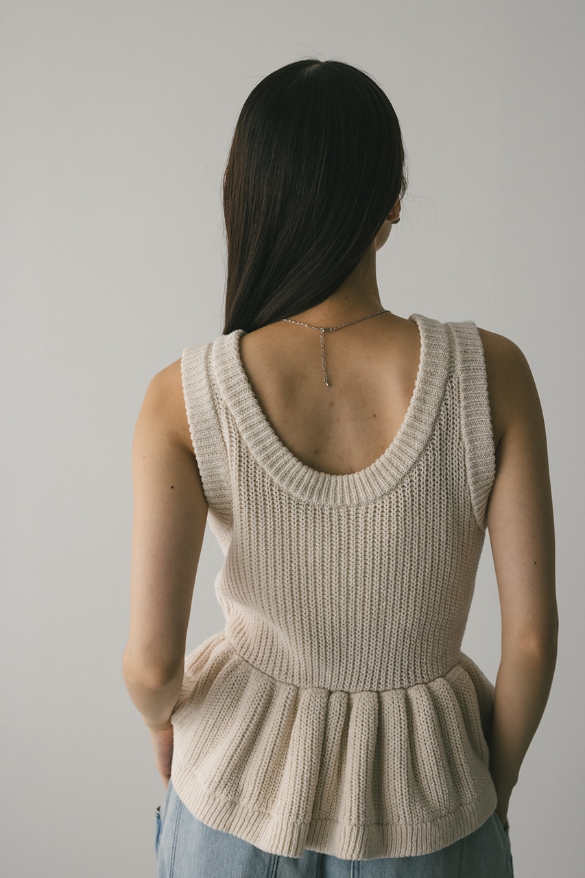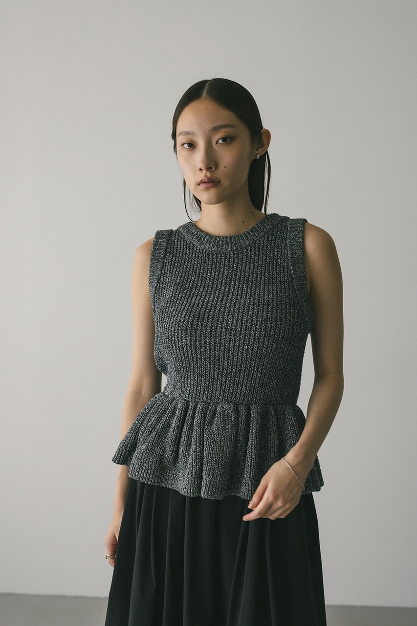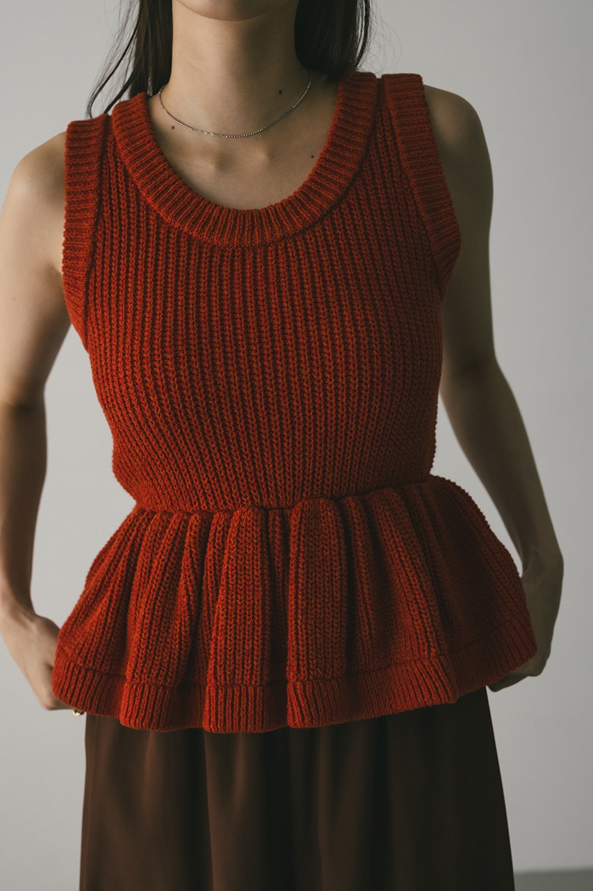 ドライなコットンリネンのミドルゲージで編み立てたペプラムシルエットが映えるニットタンク。すっきりとしたラウンドネックとミドルゲージの編地がスタイリングにこなれ感をプラス。カジュアルにもフェミニンにも着用いただけます。ストレッチあり、透け感なし。