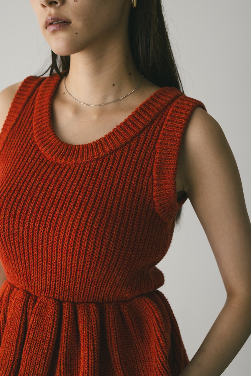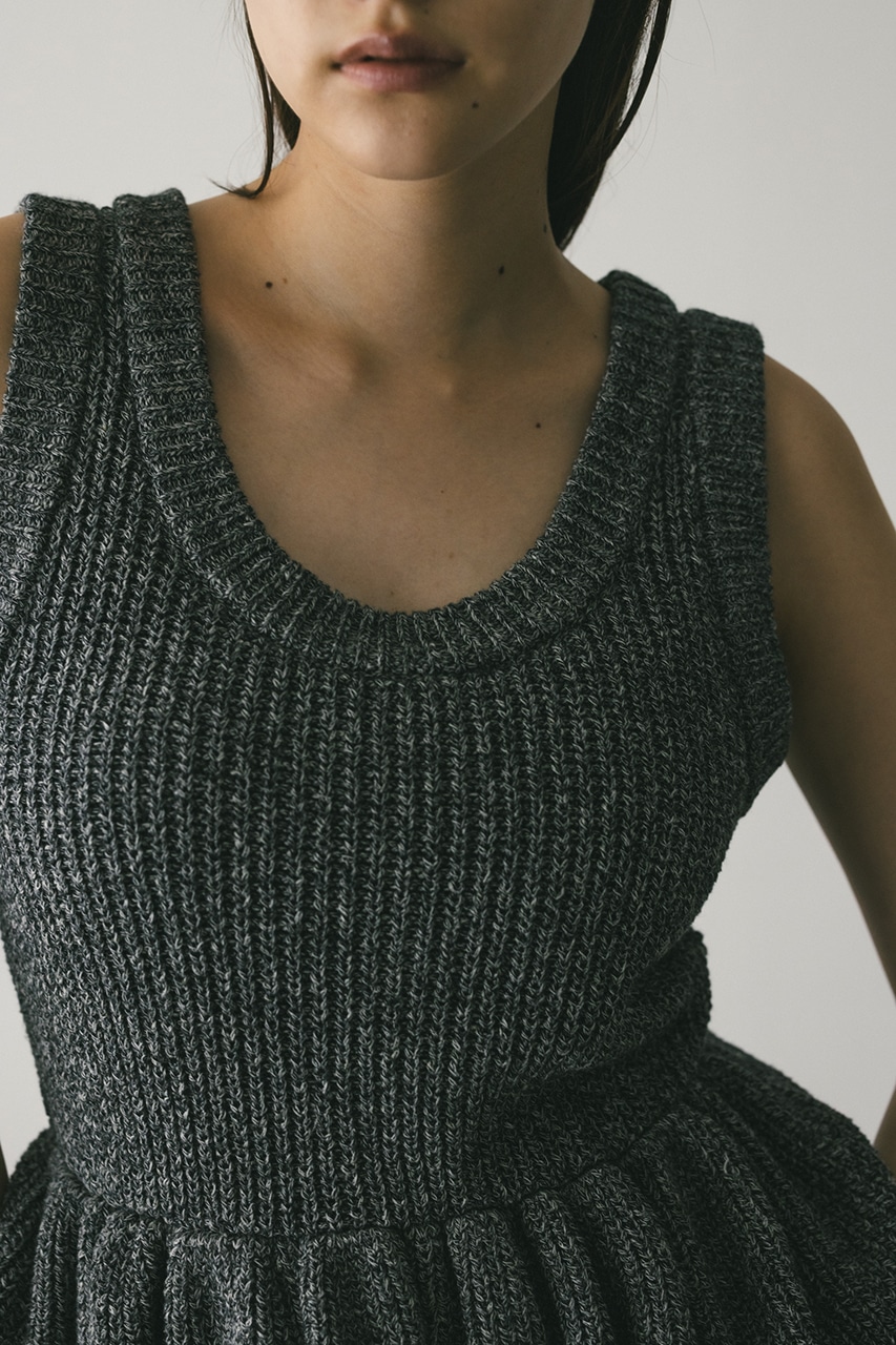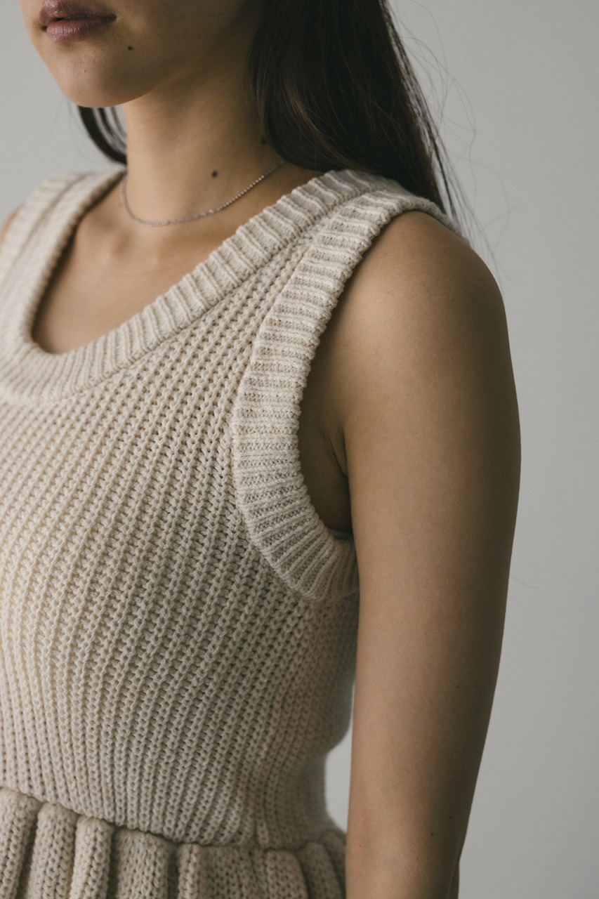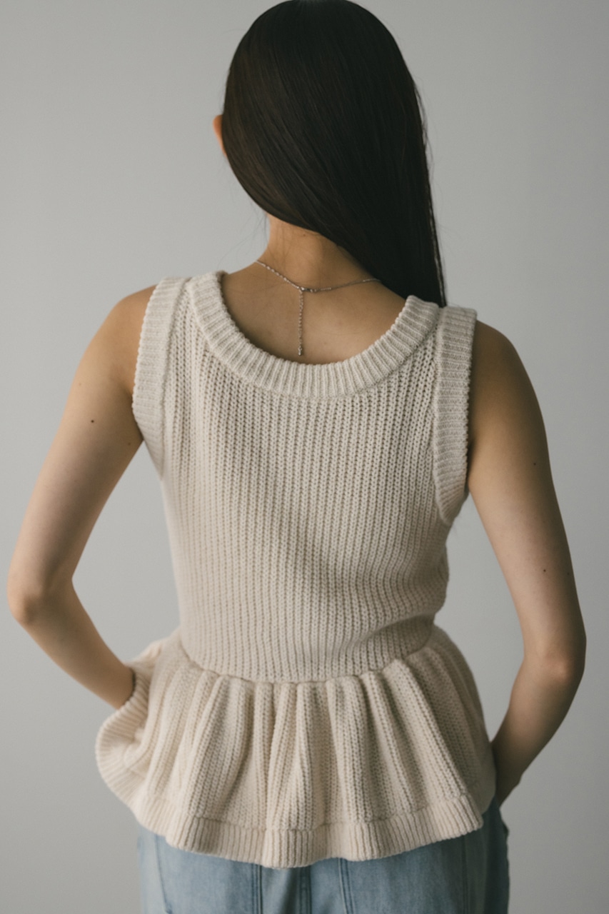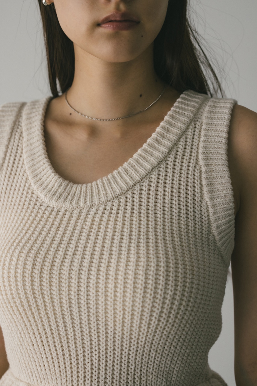ドライなコットンリネンのミドルゲージで編み立てたペプラムシルエットが映えるニットタンク。すっきりとしたラウンドネックとミドルゲージの編地がスタイリングにこなれ感をプラス。カジュアルにもフェミニンにも着用いただけます。ストレッチあり、透け感なし。
