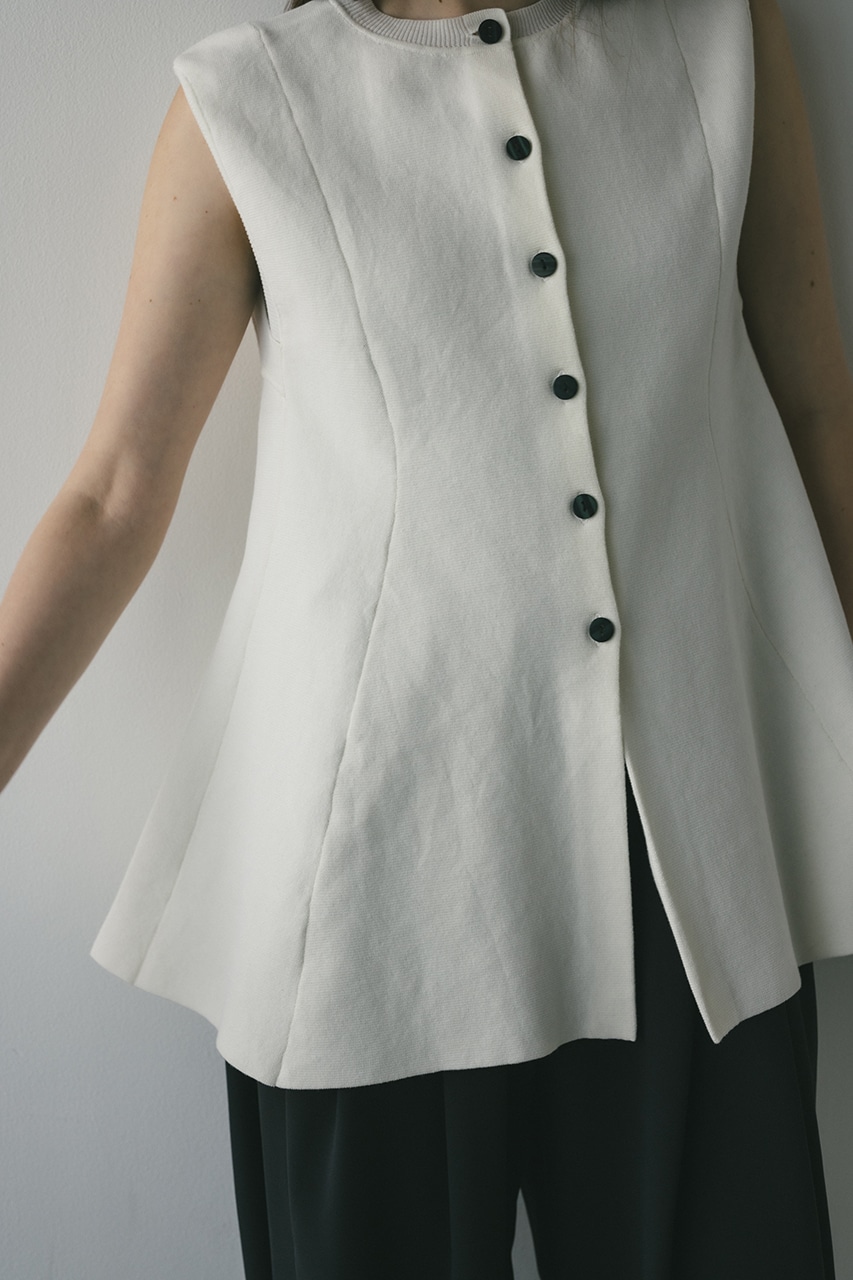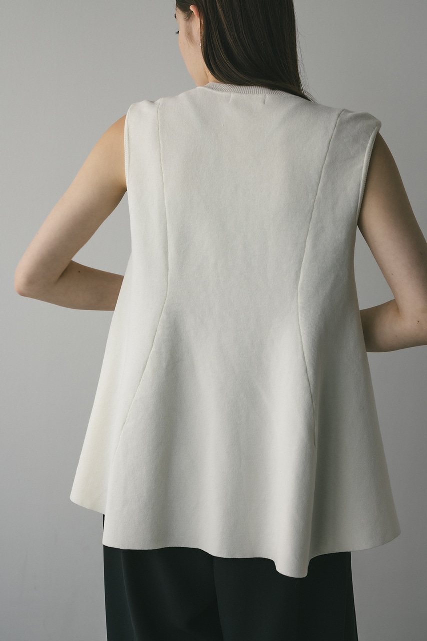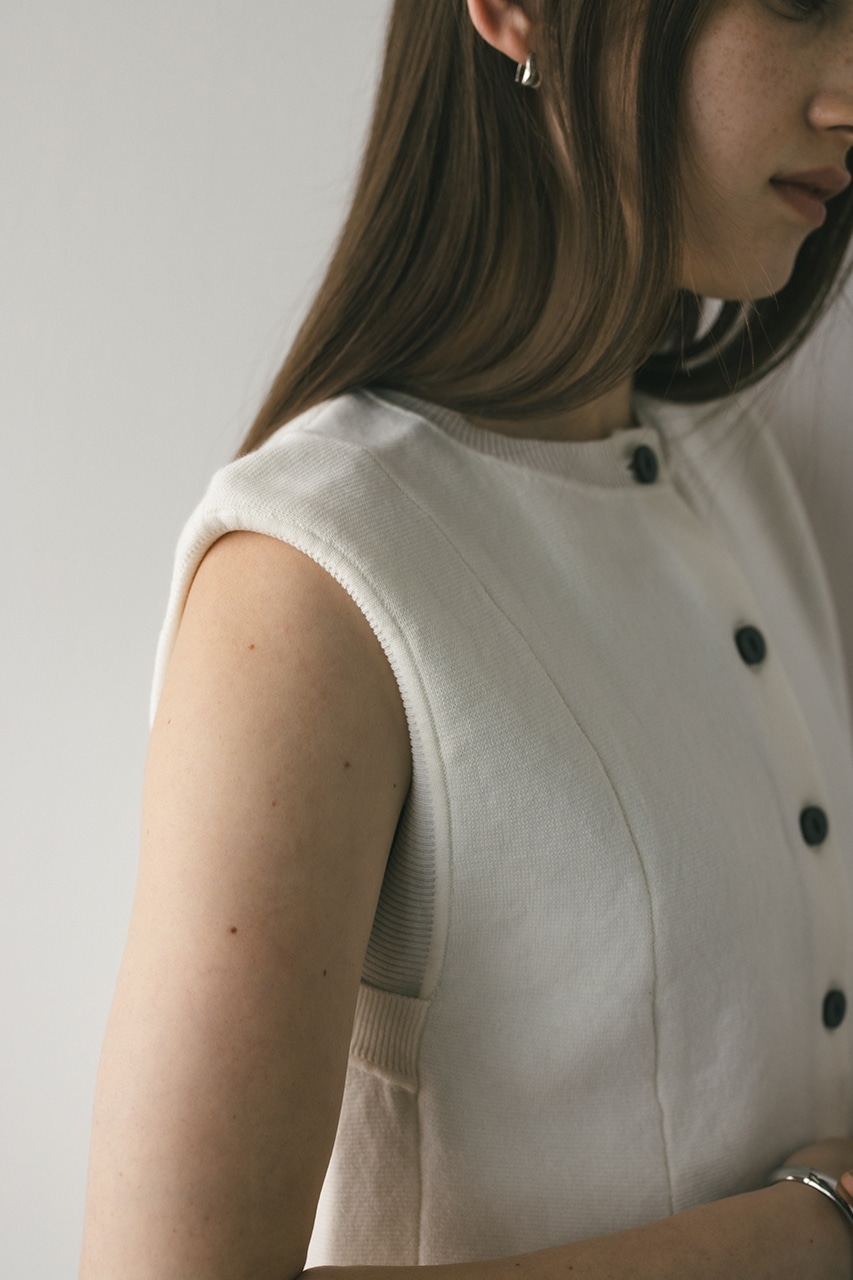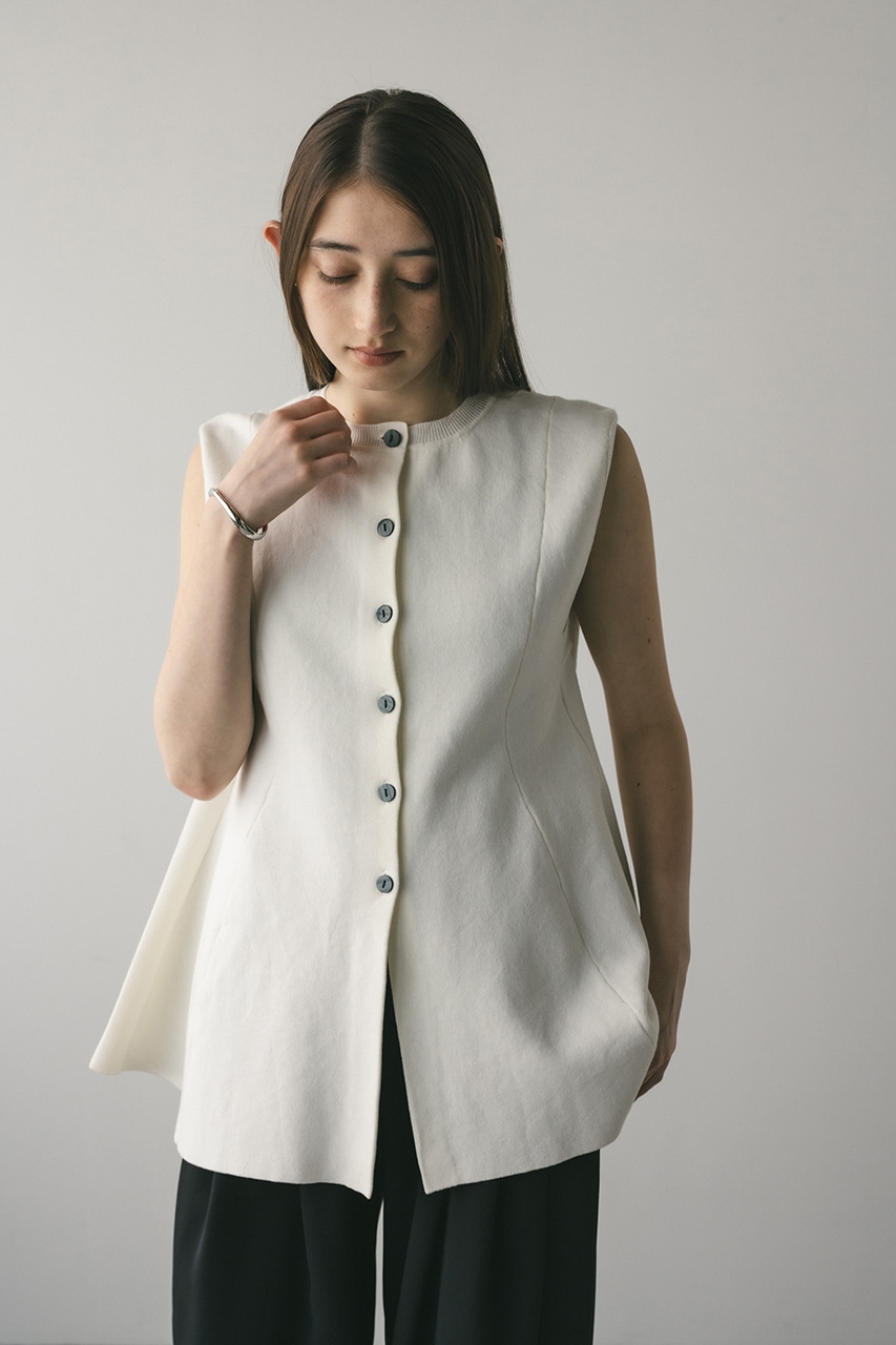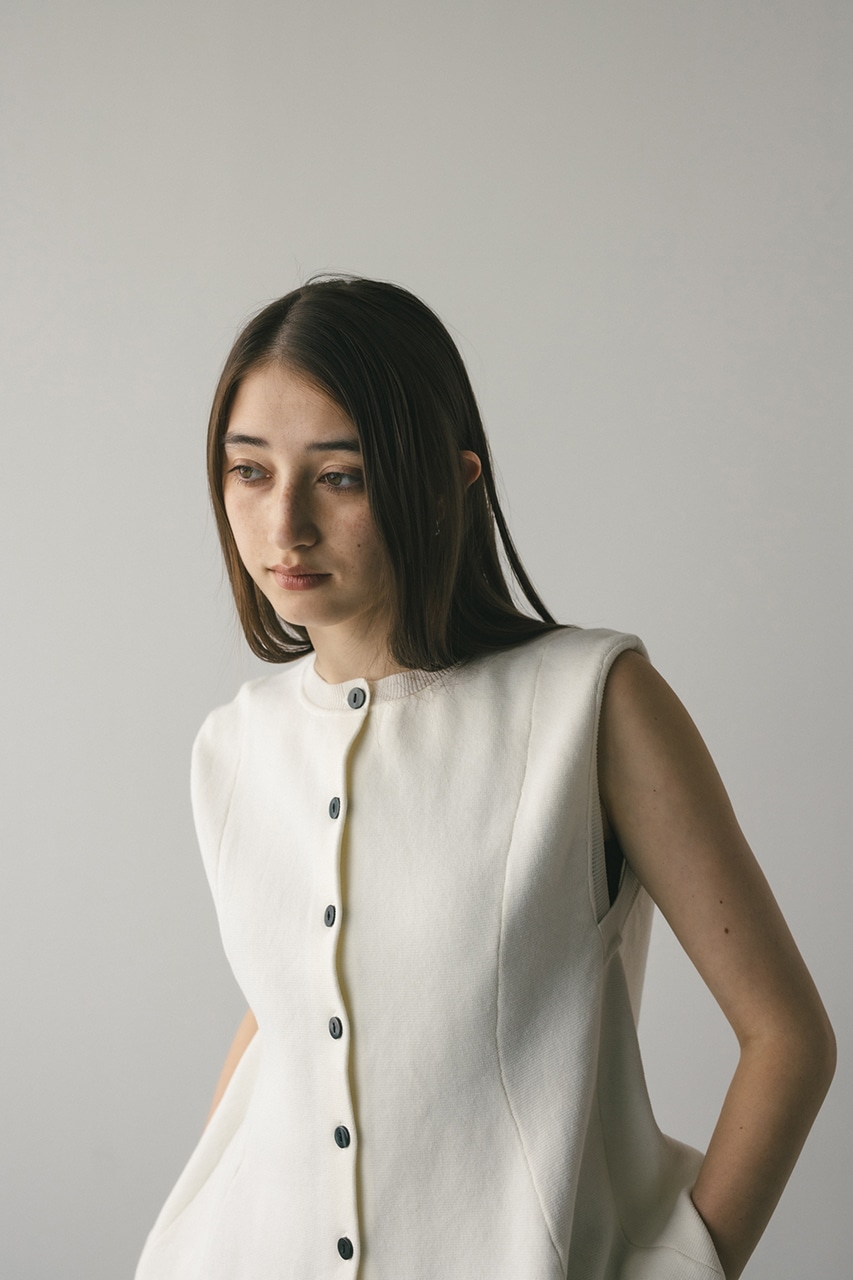 ドライなハイツイストコットンで編み立てたシルエットが可愛いニットベスト。身体のラインをすっきり見せるリンキングフレアとモードなショルダータックデティールがポイントです。透け感なし、ストレッチあり。