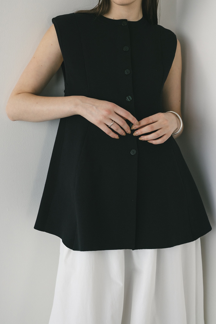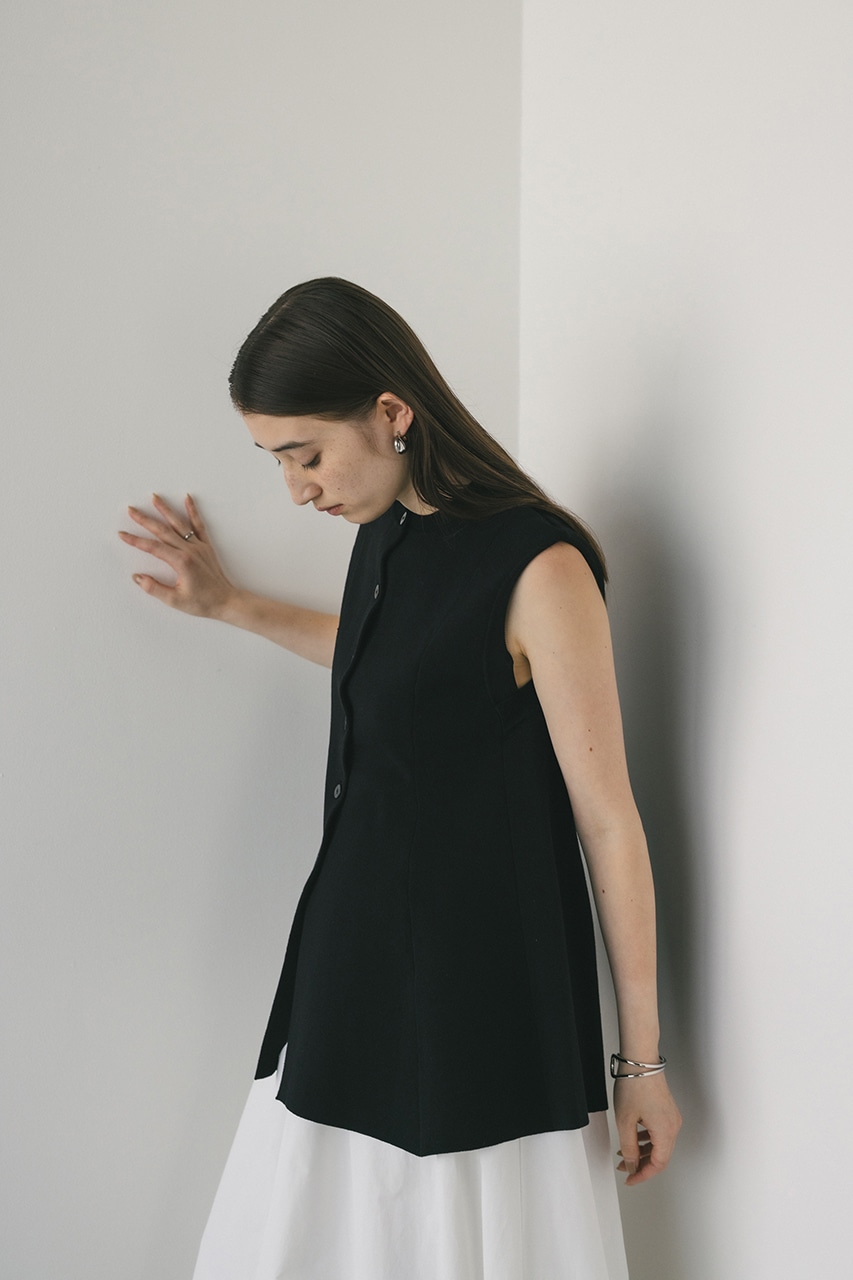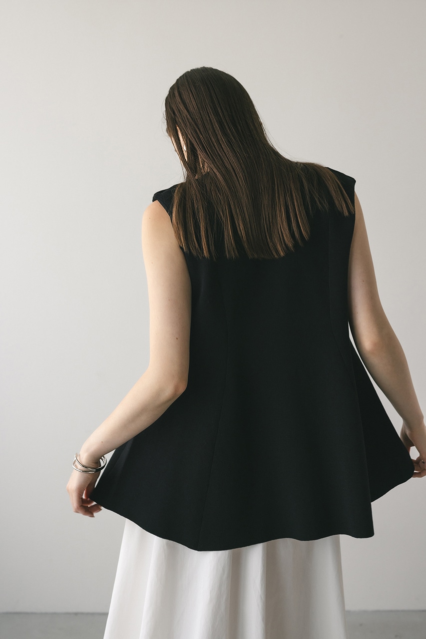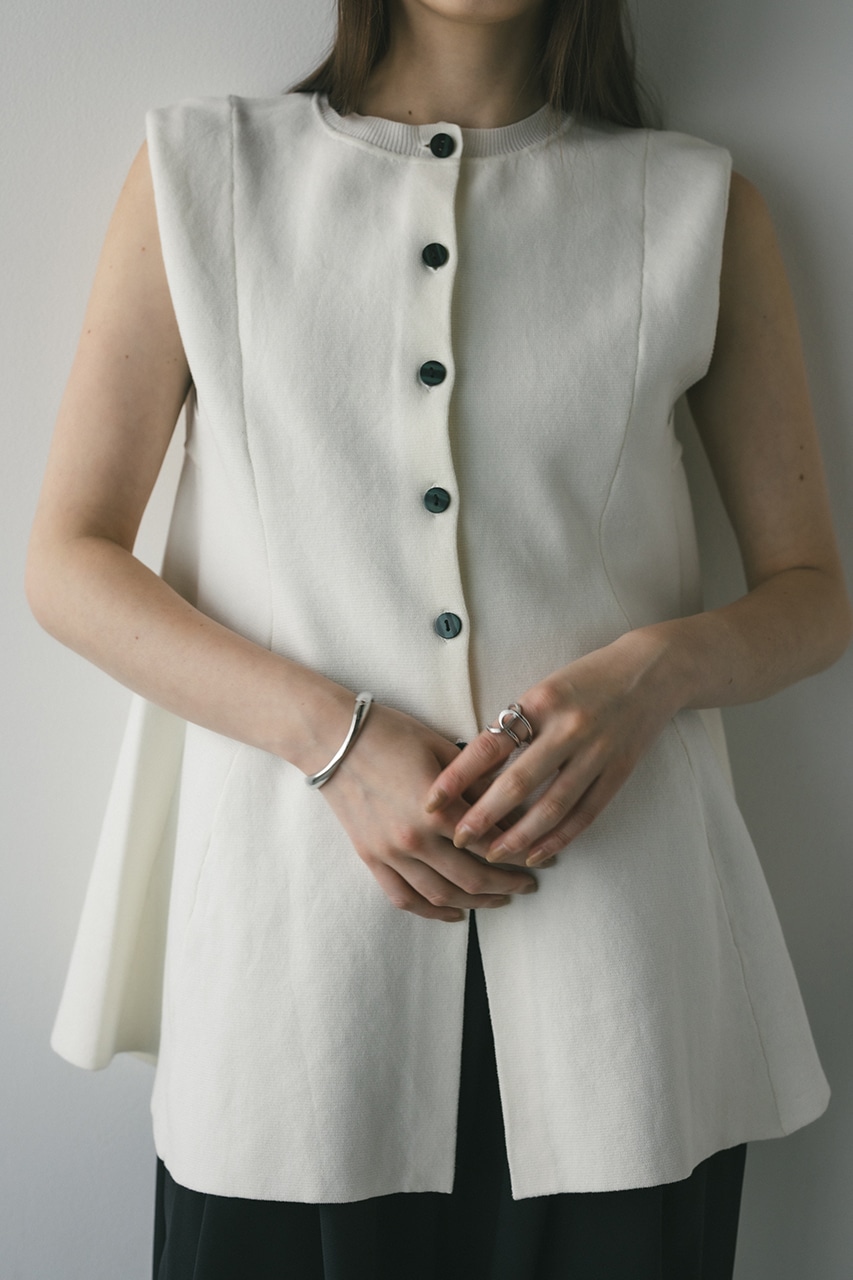 ドライなハイツイストコットンで編み立てたシルエットが可愛いニットベスト。身体のラインをすっきり見せるリンキングフレアとモードなショルダータックデティールがポイントです。透け感なし、ストレッチあり。