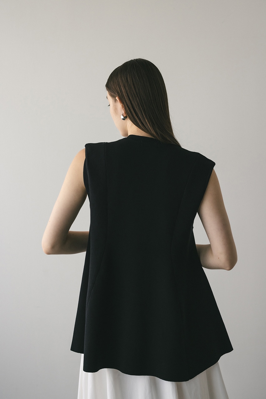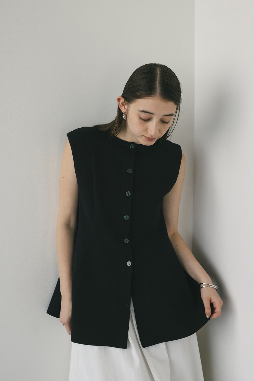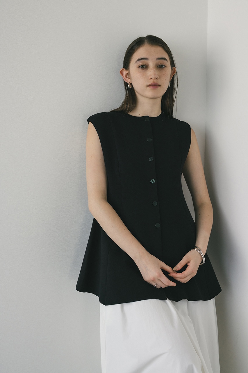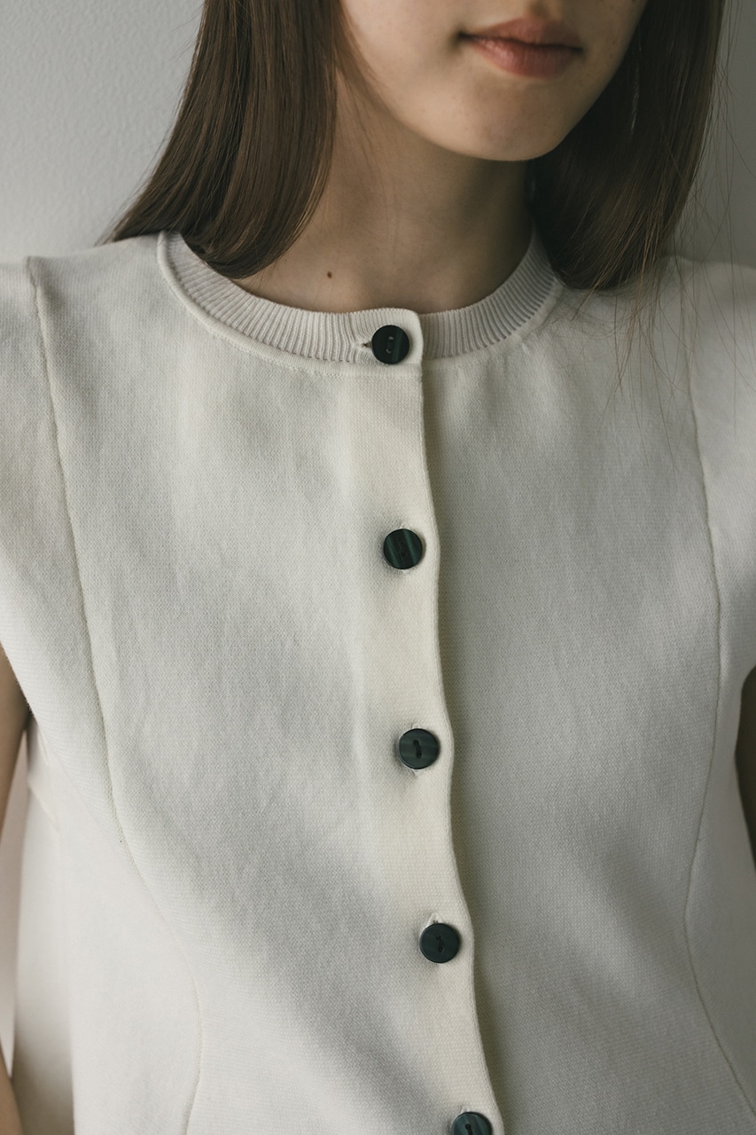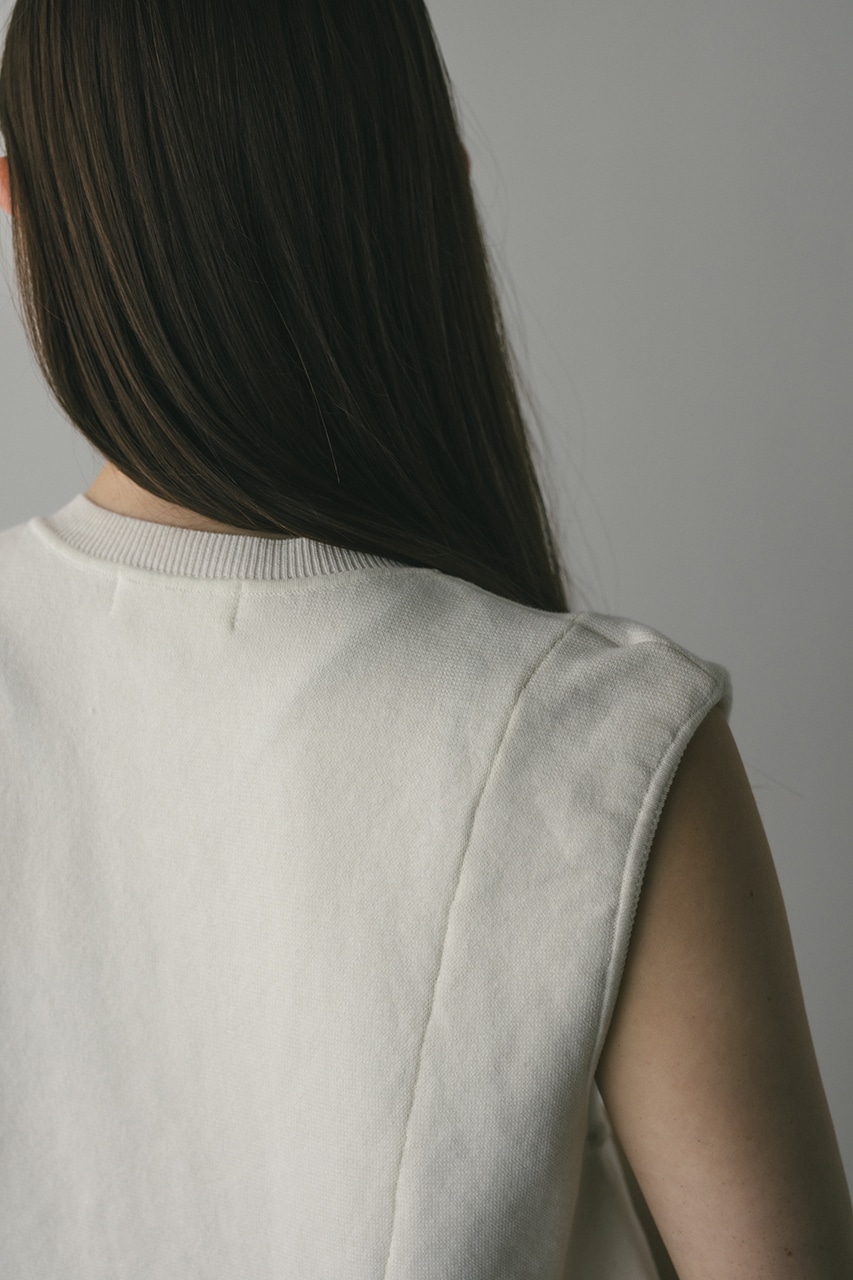 ドライなハイツイストコットンで編み立てたシルエットが可愛いニットベスト。身体のラインをすっきり見せるリンキングフレアとモードなショルダータックデティールがポイントです。透け感なし、ストレッチあり。