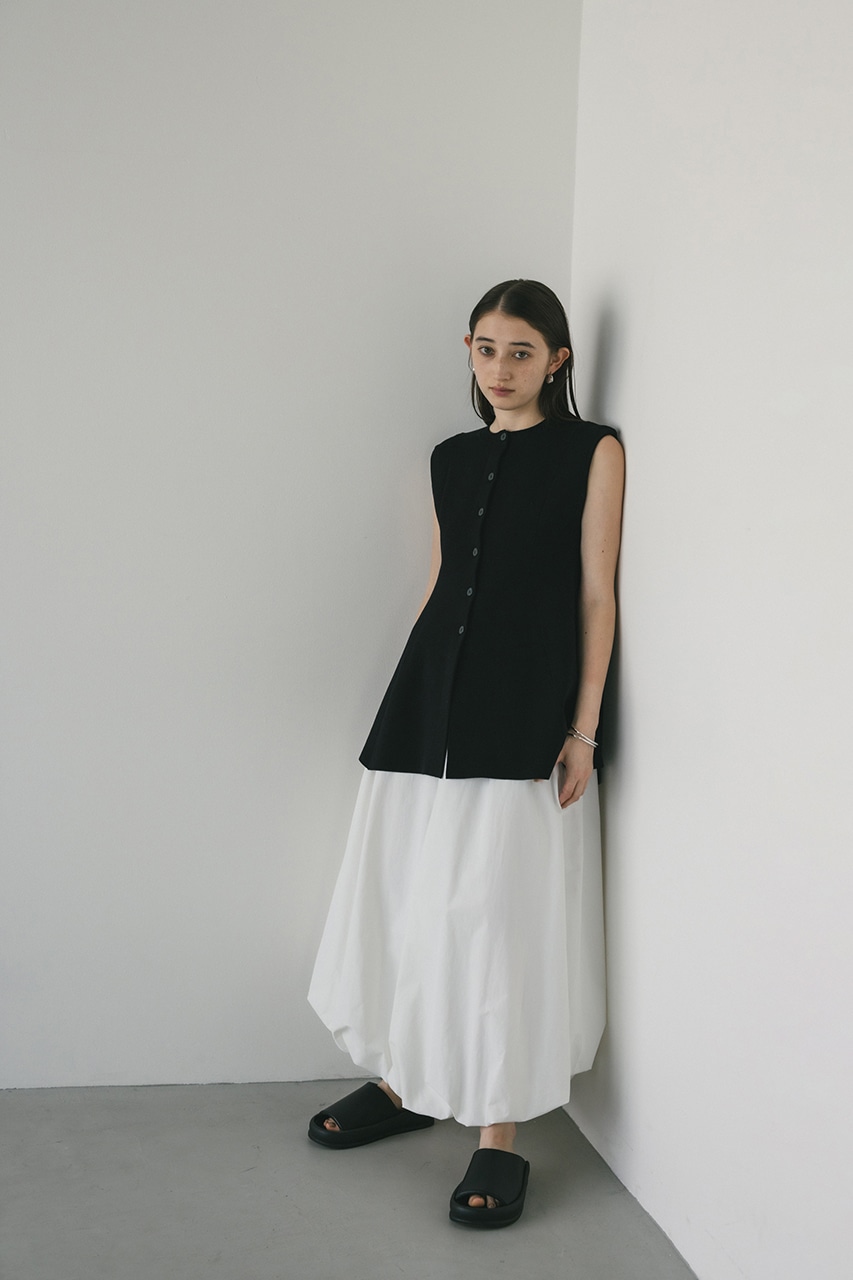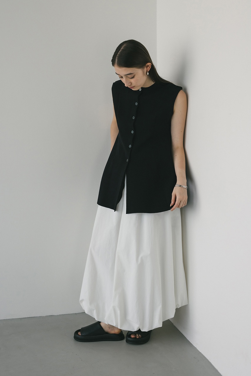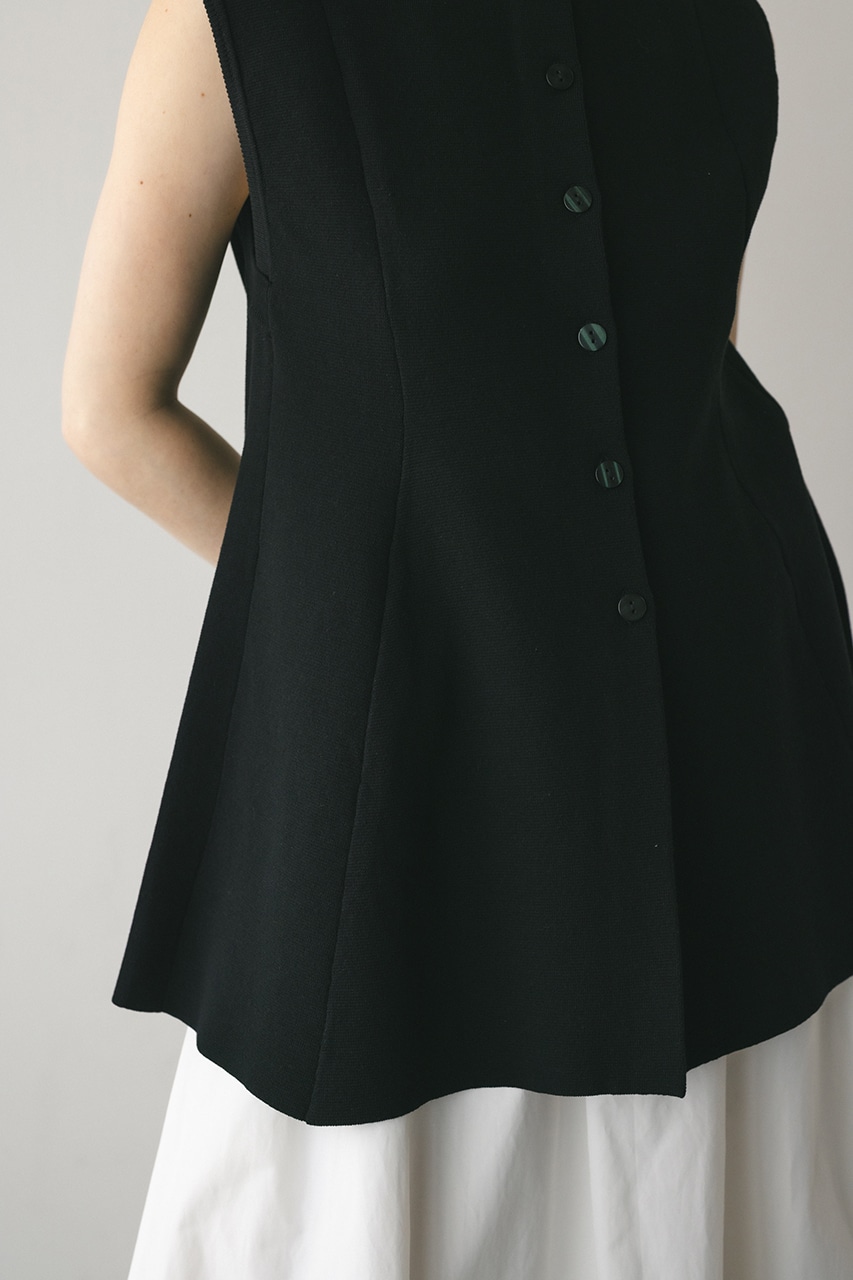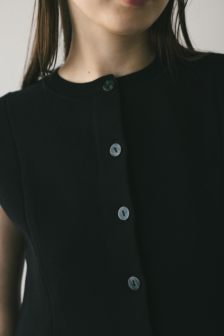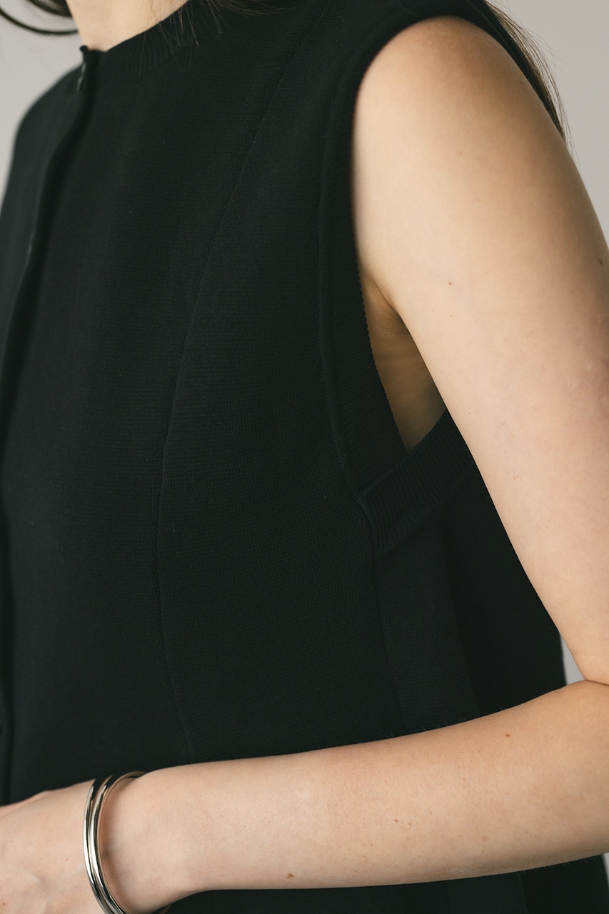 ドライなハイツイストコットンで編み立てたシルエットが可愛いニットベスト。身体のラインをすっきり見せるリンキングフレアとモードなショルダータックデティールがポイントです。透け感なし、ストレッチあり。