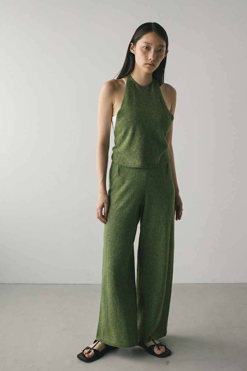 柔らかく肌なじみの良いパイルニットで仕上げたパンツ。脇接ぎ、ベルト切り替えをなくし、タックを施しているのでスタイルアップが叶います。ウエストゴムとインナー紐で調整可能。500IAS70-1611(ホルターパイルニットトップ)とセットアップ着用可能。透け感なし、ストレッチあり。