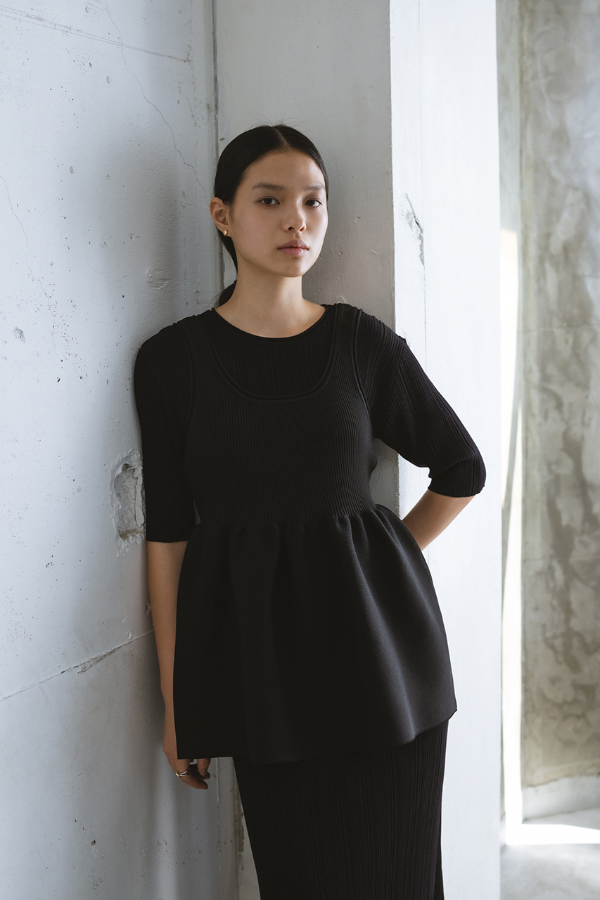 しなやかで肌馴染みの良い糸で編み立てたニットワンピースとフォルムのしっかり出る素材で編み立てたペプラムベストのセットアイテム。ルーズなサイジングでリラックス感がありながらも縦に落ちるリブ編みが身体のラインを綺麗に見せてくれます。ワンピースは前後2WAYで着用可能。ペプラムベストはバックを大きくあけ、たっぷり裾が映える一枚です。透け感なし、ストレッチあり。