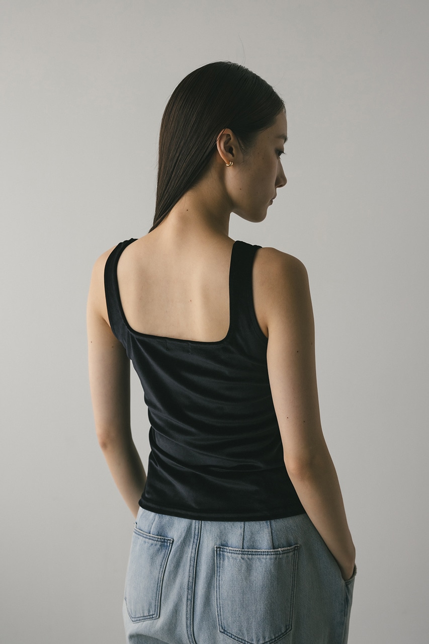 上品な光沢感とデザインにこだわったベロアスクエアタンク。滑らかな肌触りとストレッチで身体に馴染む一枚です。シャツやジャケットのインナーにもよく映え、Tシャツやニットにビスチェのようにレイヤードするのもおすすめです。透け感なし、ストレッチあり。