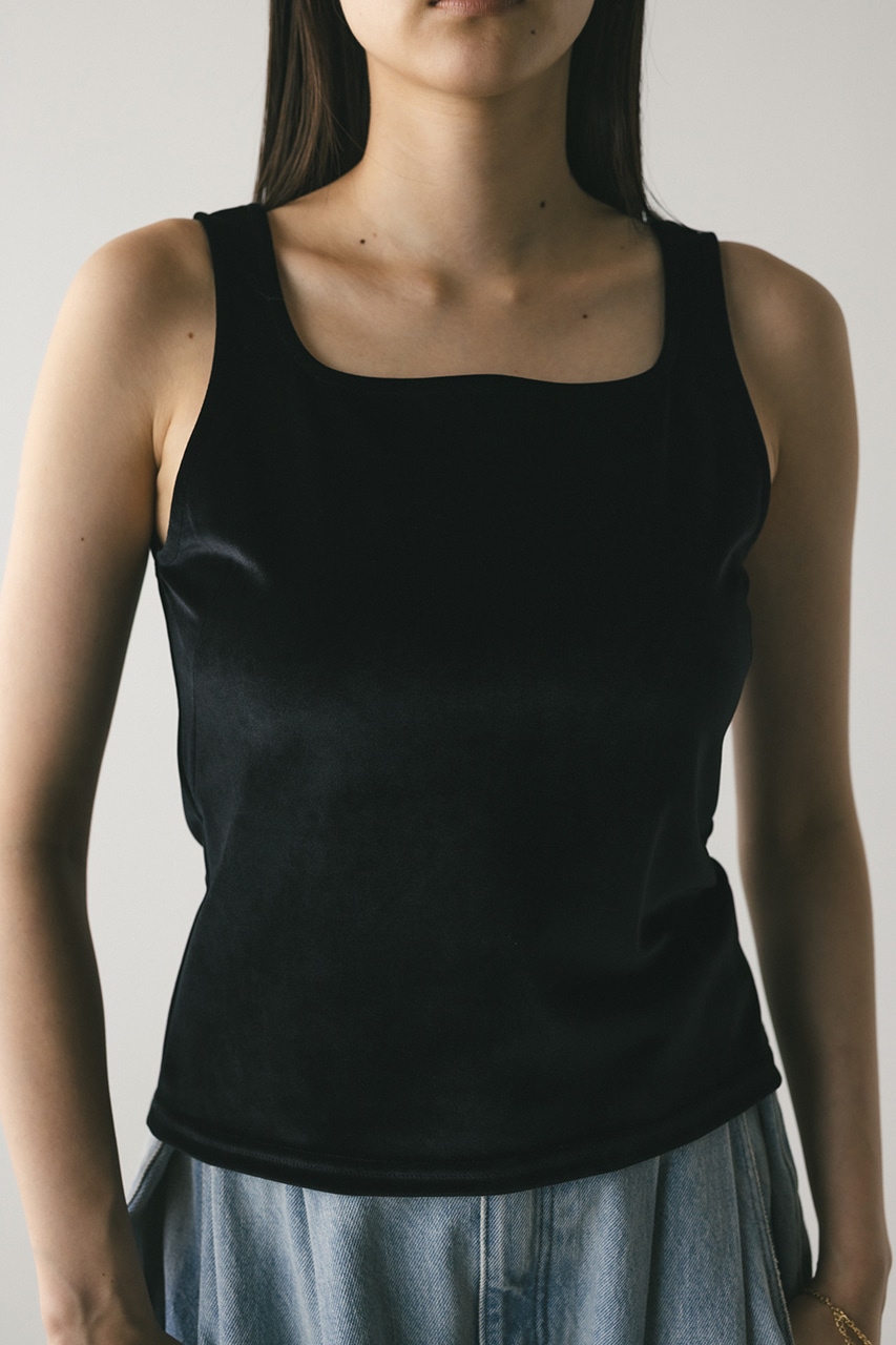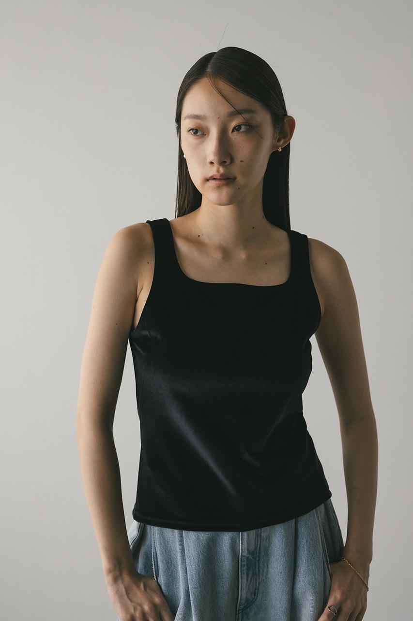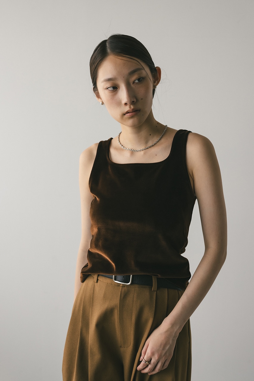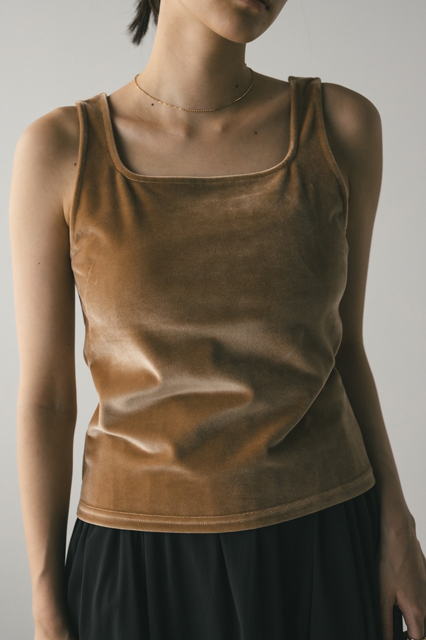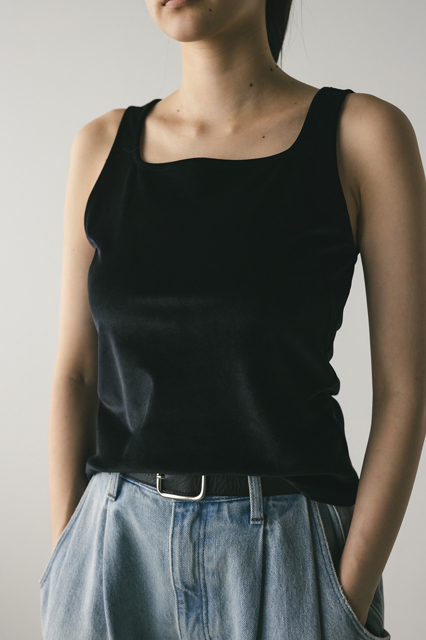 上品な光沢感とデザインにこだわったベロアスクエアタンク。滑らかな肌触りとストレッチで身体に馴染む一枚です。シャツやジャケットのインナーにもよく映え、Tシャツやニットにビスチェのようにレイヤードするのもおすすめです。透け感なし、ストレッチあり。