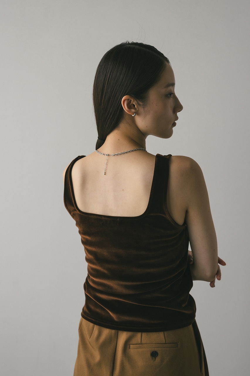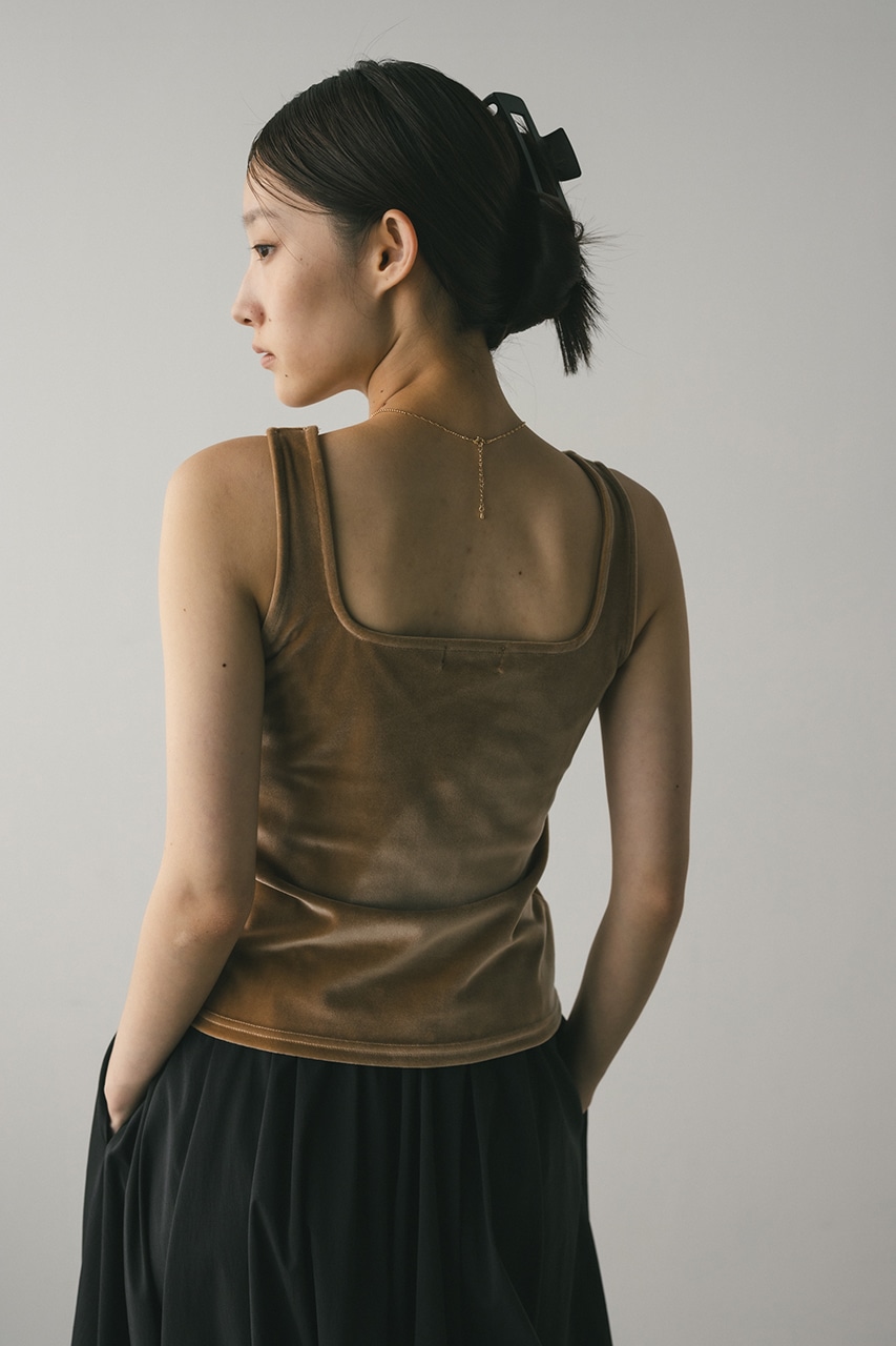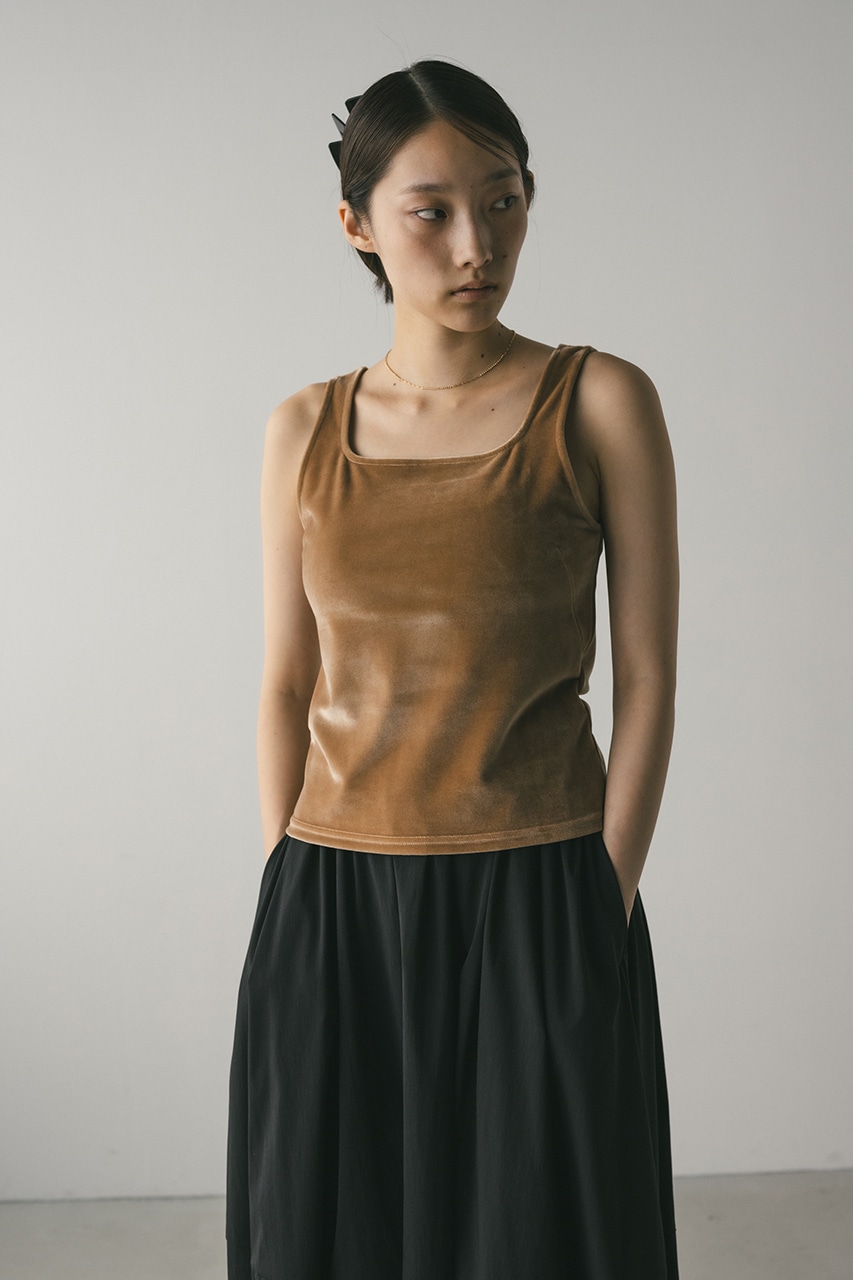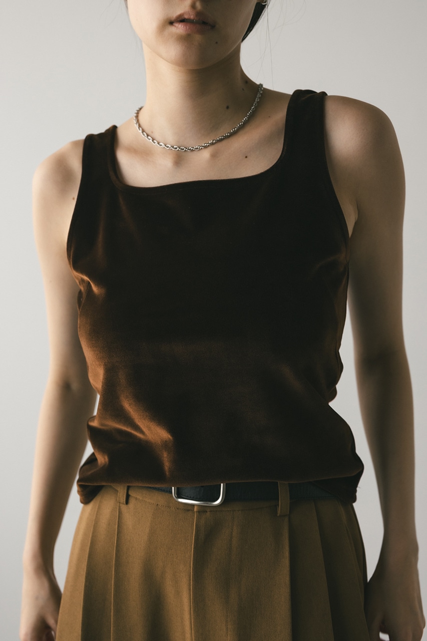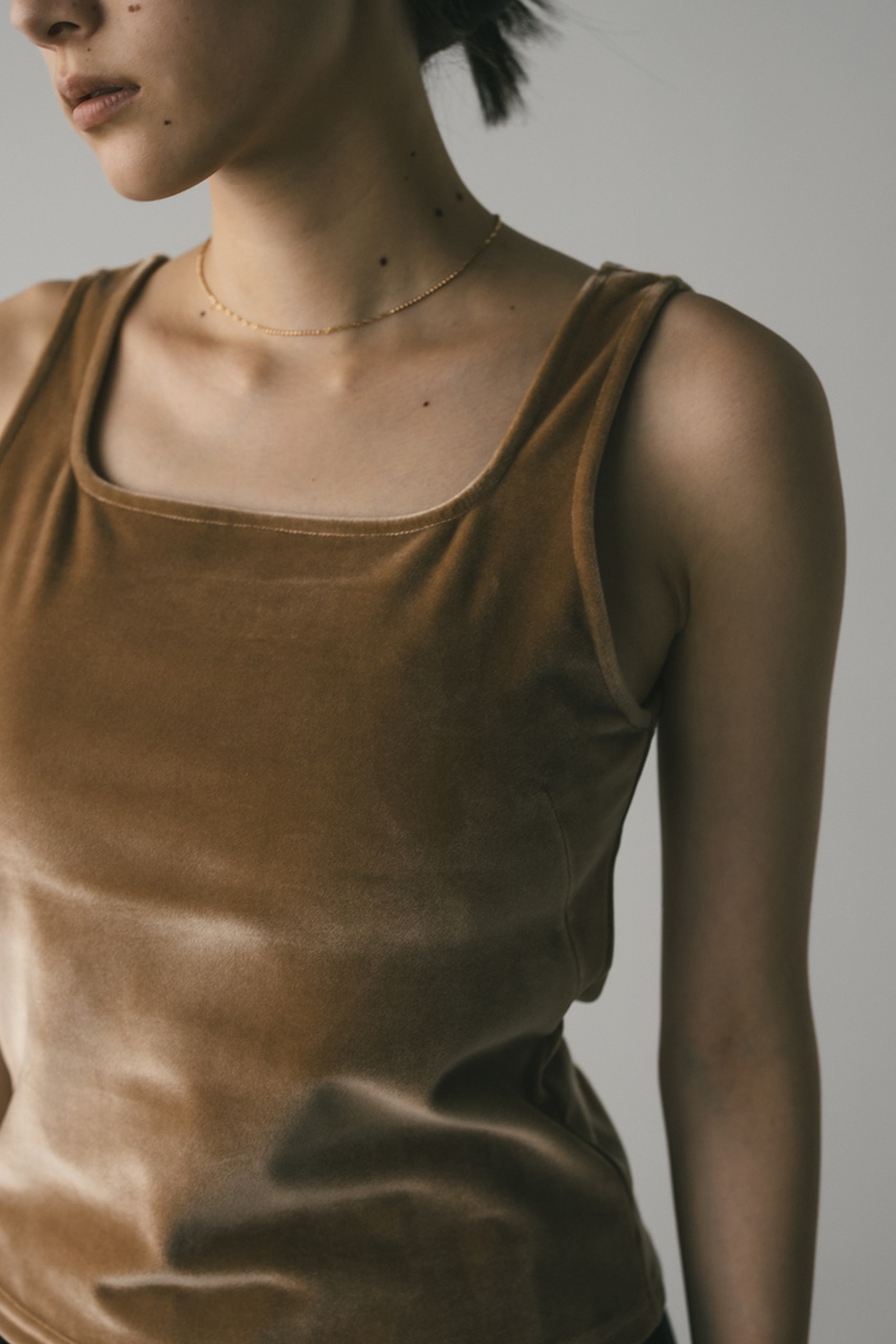 上品な光沢感とデザインにこだわったベロアスクエアタンク。滑らかな肌触りとストレッチで身体に馴染む一枚です。シャツやジャケットのインナーにもよく映え、Tシャツやニットにビスチェのようにレイヤードするのもおすすめです。透け感なし、ストレッチあり。