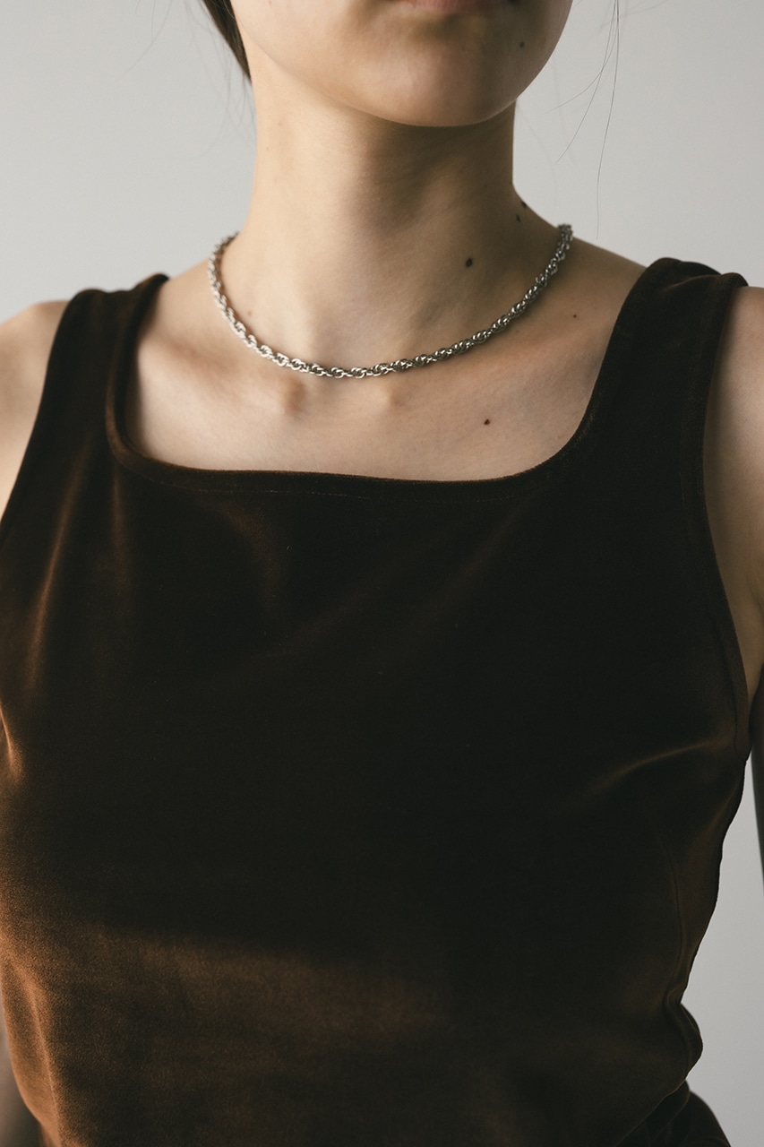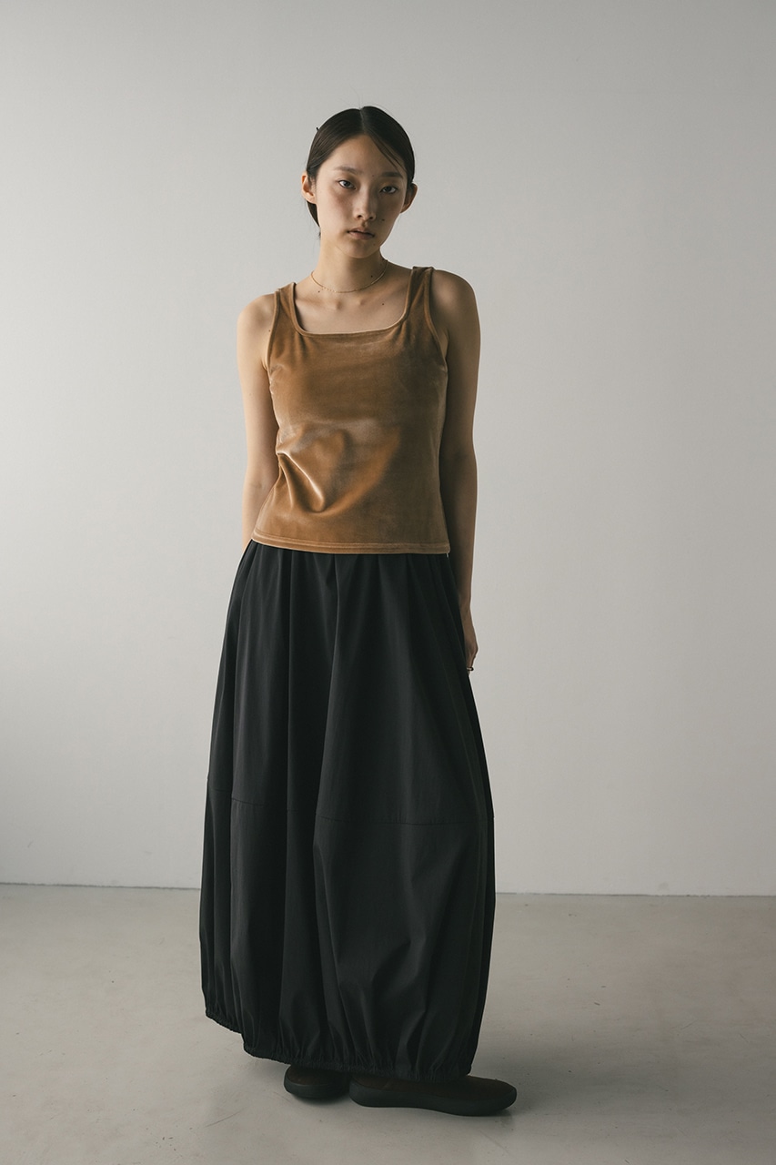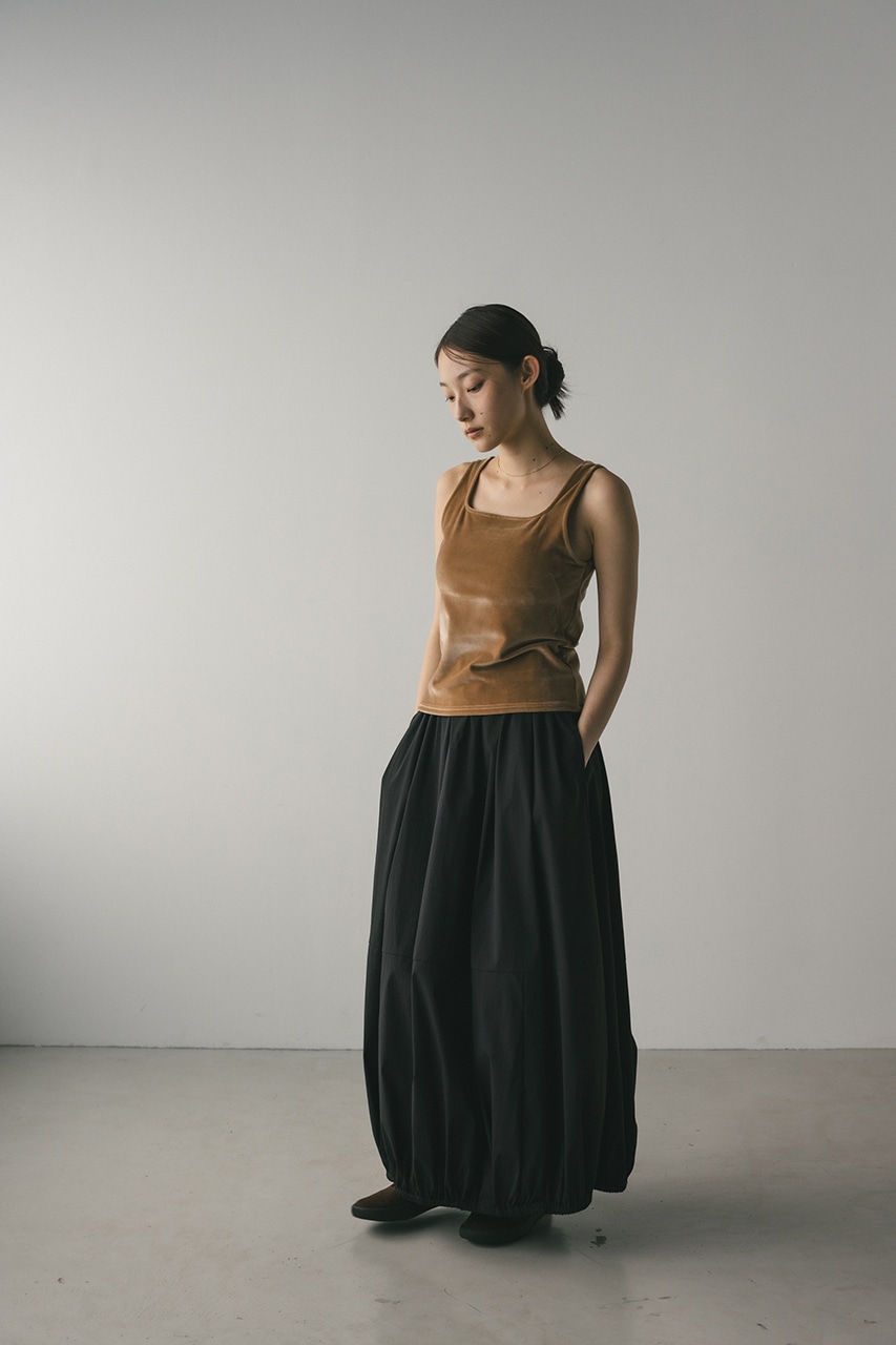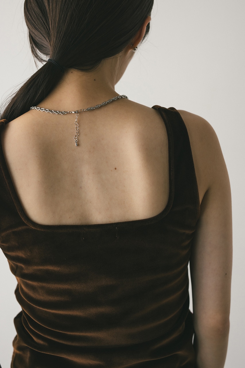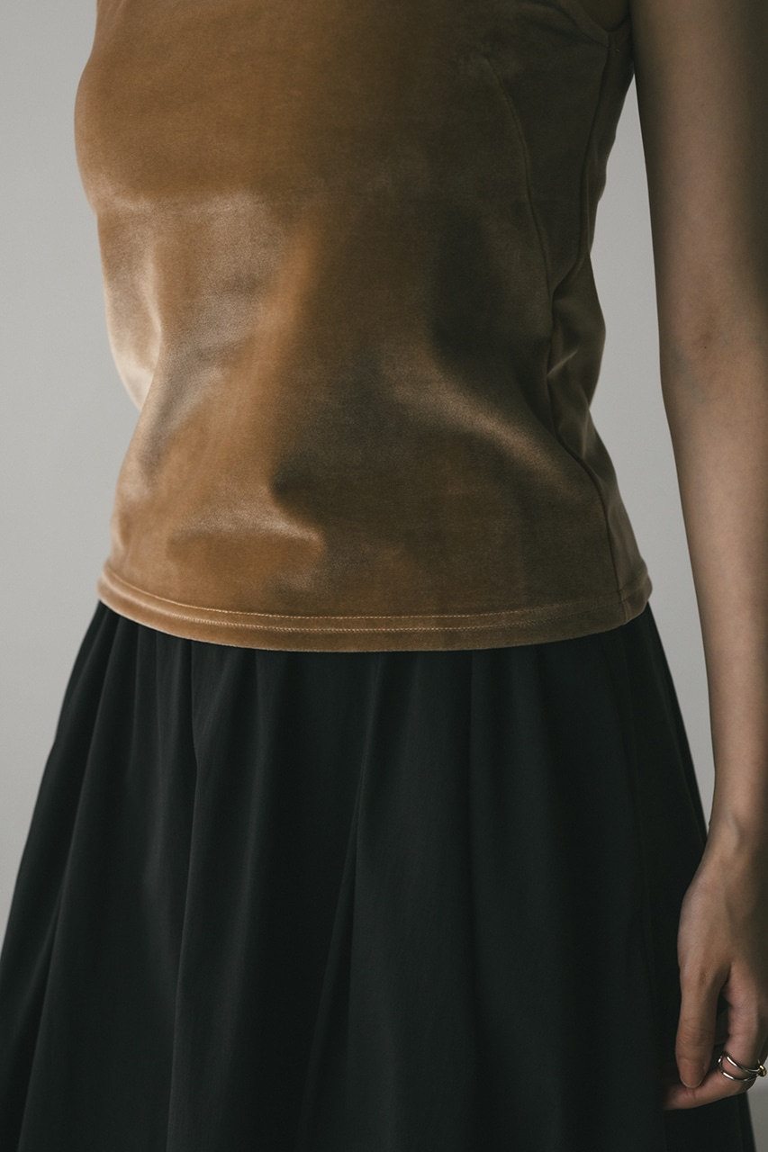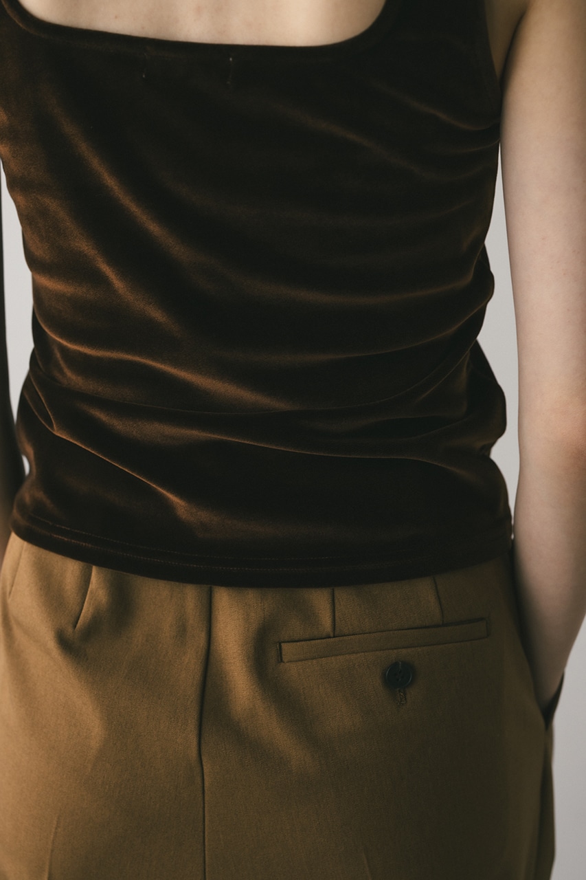 上品な光沢感とデザインにこだわったベロアスクエアタンク。滑らかな肌触りとストレッチで身体に馴染む一枚です。シャツやジャケットのインナーにもよく映え、Tシャツやニットにビスチェのようにレイヤードするのもおすすめです。透け感なし、ストレッチあり。