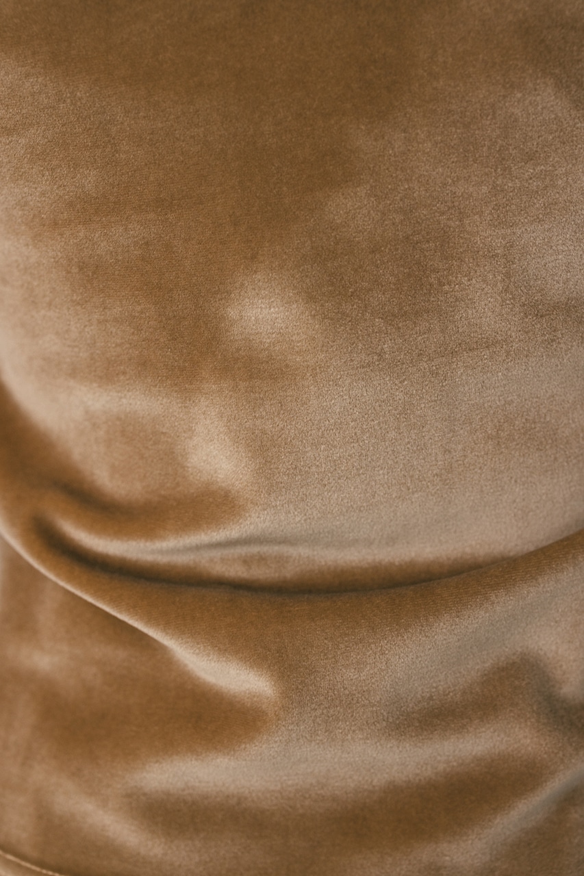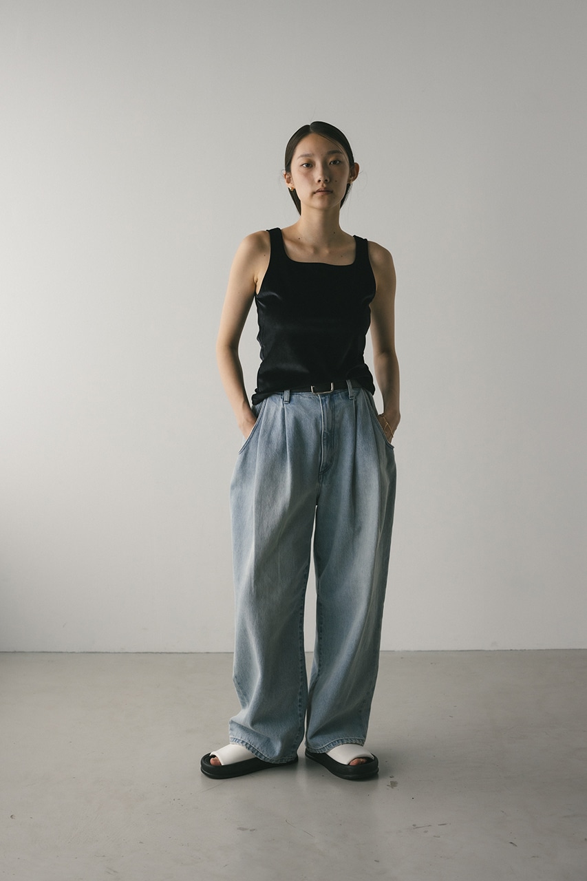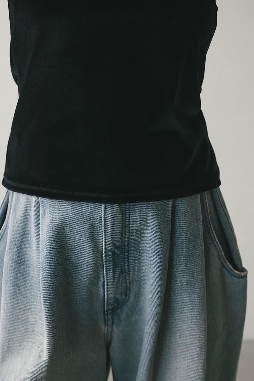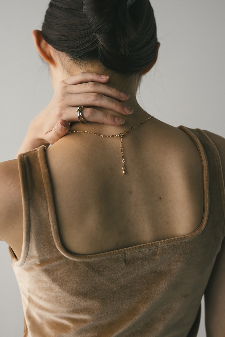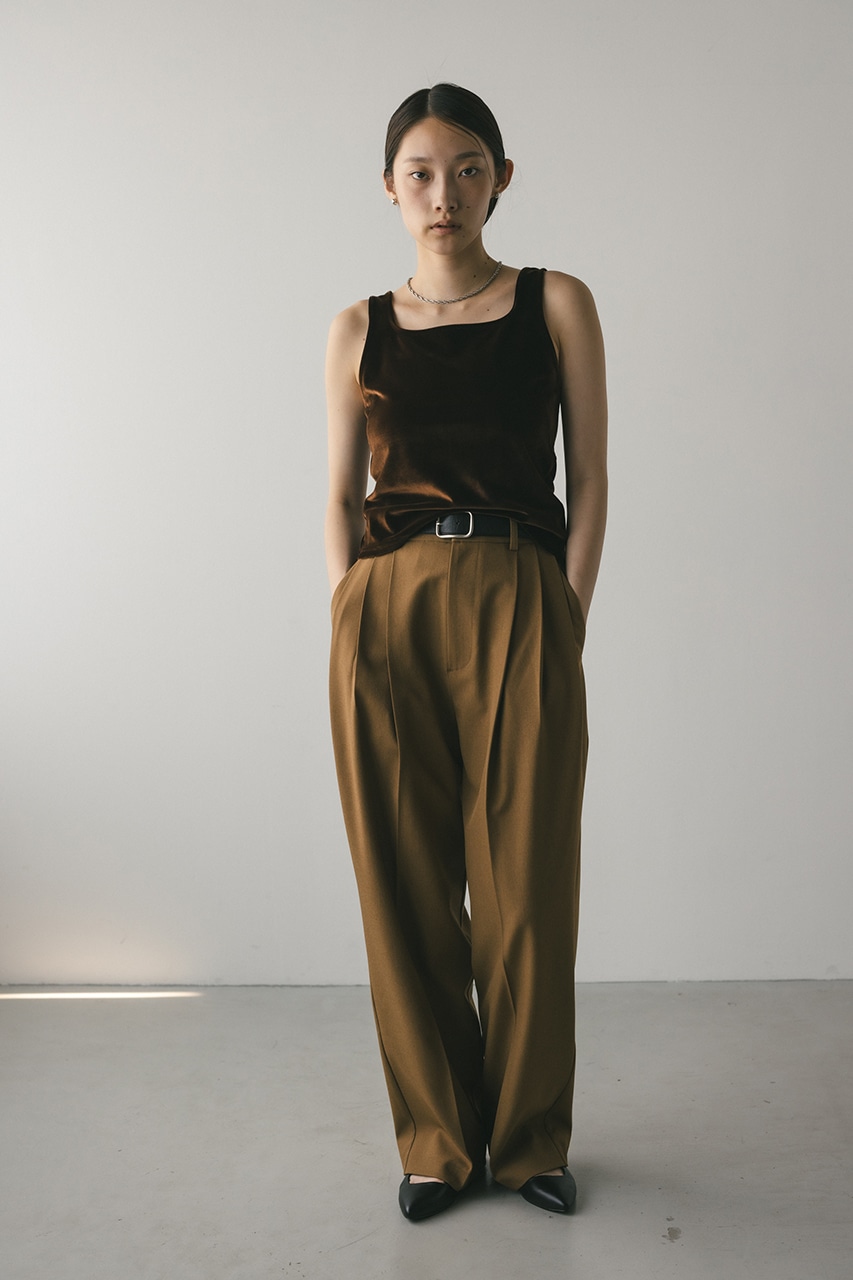 上品な光沢感とデザインにこだわったベロアスクエアタンク。滑らかな肌触りとストレッチで身体に馴染む一枚です。シャツやジャケットのインナーにもよく映え、Tシャツやニットにビスチェのようにレイヤードするのもおすすめです。透け感なし、ストレッチあり。