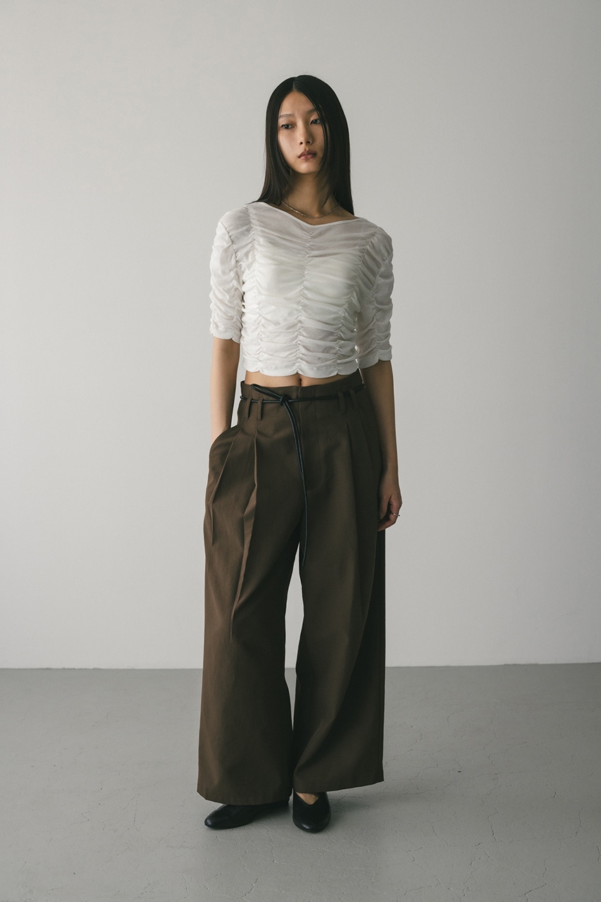 身体馴染みの良い軽いカットソー素材にシャーリング加工を施したTシャツ。華やかな立体感がポイント。着心地も良く、デイリー使いしやすい一枚です。透け感WHTややあり、ストレッチあり。