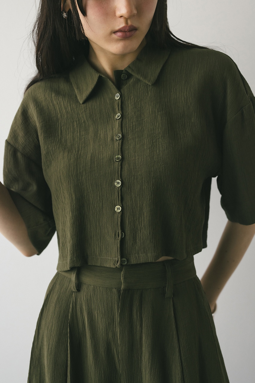 凹凸感のある表情が可愛い生地を使用したコンパクトシャツ。ドライでさらりとした質感なので着心地も良く、リラックスして着用頂けます。バランスのとりやすい丈感とバックのカシュクールがスタイリングに抜け感をプラス。ダーツをとったバックヘムデザインで身体を華奢に見せてくれます。500IAT31-0201(ワッシャーツータックパンツ)とセットアップ着用可能。透け感ややあり、ストレッチなし。