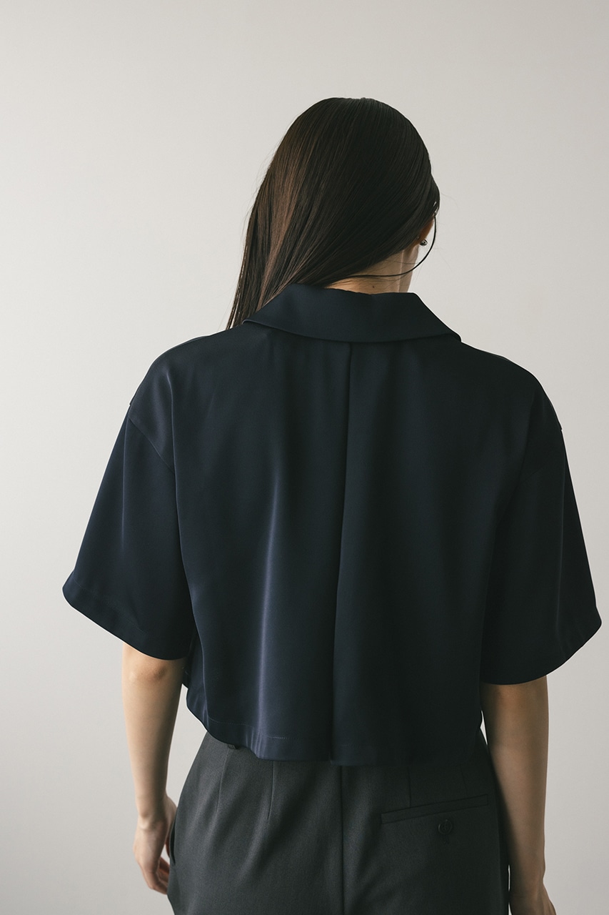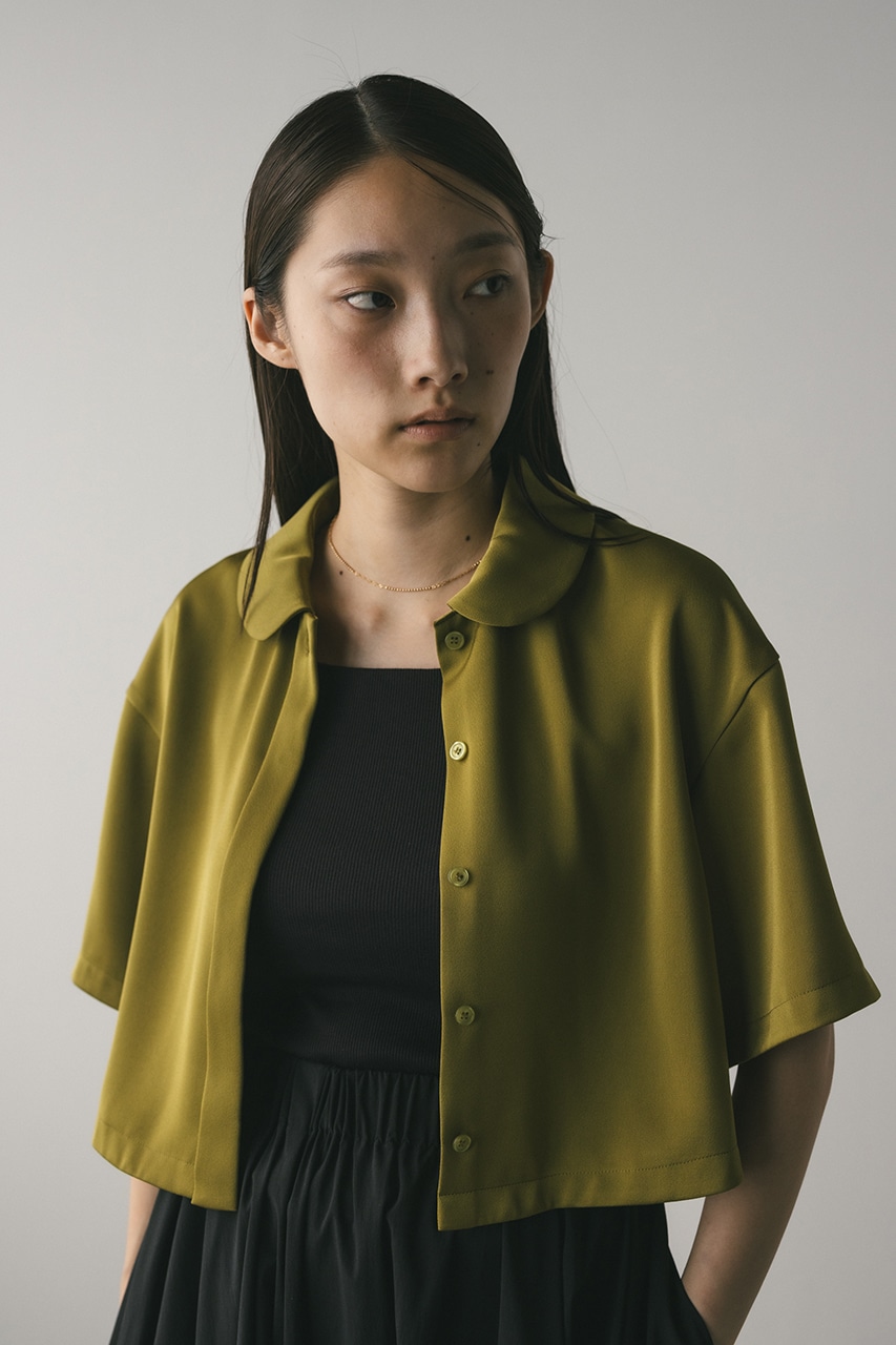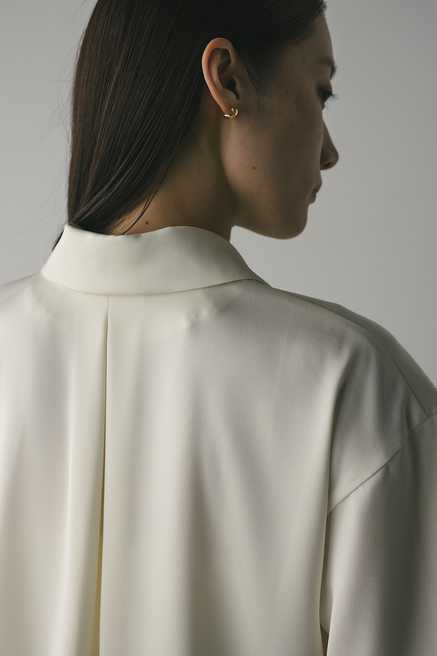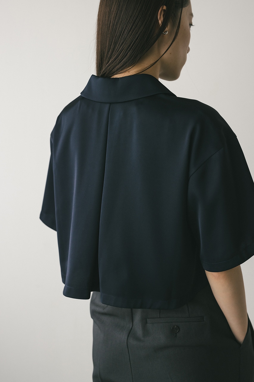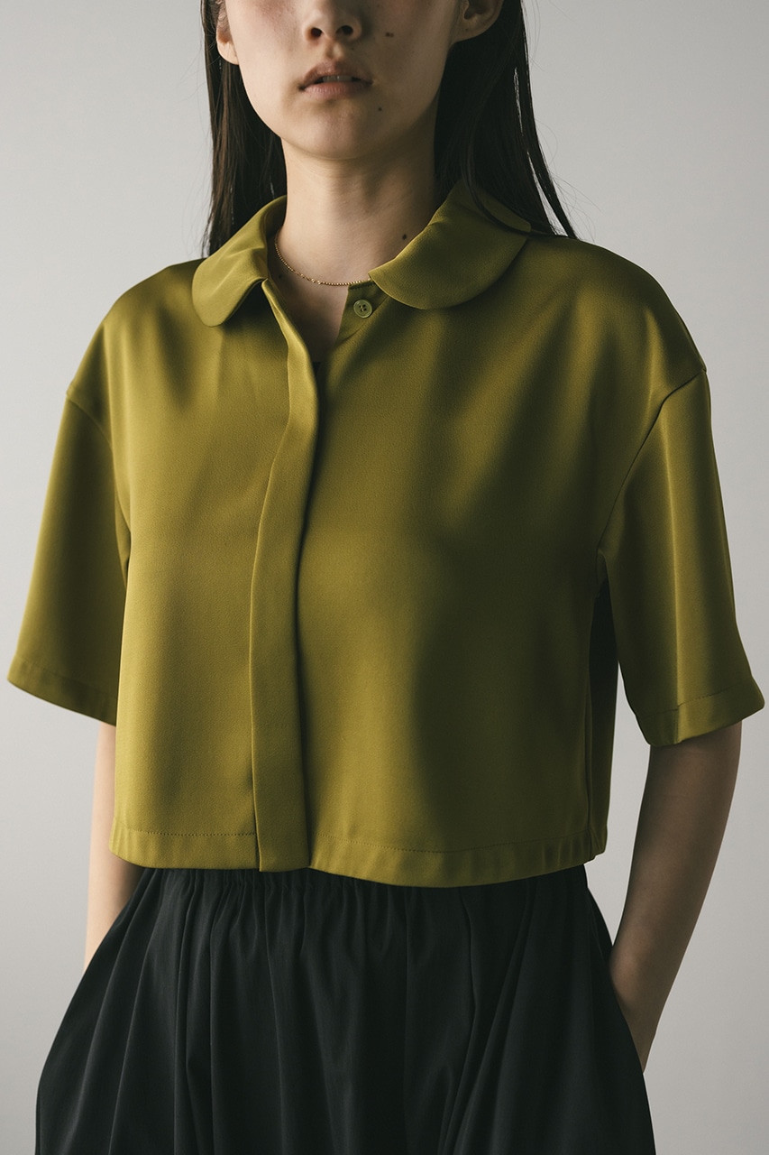 上品な印象のなめらかなサテン生地を使用したショートシャツ。サークルカラーがデザインポイントで、顔回りを和らげて女性らしく見せてくれます。コンパクトなシルエットでバックにはボックスタックを入れた動きのあるシルエットに仕上げた一枚。しわになりにくく扱いやすいのも魅力です。ストレッチなし、透け感なし。