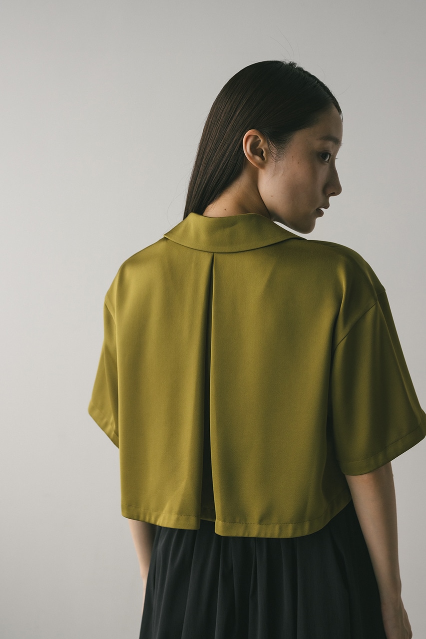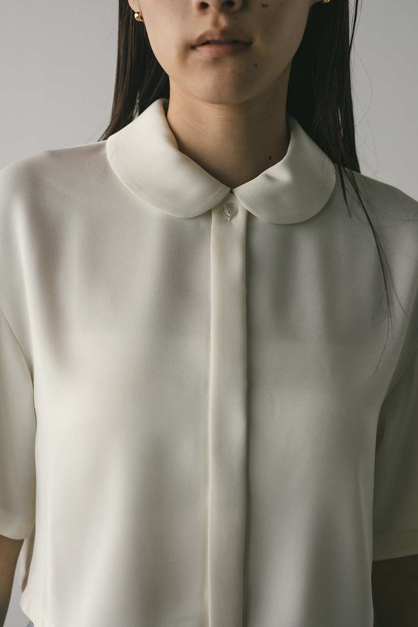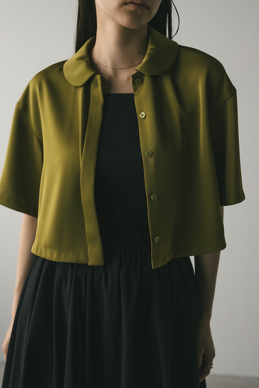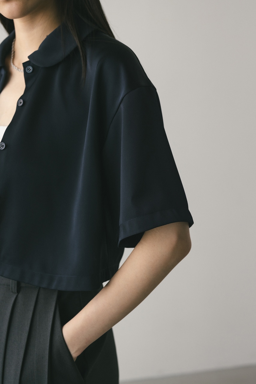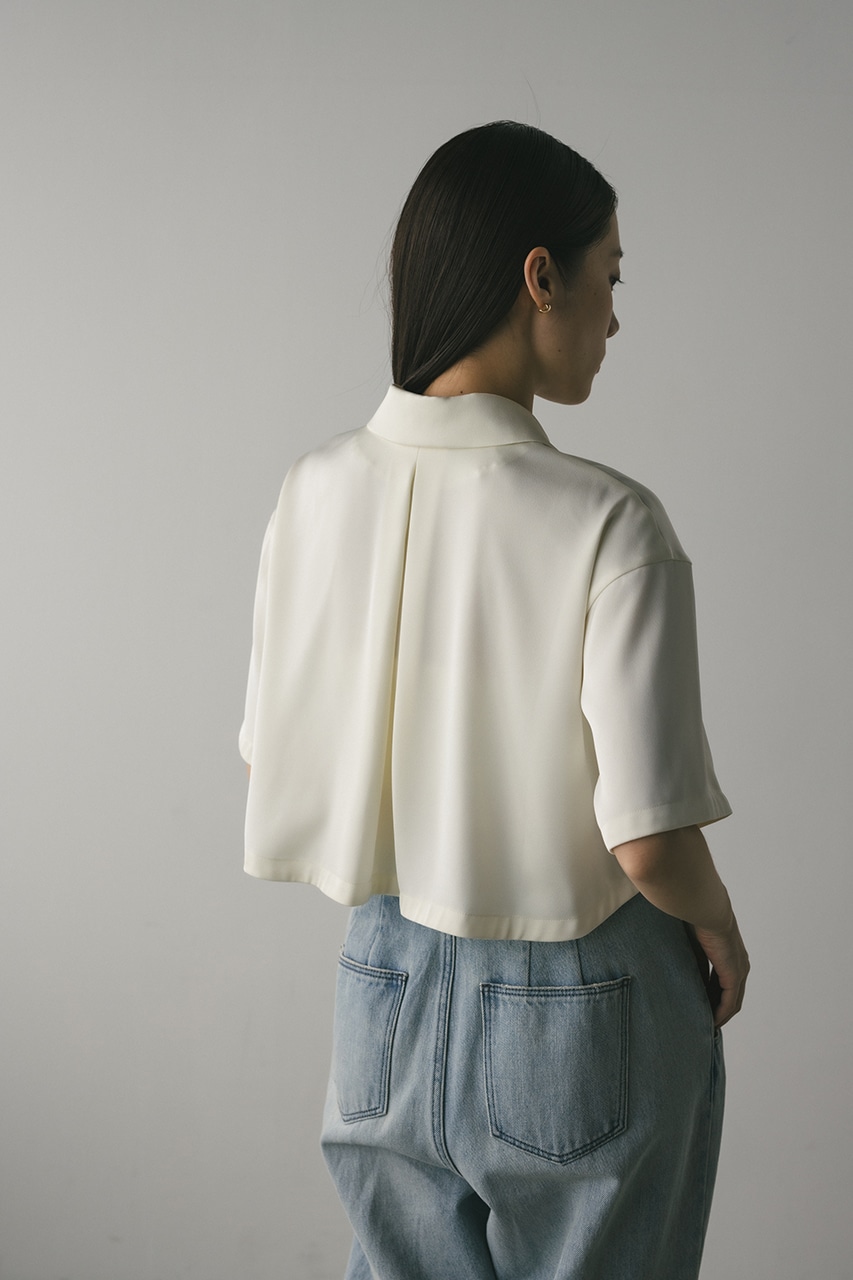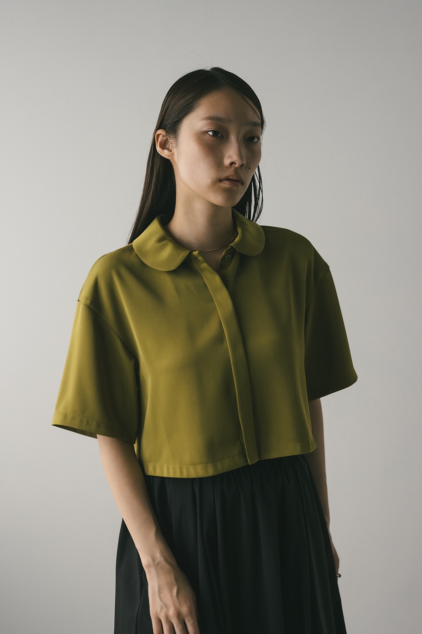 上品な印象のなめらかなサテン生地を使用したショートシャツ。サークルカラーがデザインポイントで、顔回りを和らげて女性らしく見せてくれます。コンパクトなシルエットでバックにはボックスタックを入れた動きのあるシルエットに仕上げた一枚。しわになりにくく扱いやすいのも魅力です。ストレッチなし、透け感なし。
