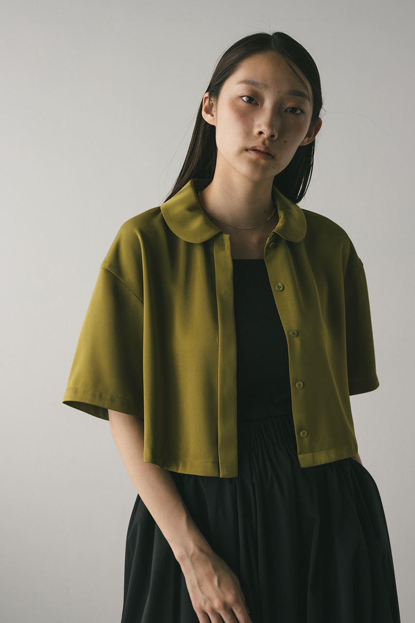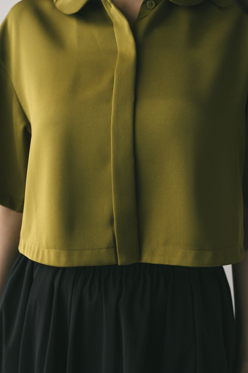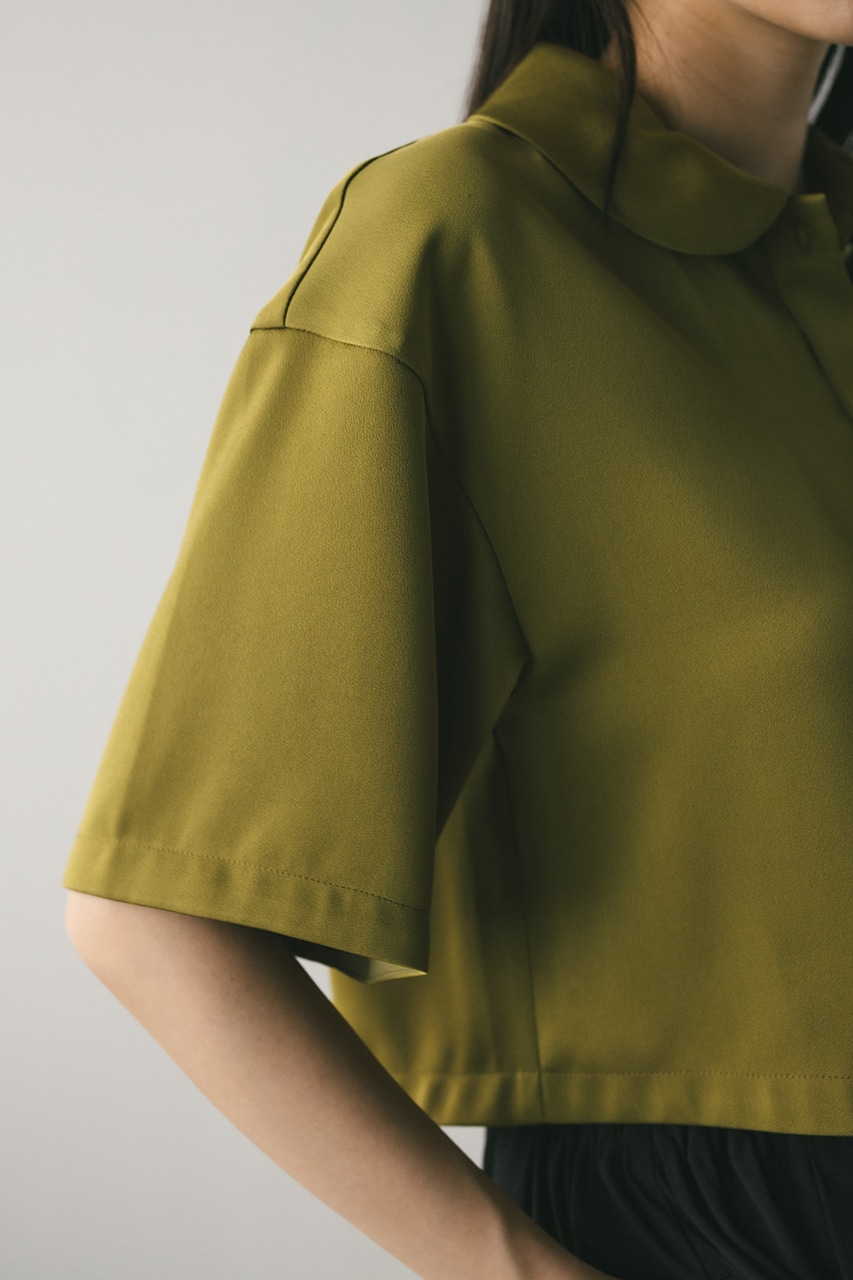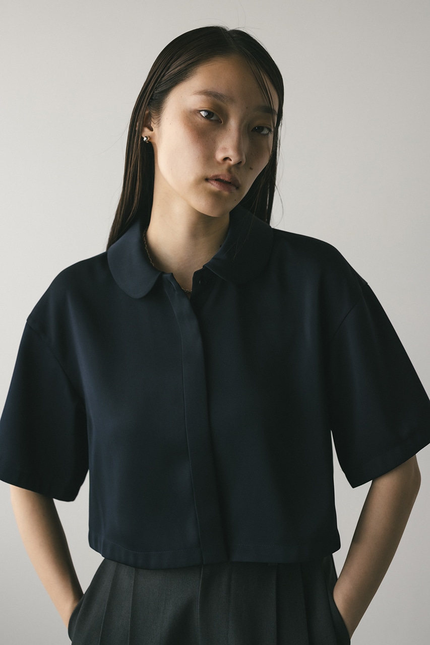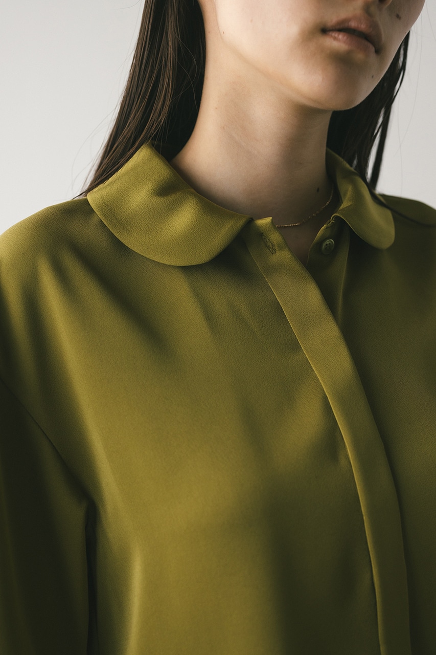 上品な印象のなめらかなサテン生地を使用したショートシャツ。サークルカラーがデザインポイントで、顔回りを和らげて女性らしく見せてくれます。コンパクトなシルエットでバックにはボックスタックを入れた動きのあるシルエットに仕上げた一枚。しわになりにくく扱いやすいのも魅力です。ストレッチなし、透け感なし。