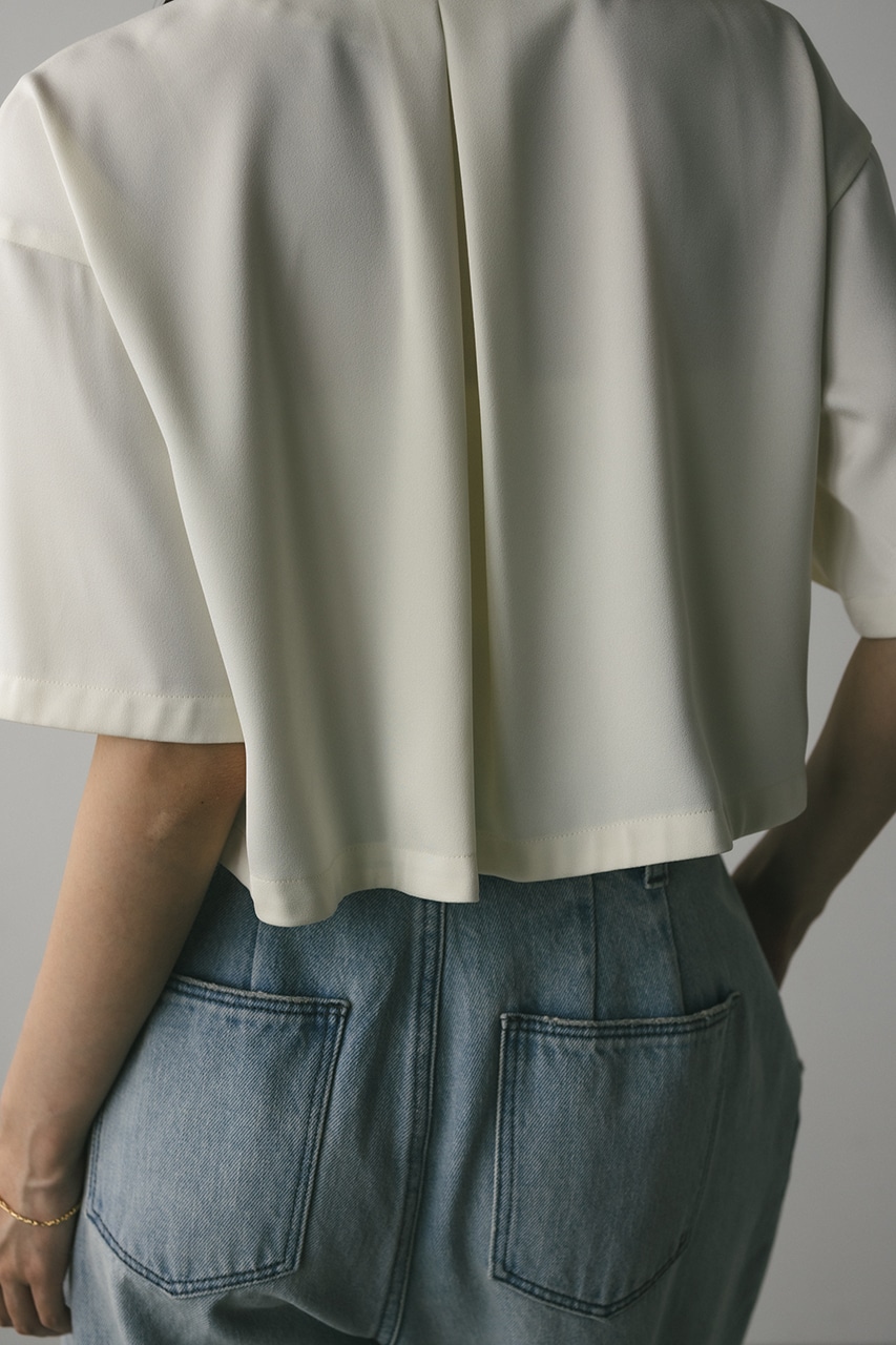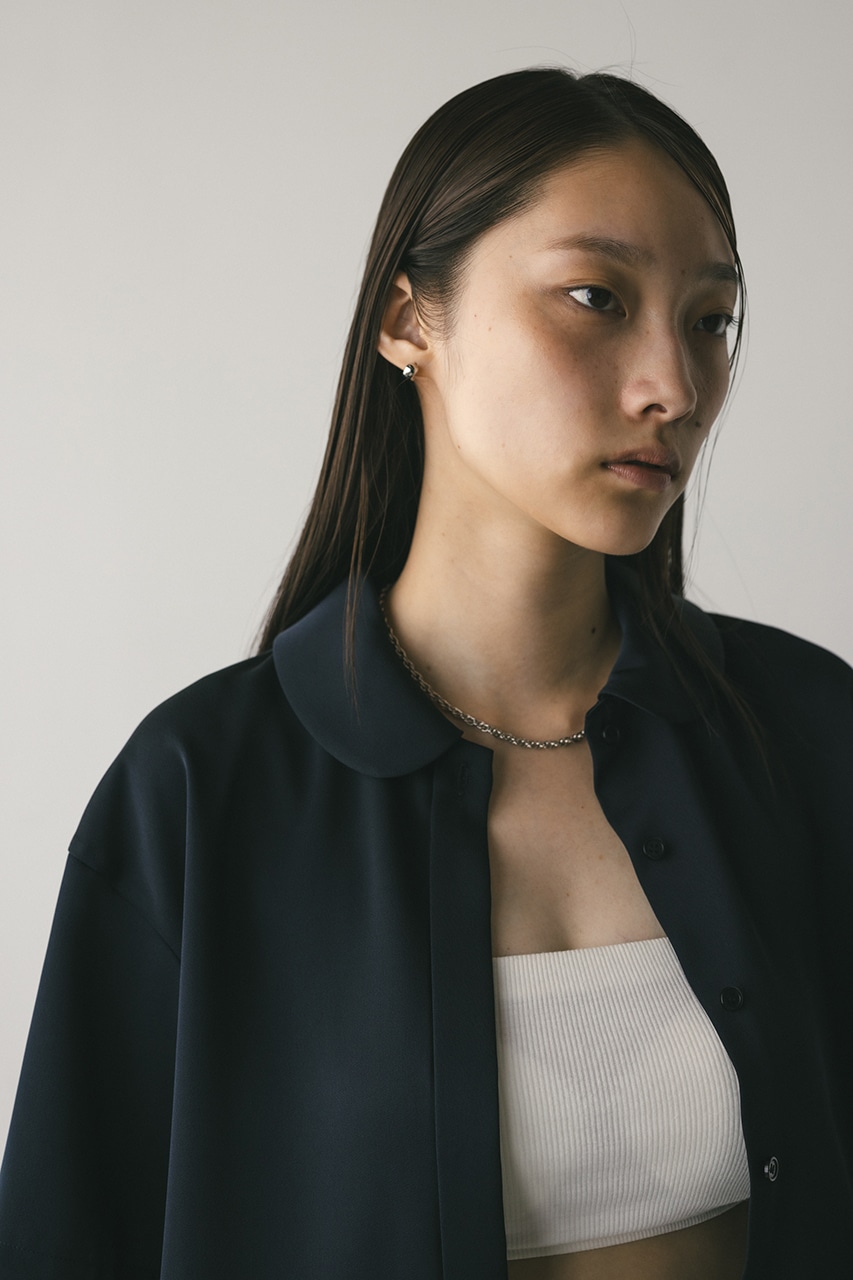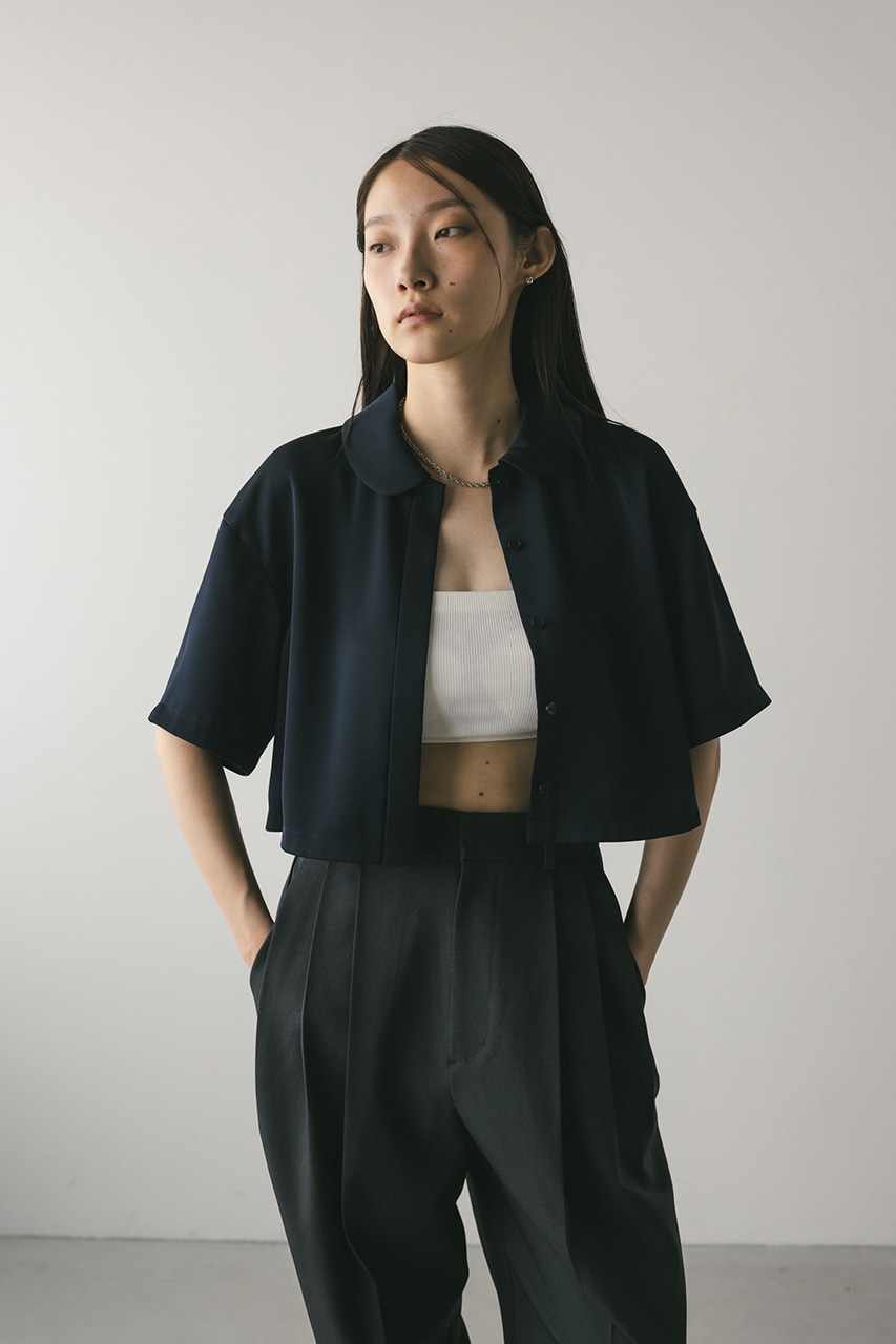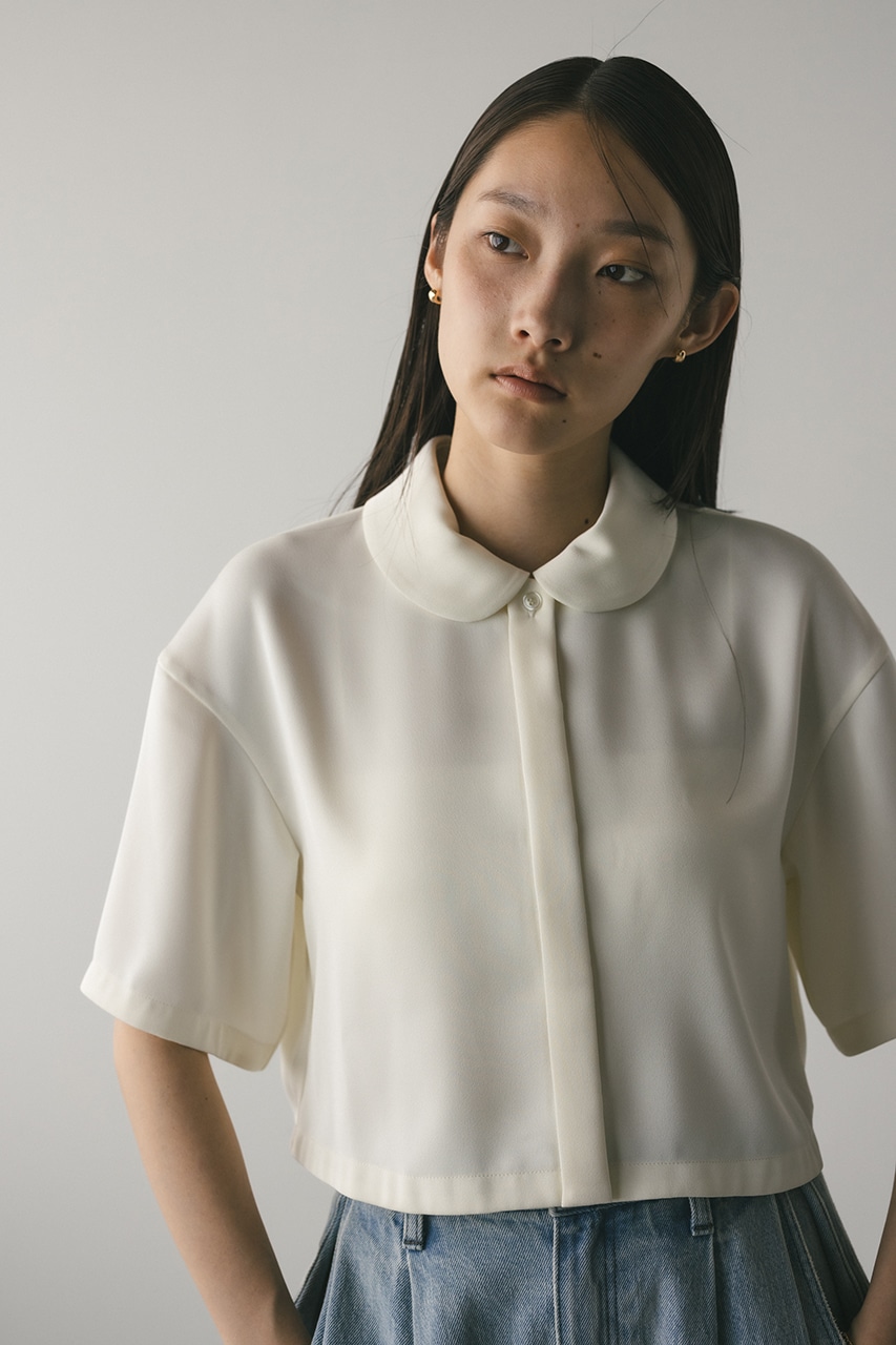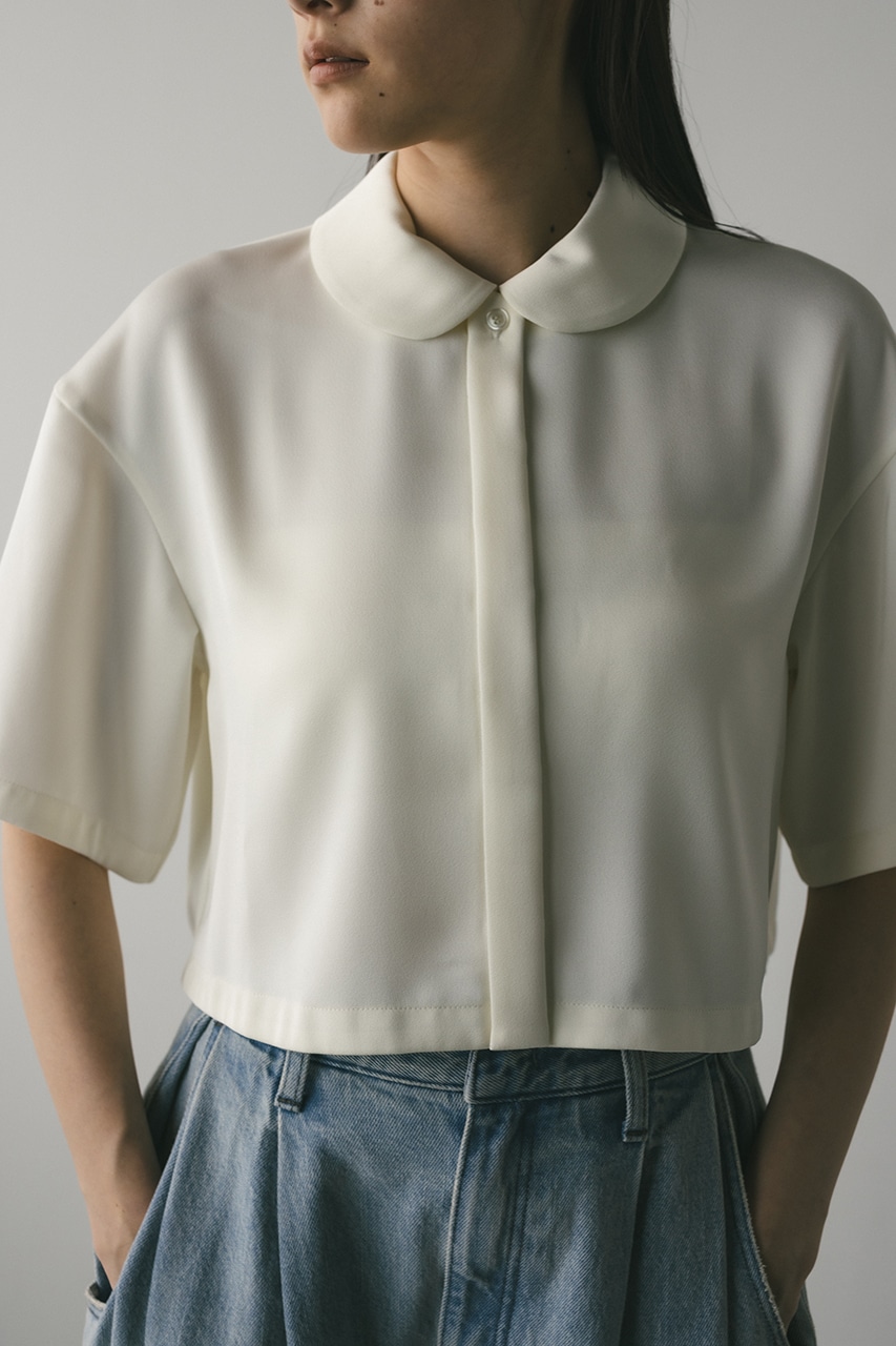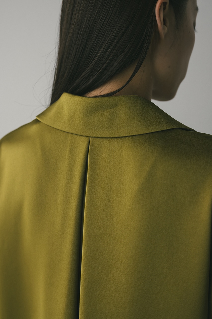 上品な印象のなめらかなサテン生地を使用したショートシャツ。サークルカラーがデザインポイントで、顔回りを和らげて女性らしく見せてくれます。コンパクトなシルエットでバックにはボックスタックを入れた動きのあるシルエットに仕上げた一枚。しわになりにくく扱いやすいのも魅力です。ストレッチなし、透け感なし。