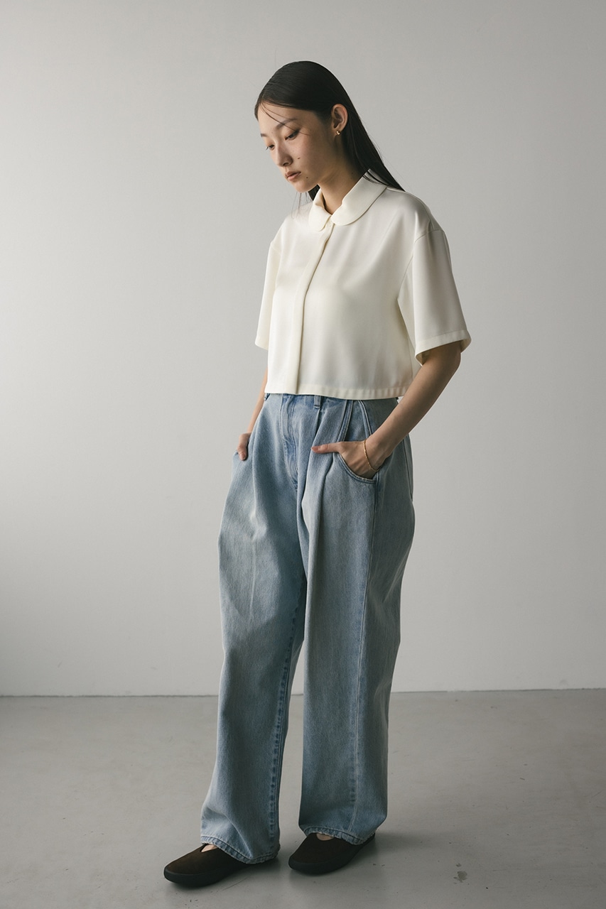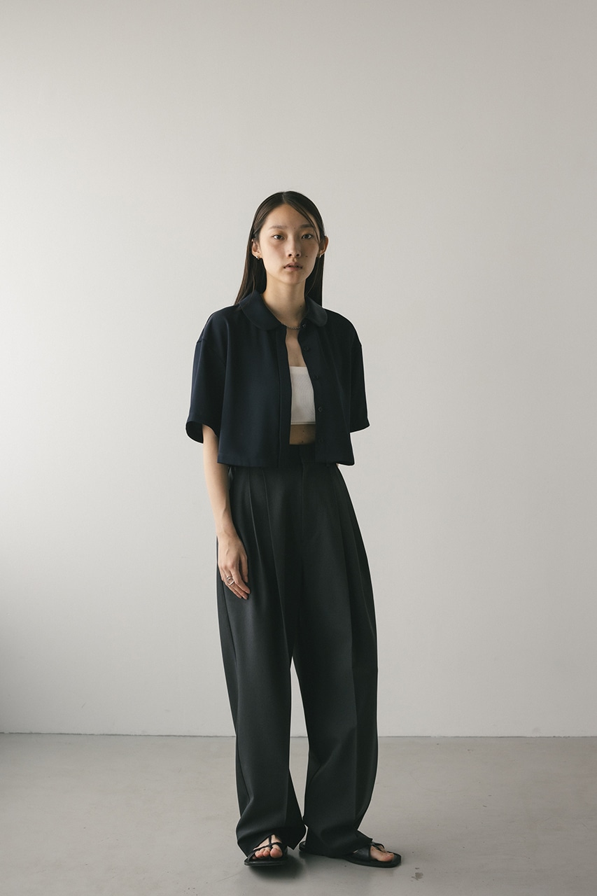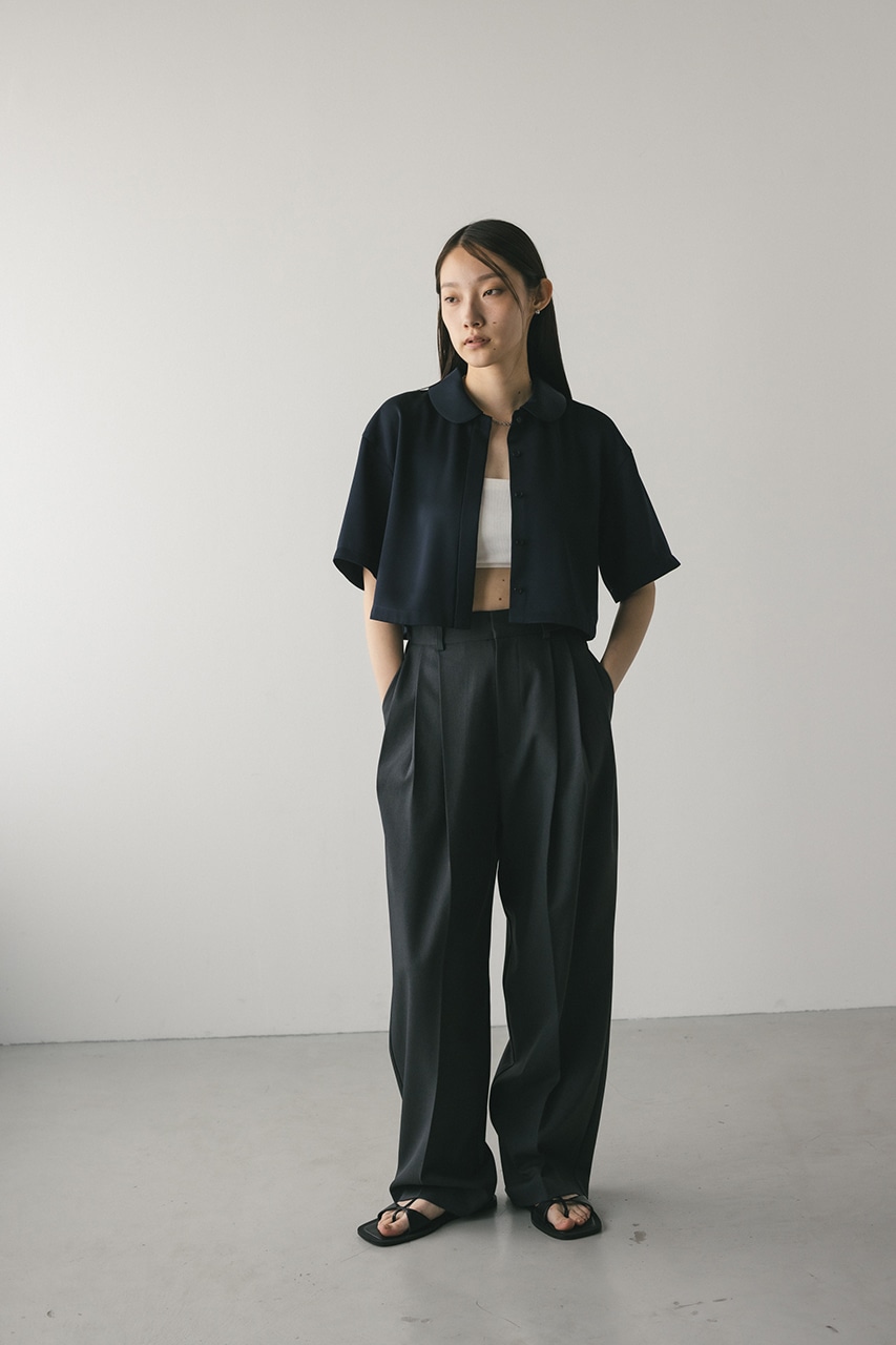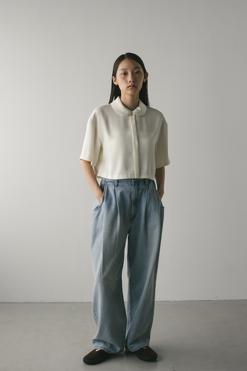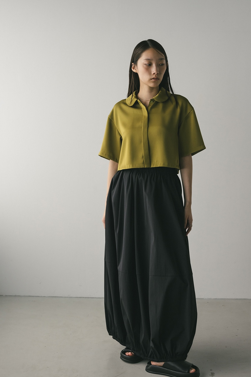 上品な印象のなめらかなサテン生地を使用したショートシャツ。サークルカラーがデザインポイントで、顔回りを和らげて女性らしく見せてくれます。コンパクトなシルエットでバックにはボックスタックを入れた動きのあるシルエットに仕上げた一枚。しわになりにくく扱いやすいのも魅力です。ストレッチなし、透け感なし。