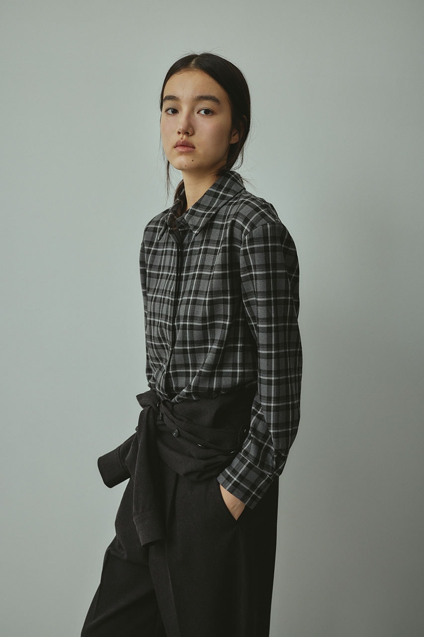 大人なチェック柄が可愛いコンパクトシルエットのシャツ。ウエストをしっかりと絞ったコンシャスなシルエットでカジュアルになりすぎない印象に仕上げています。肩パットを入れたパワーショルダーでモードなエッセンスをプラス。後ろの紐は垂らし手の着用、結んでの着用とスタイリングに合わせて調整頂けます。ストレッチなし、透け感なし。