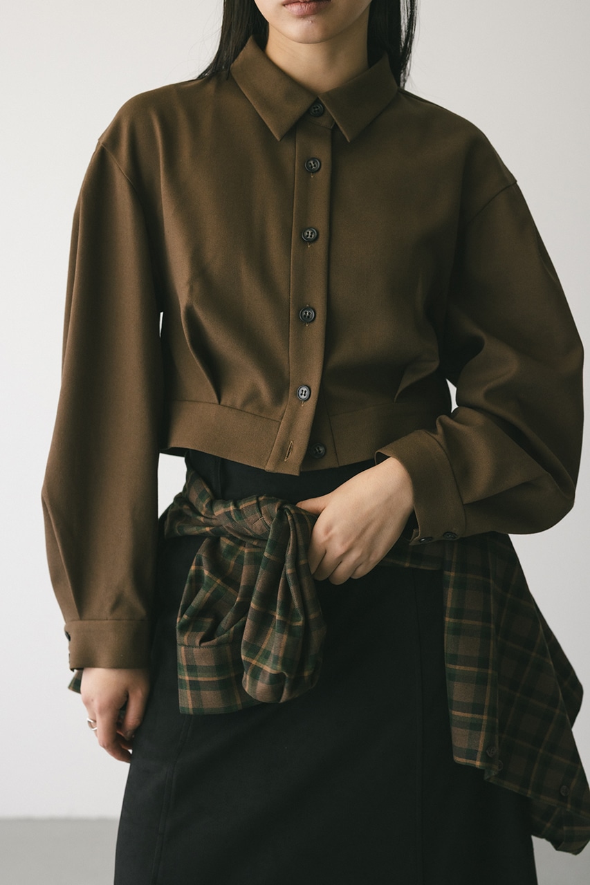 色を混ぜて作られた独特のカラーリングが可愛いメランジ生地を使用したショートシャツ。単色では出せない味わい深い色合いが魅力でこなれ感を演出し、上品な印象に導きます。前後共にタックディテールを施したスタミキらしい立体感のあるシルエットがデザインポイント。ドロップショルダーで肩の抜け感もありつつ、袖のカフスできちんと感も演出。前後差のある丈感でスタイルアップが叶います。500IAT31-0711(メランジタックワイドパンツ)とセットアップ着用可能。ストレッチなし、透け感なし。