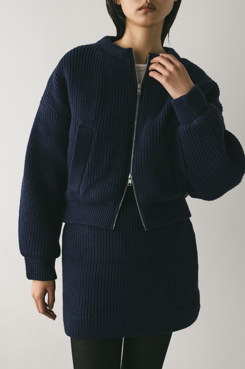 中綿ジャケットを暖か味のあるニット素材で編立てたニットパッファーブルゾン。ふっくらとした風合いの糸を使用し、方畦編みで編み立てる事で独特の立体感と高級感のでる編地に仕上げました。ボリューム感のあるシルエットと丸みのある袖のシルエットがデザインポイント。両開ジップ仕様。500IAT31-0961(ニットパッファーミニスカート)とセットアップ着用可能。ストレットあり、透け感なし。